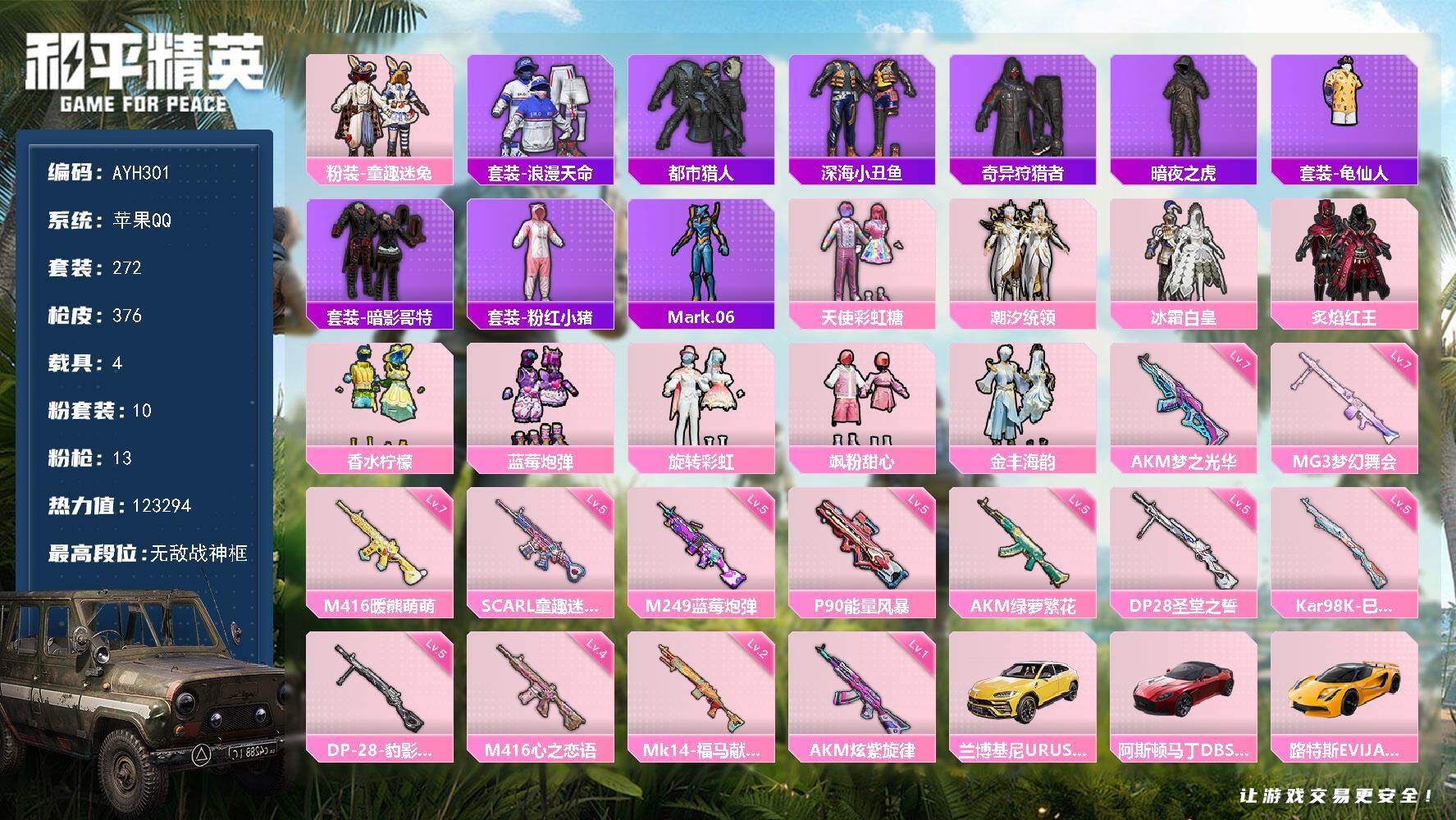 苹果 手Q-无敌战神框-10粉装-13特效枪-4载具-3粉色飞行器-12329