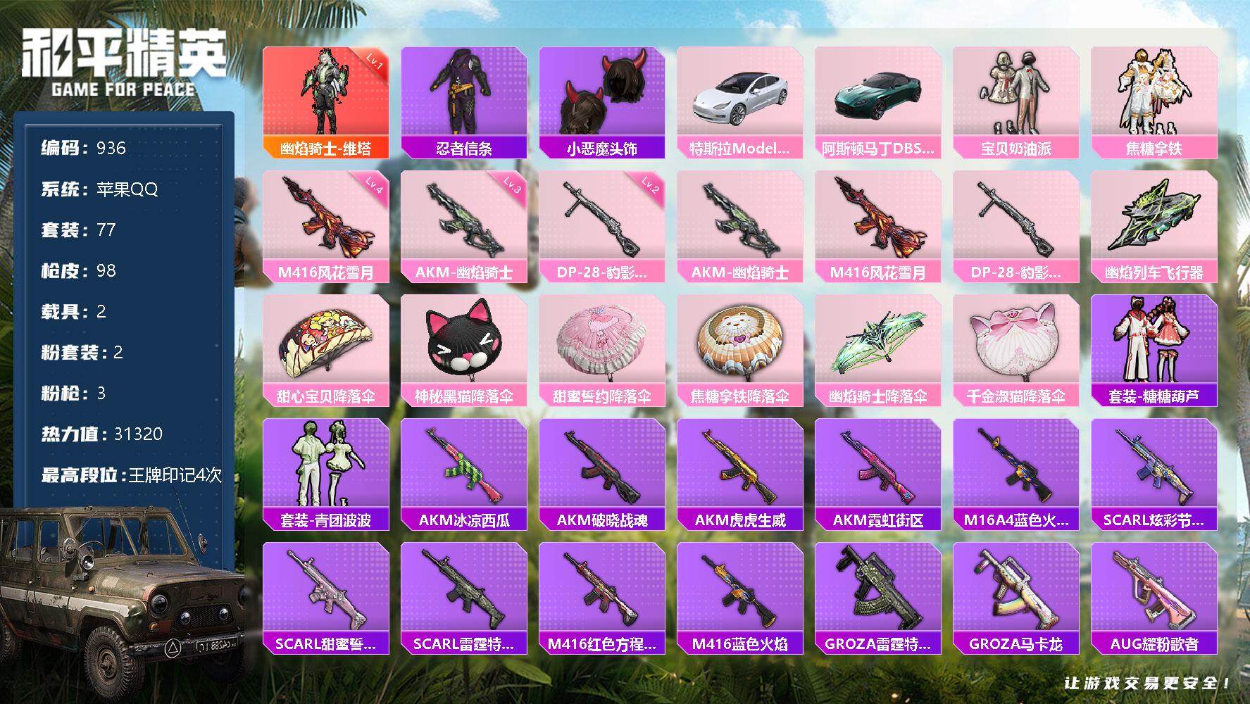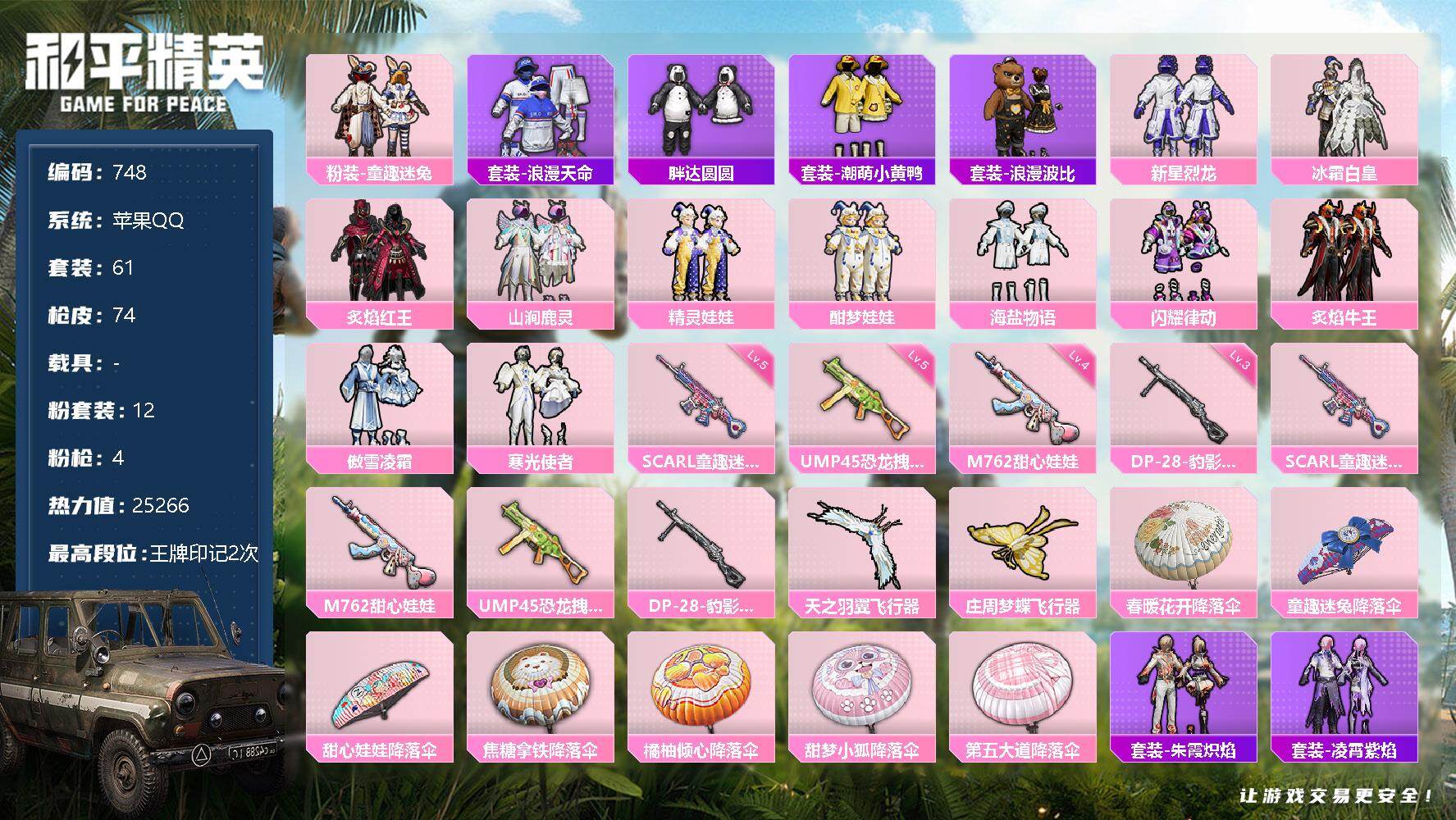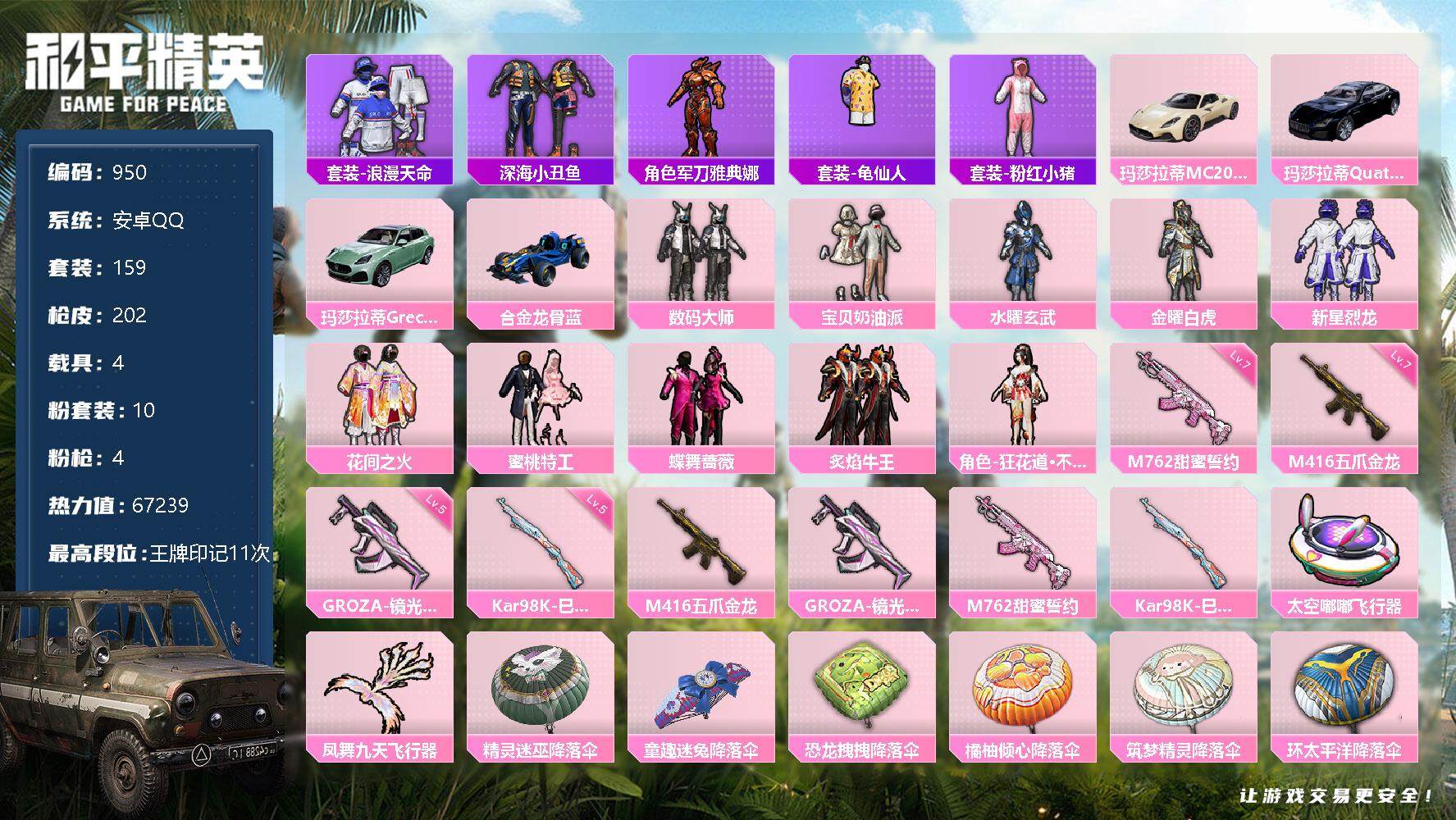 安卓 手Q-1神装-10粉装-4特效枪-1载具-6粉色飞行器-38664热力值-