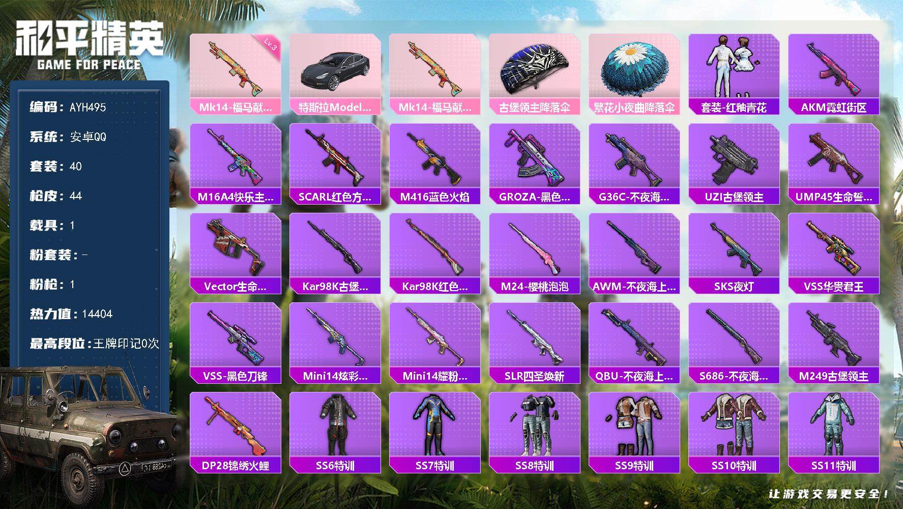 安卓 手Q-0粉装-1特效枪-1载具-0粉色飞行器-14404热力值-1王牌印记