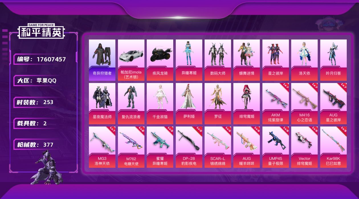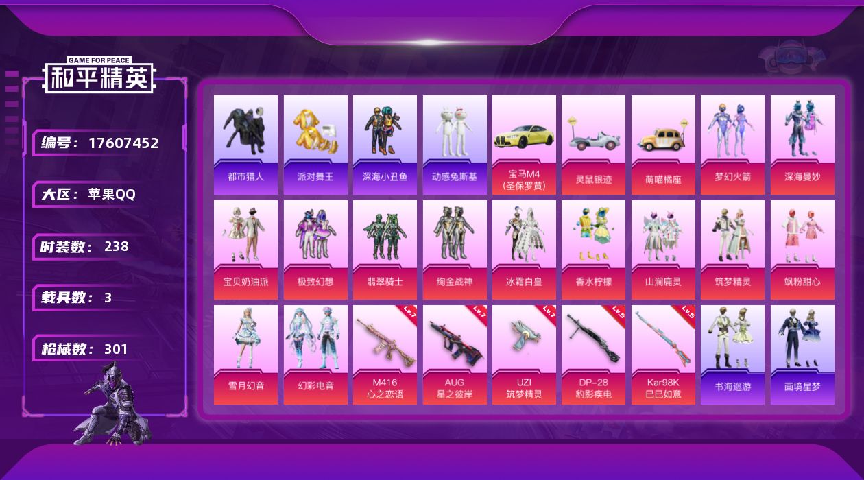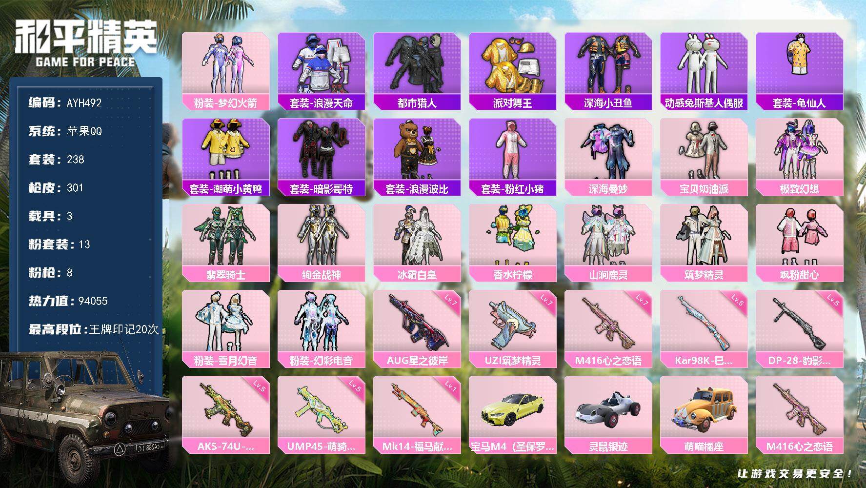 苹果 手Q-13粉装-8特效枪-3载具-2粉色飞行器-94055热力值-20王牌