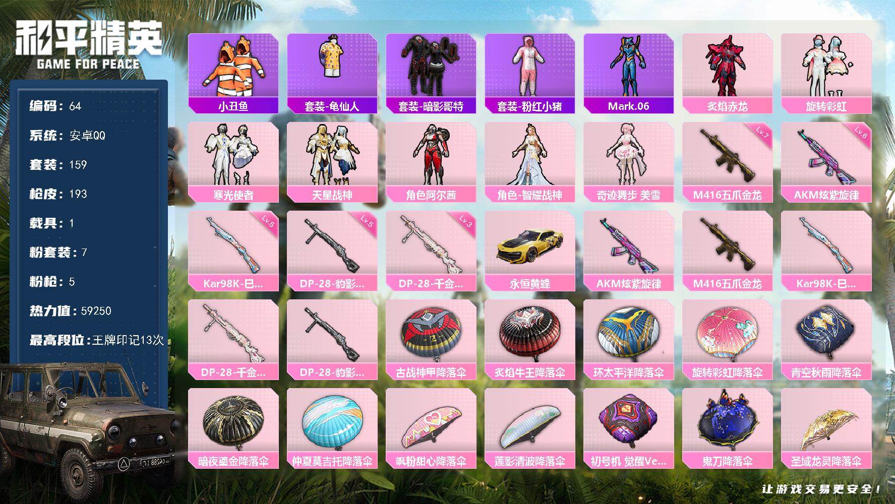 7粉装-5特效枪-1载具-0粉色飞行器-59250热力值-13王牌印记-159套装-193枪皮