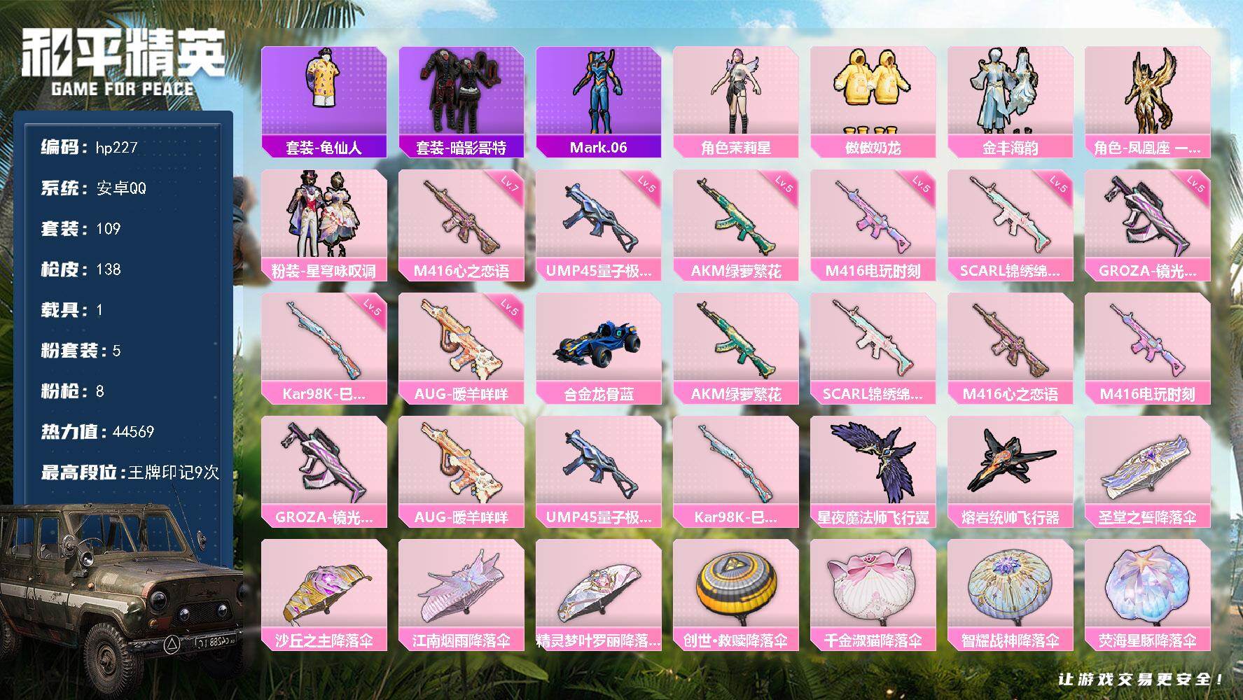 5粉装-8特效枪-1载具-2粉色飞行器-44569热力值-9王牌印记-109套装-138枪皮