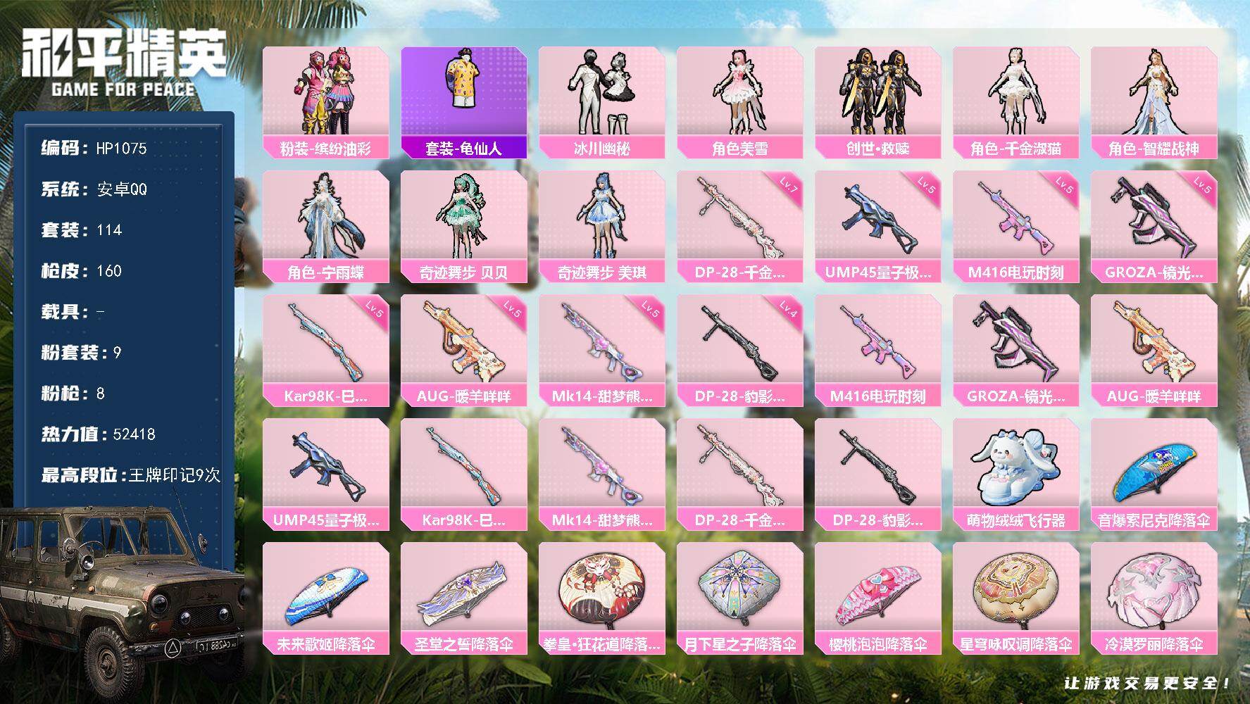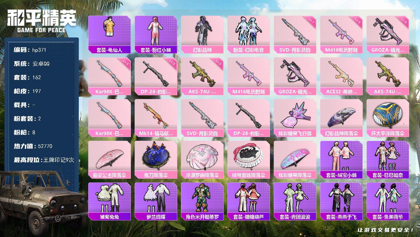 2粉装-8特效枪-0载具-1粉色飞行器-52770热力值-9王牌印记-162套装-197枪皮