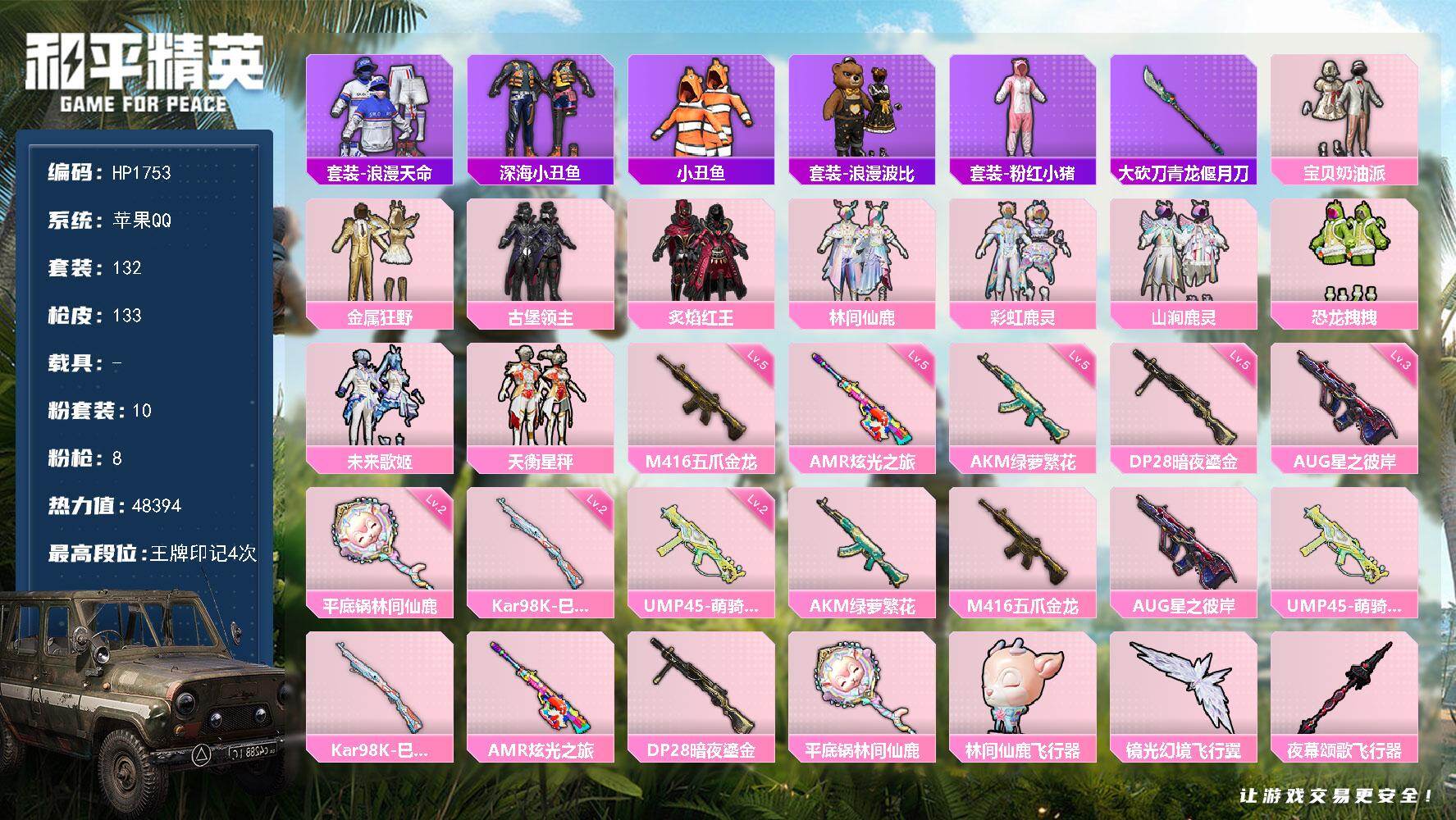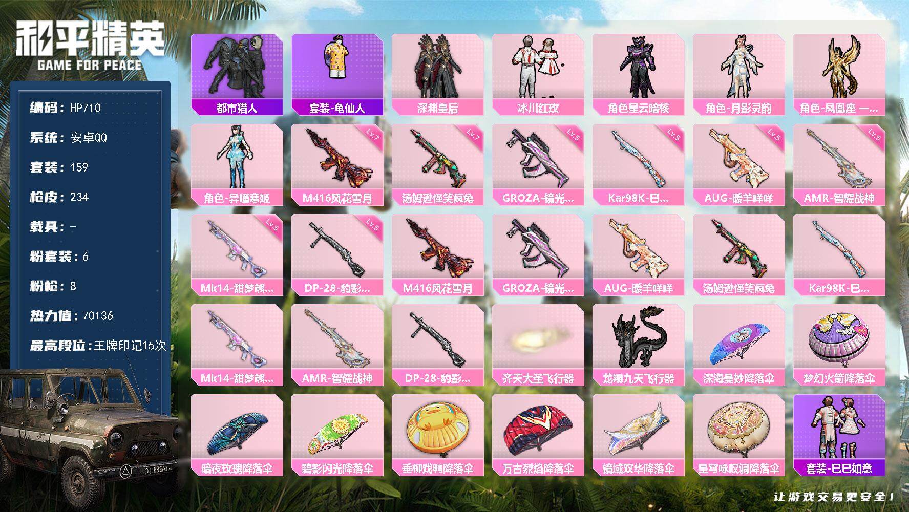 2粉装-5特效枪-1载具-1粉色飞行器-41140热力值-7王牌印记-97套装-137枪皮