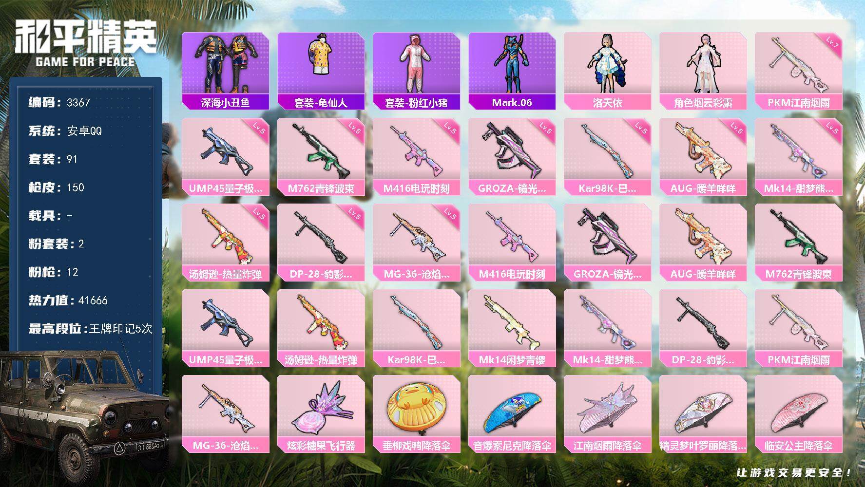 2粉装-12特效枪-0载具-1粉色飞行器-41666热力值-5王牌印记-91套装-150枪皮
