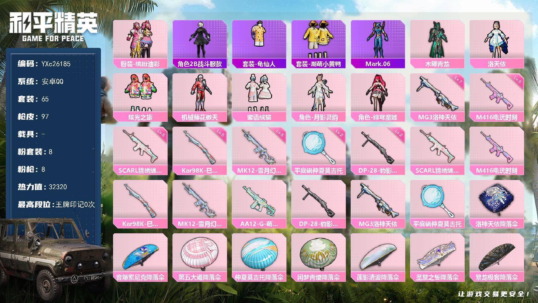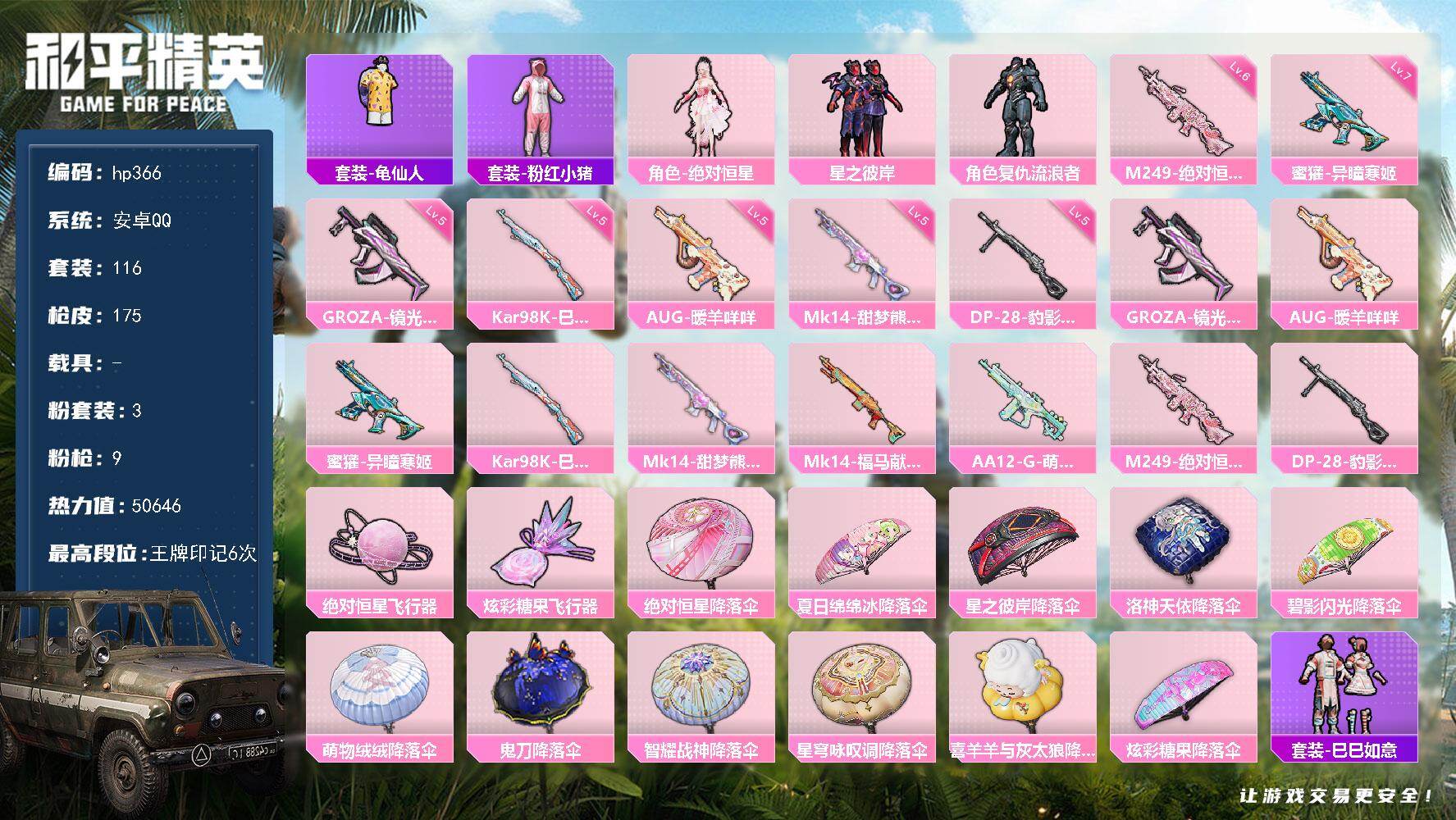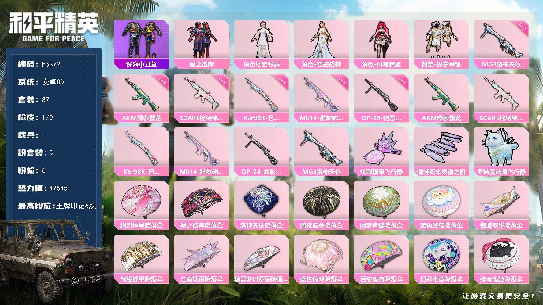 5粉装-6特效枪-0载具-3粉色飞行器-47545热力值-6王牌印记-87套装-170枪皮