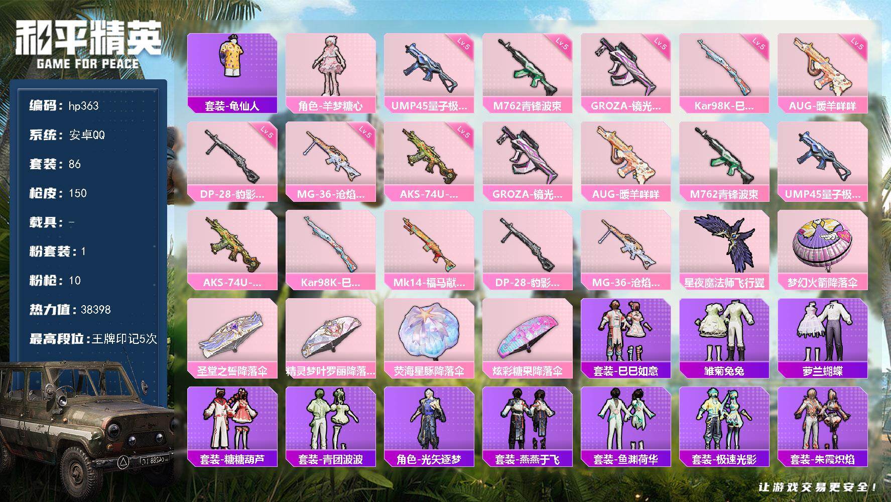 1粉装-10特效枪-0载具-1粉色飞行器-38398热力值-5王牌印记-86套装-150枪皮
