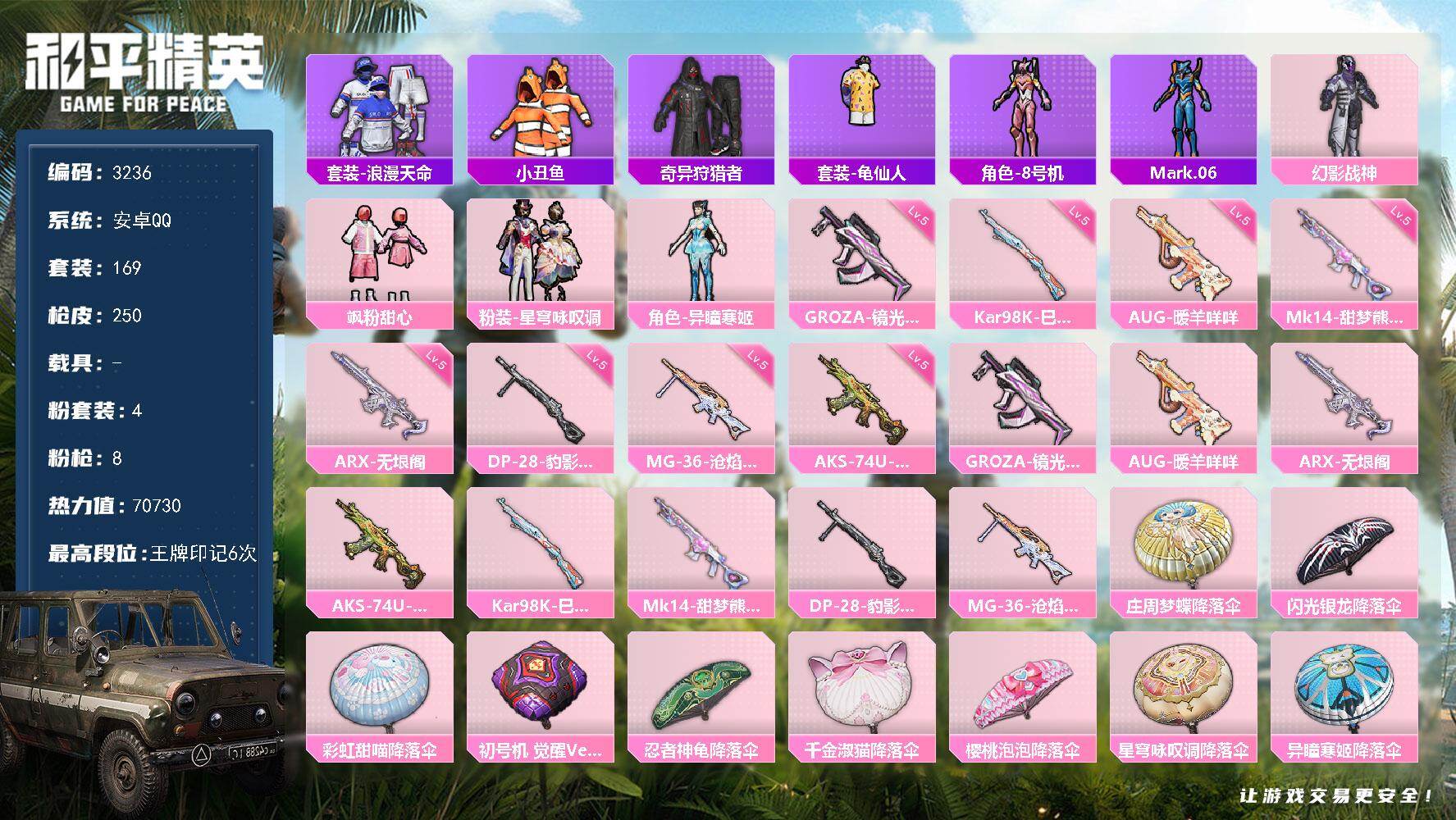 4粉装-8特效枪-0载具-1粉色飞行器-70730热力值-6王牌印记-169套装-250枪皮