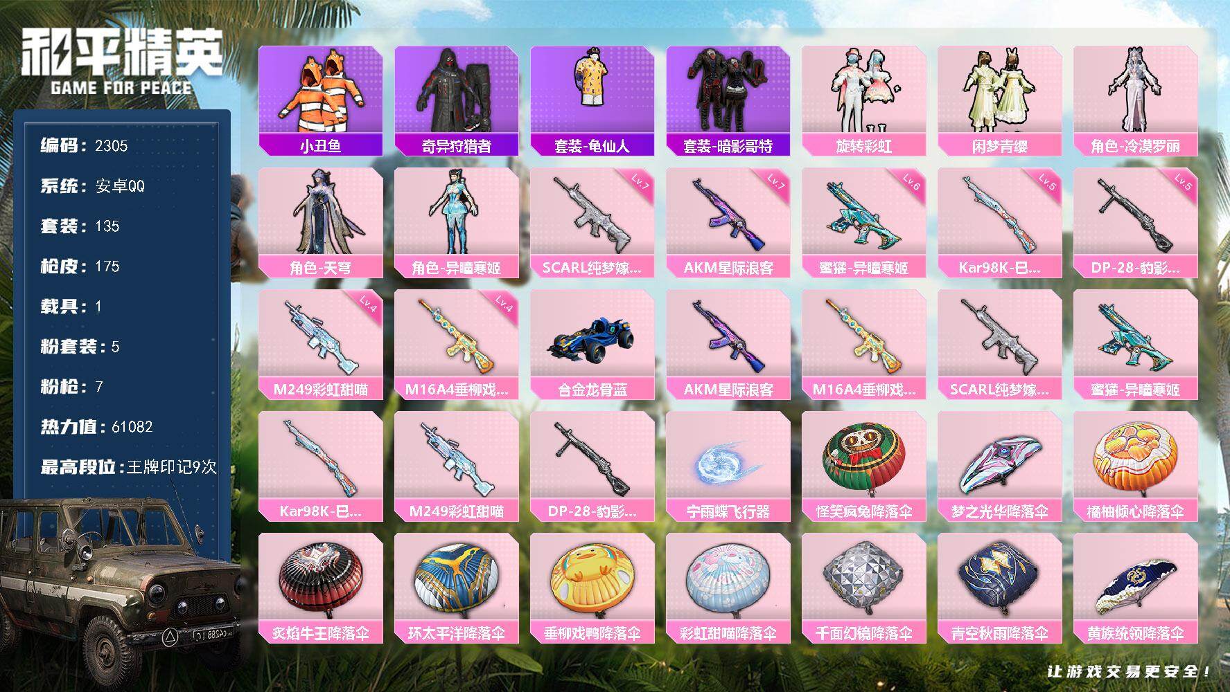 5粉装-7特效枪-1载具-2粉色飞行器-61082热力值-9王牌印记-135套装-175枪皮