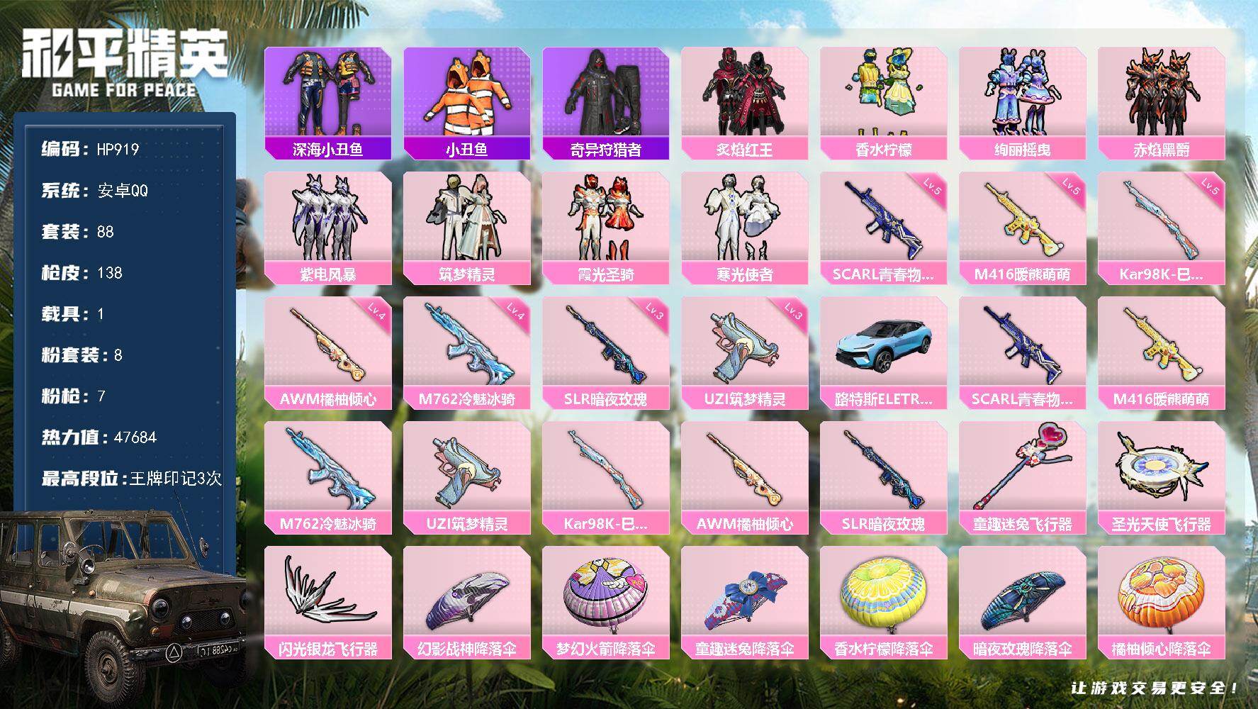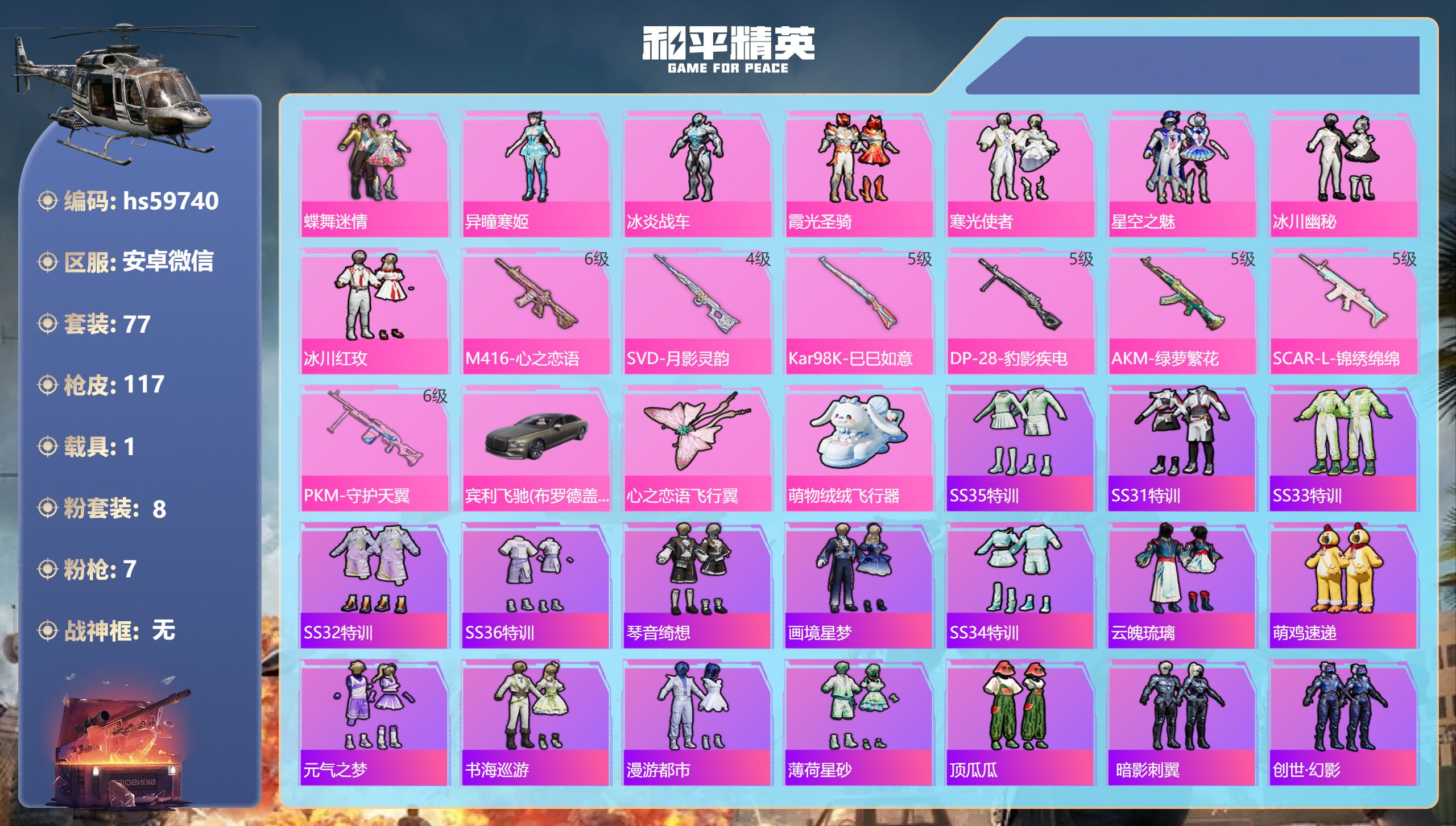 7王牌印记-8粉装-7特效枪-1载具-39699热力值-77套装-117枪皮-1卓越印记