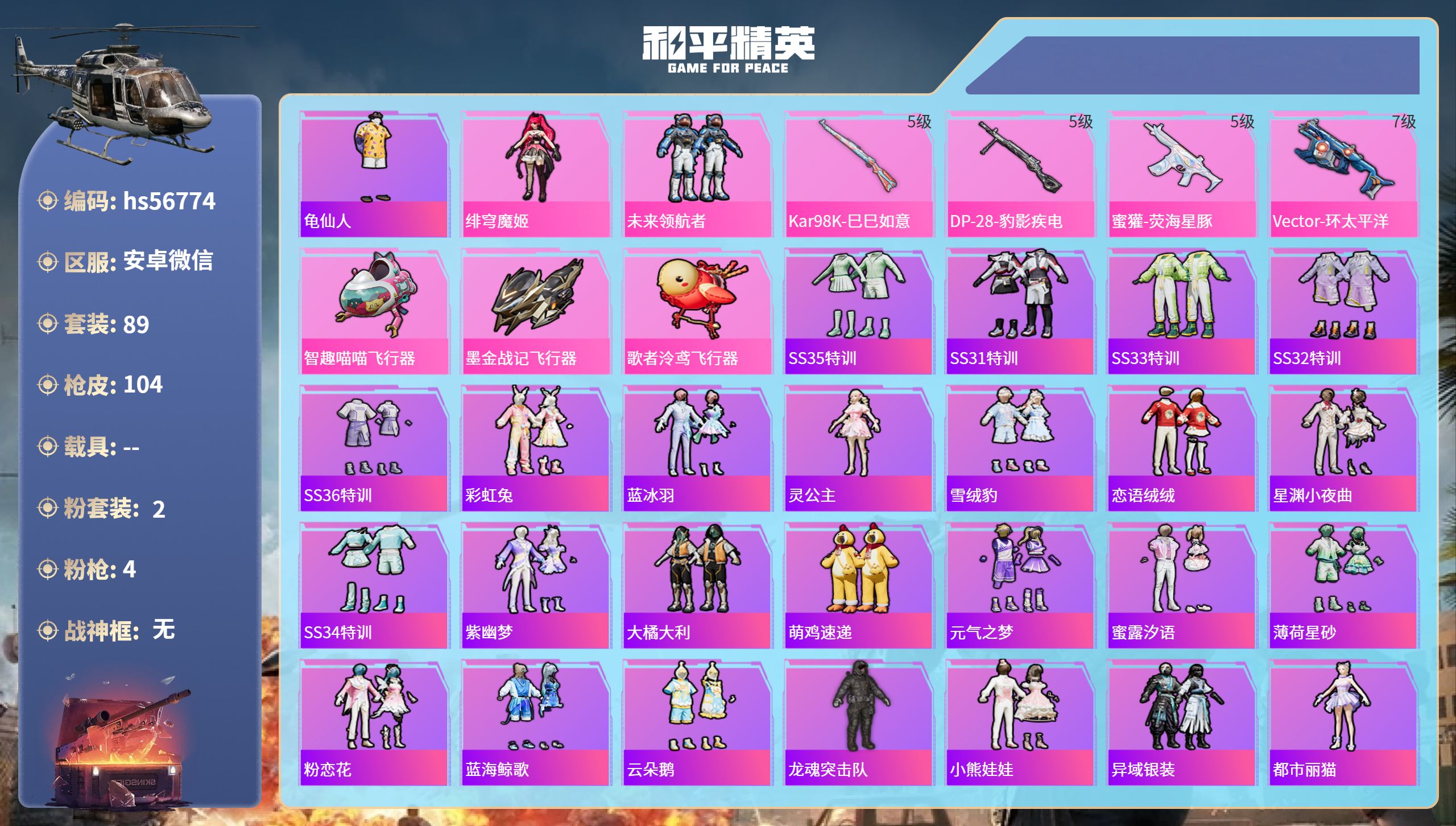 7王牌印记-2粉装-4特效枪-32640热力值-89套装-104枪皮-2卓越印记