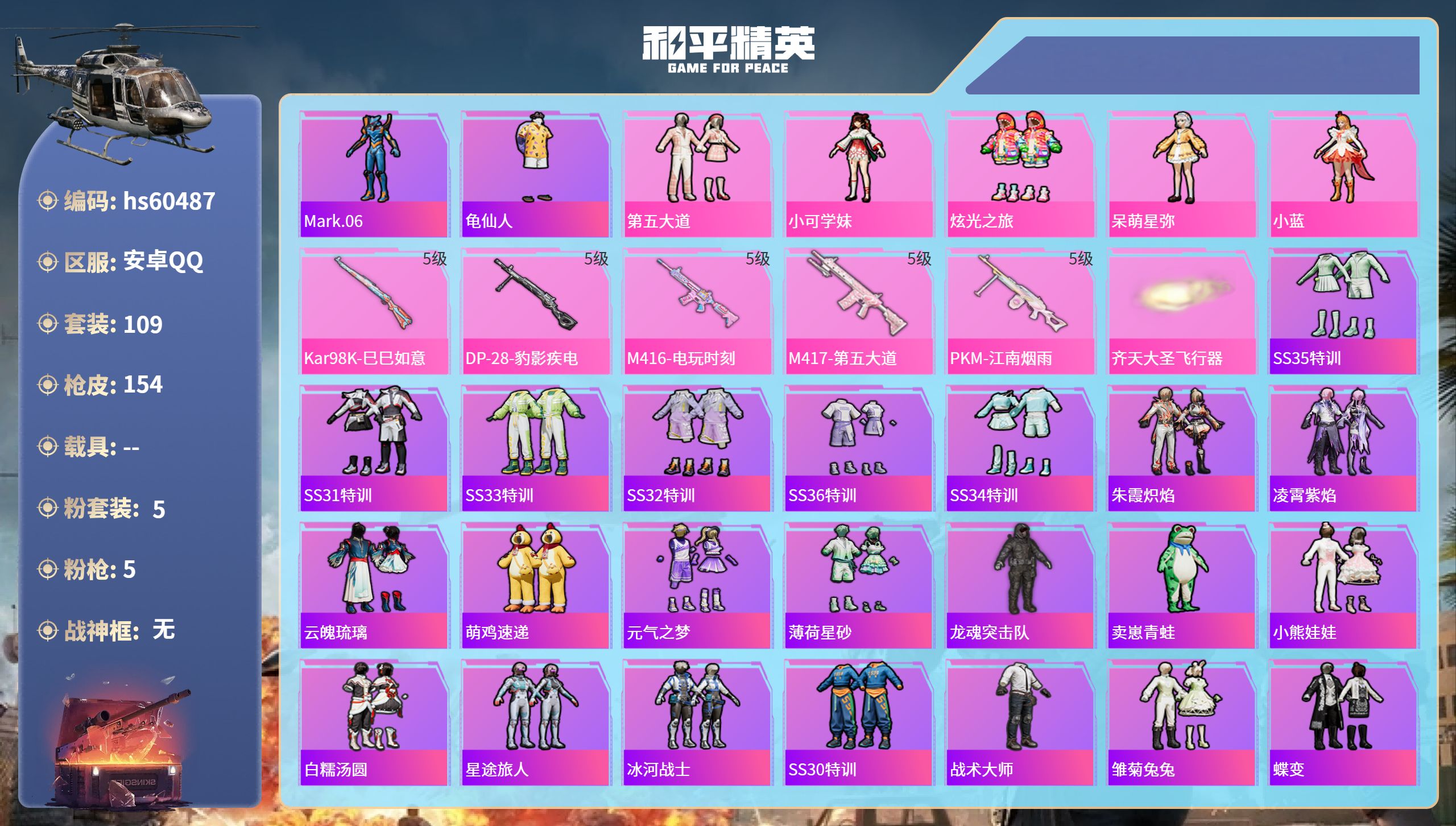 9王牌印记-5粉装-5特效枪-47130热力值-109套装-154枪皮-4卓越印记-1传奇印记