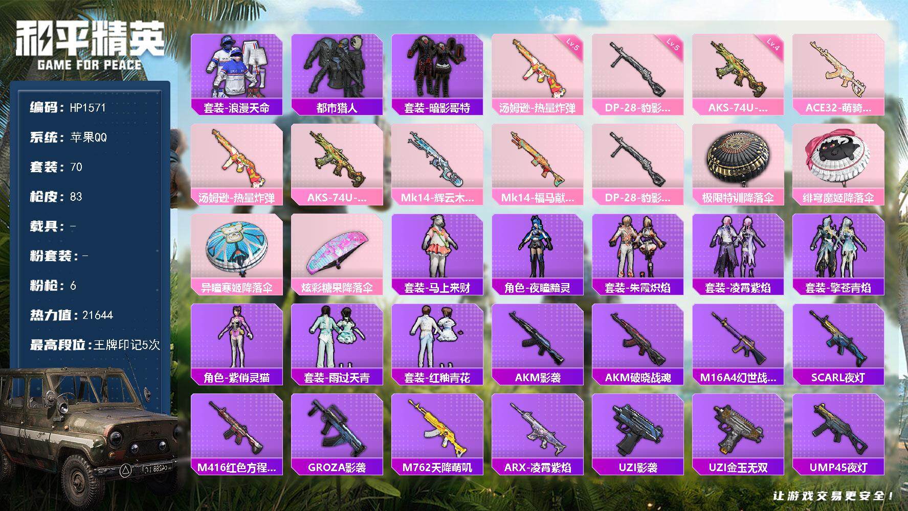 70套装/枪械6/装备94/战备67/王牌印记5/热力值21644/