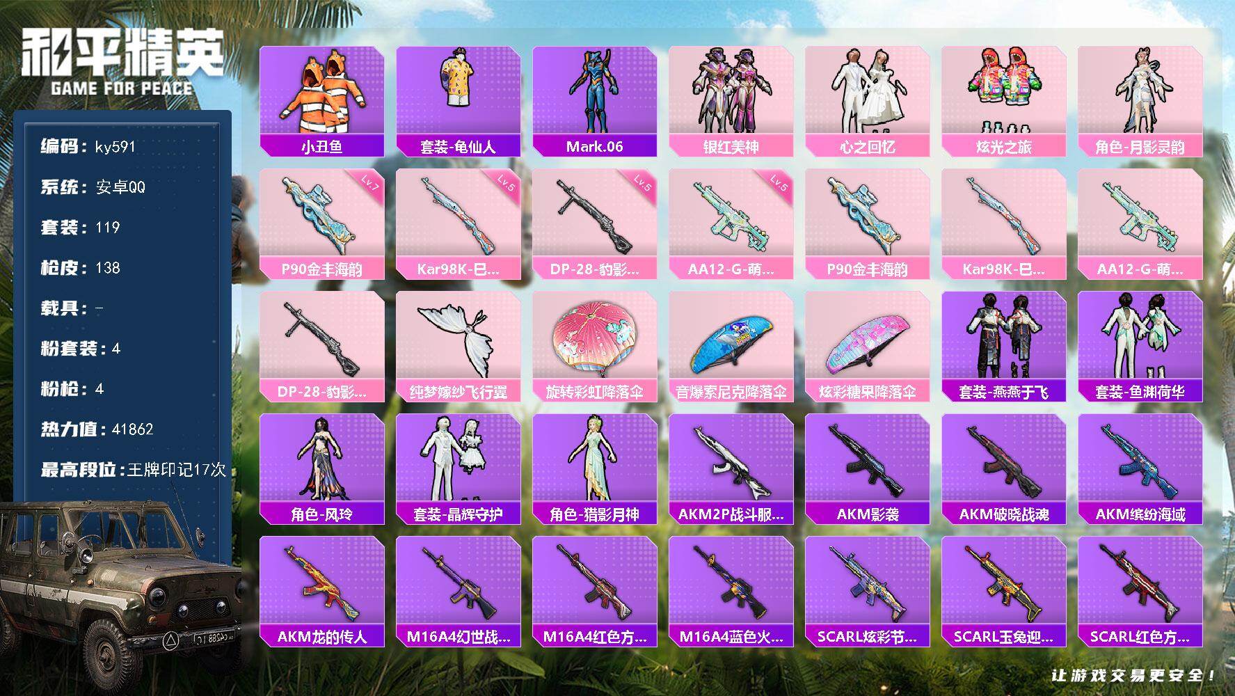 安卓 手Q-4粉装-4特效枪-0载具-1粉色飞行器-41862热力值-17王牌