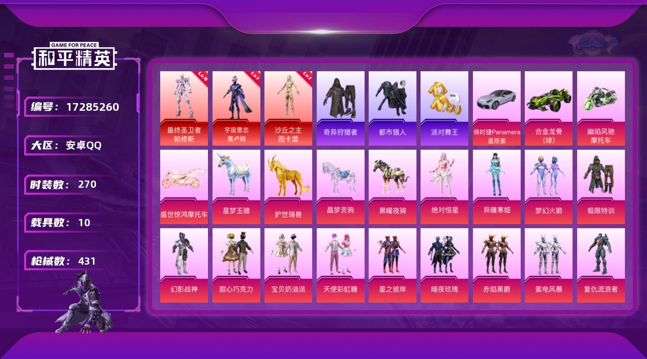安卓 手Q-4神装-30粉装-34特效枪-10载具-23粉色飞行器-16304