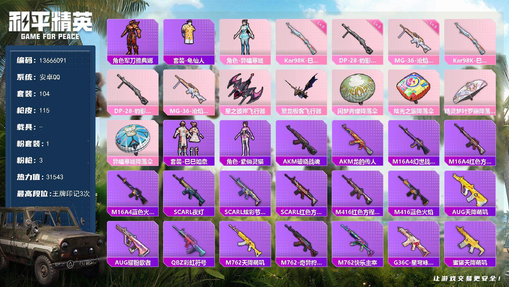 安卓 手Q-1神装-33粉装-20特效枪-6载具-10粉色飞行器-137654