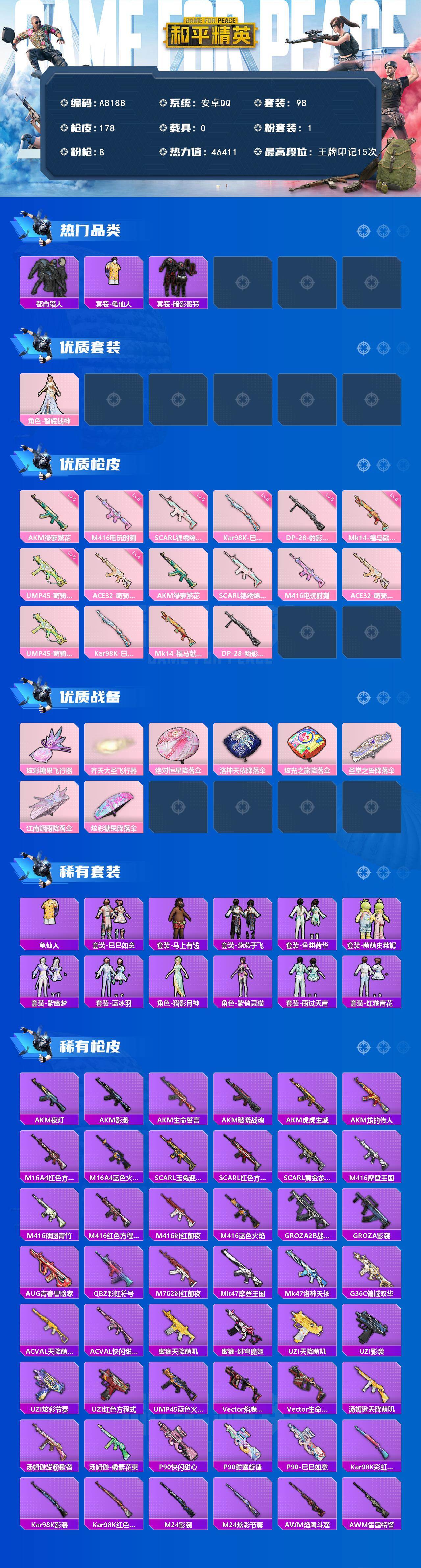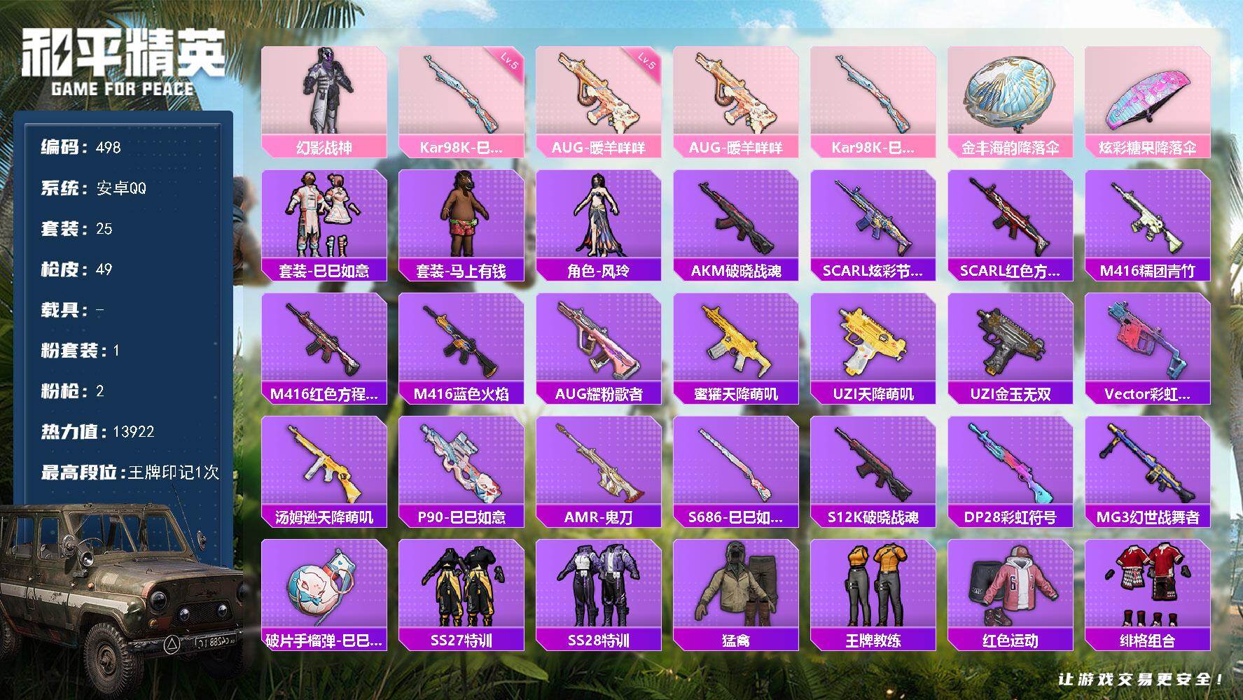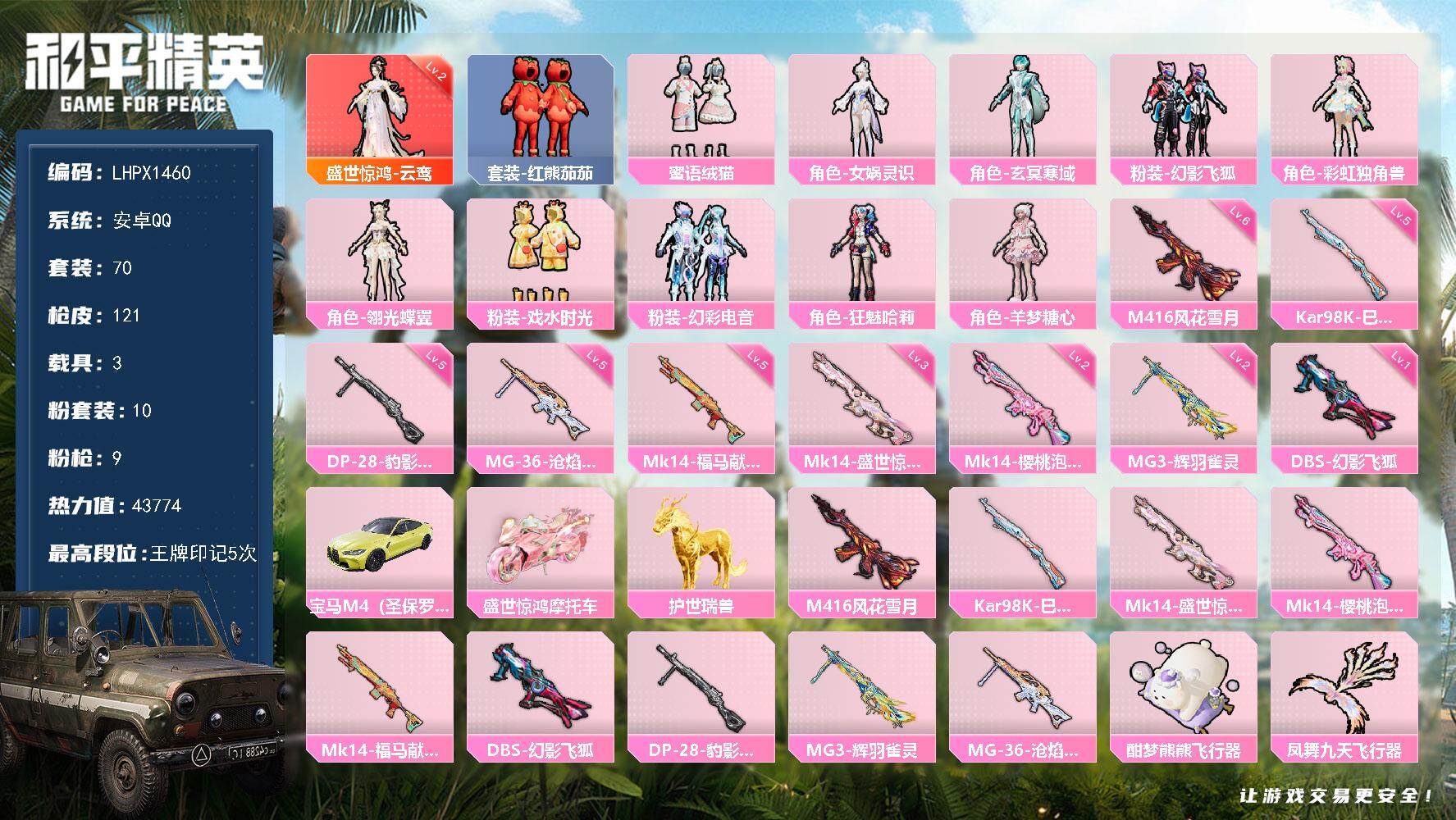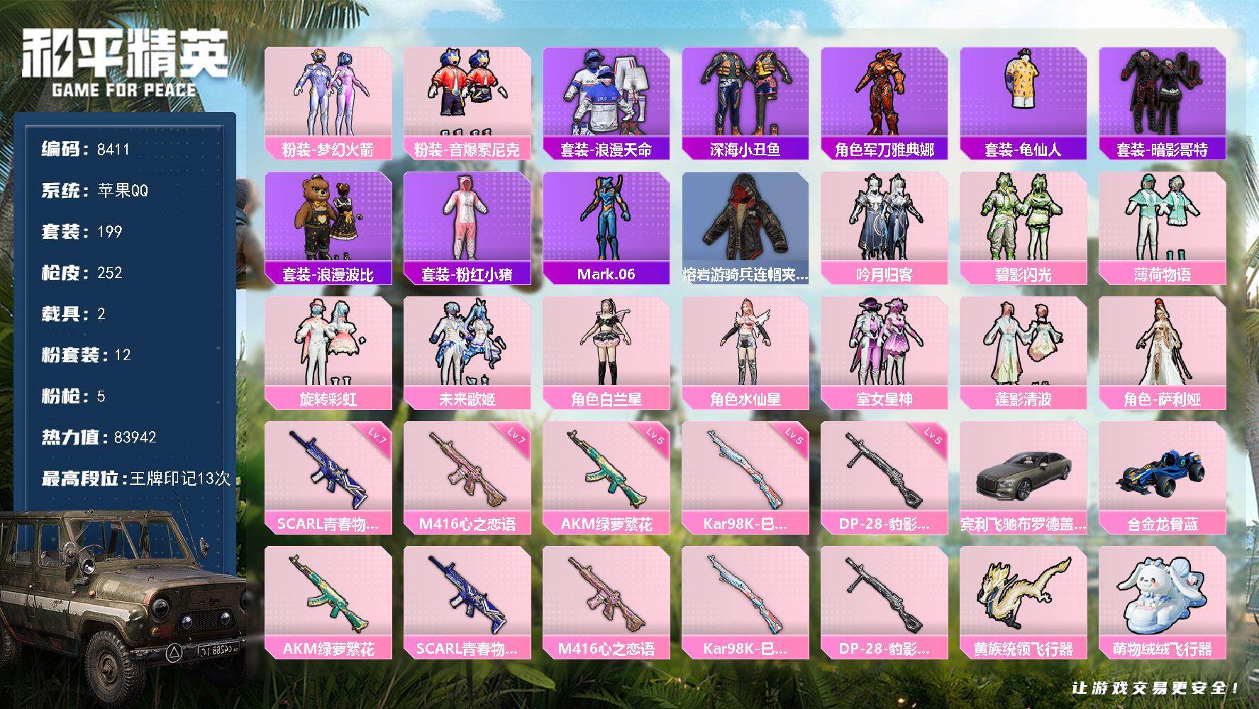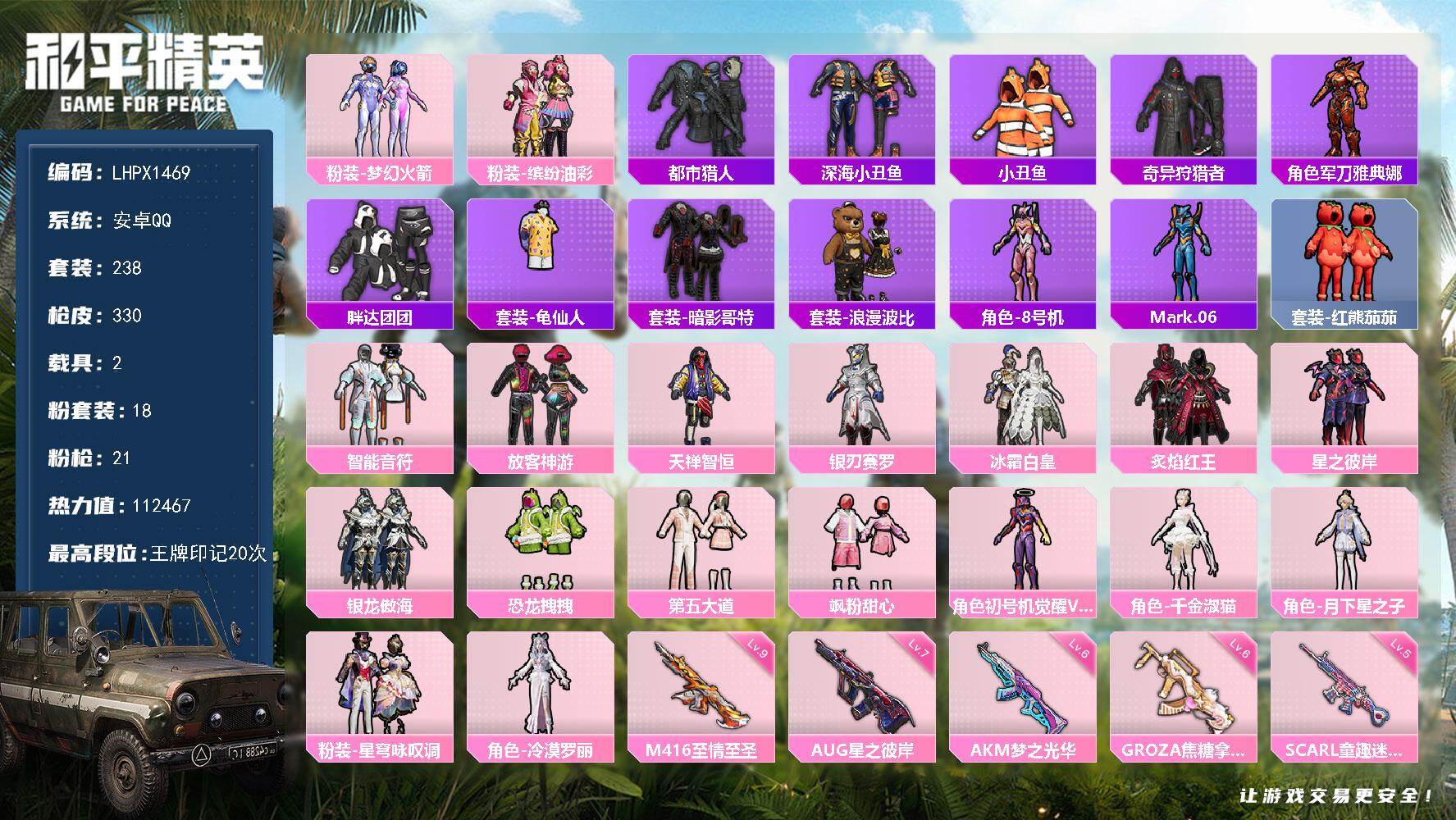 可二次【特价出售/店主推荐】安卓 手Q-1神装-10粉装-9特效枪-3载具-7