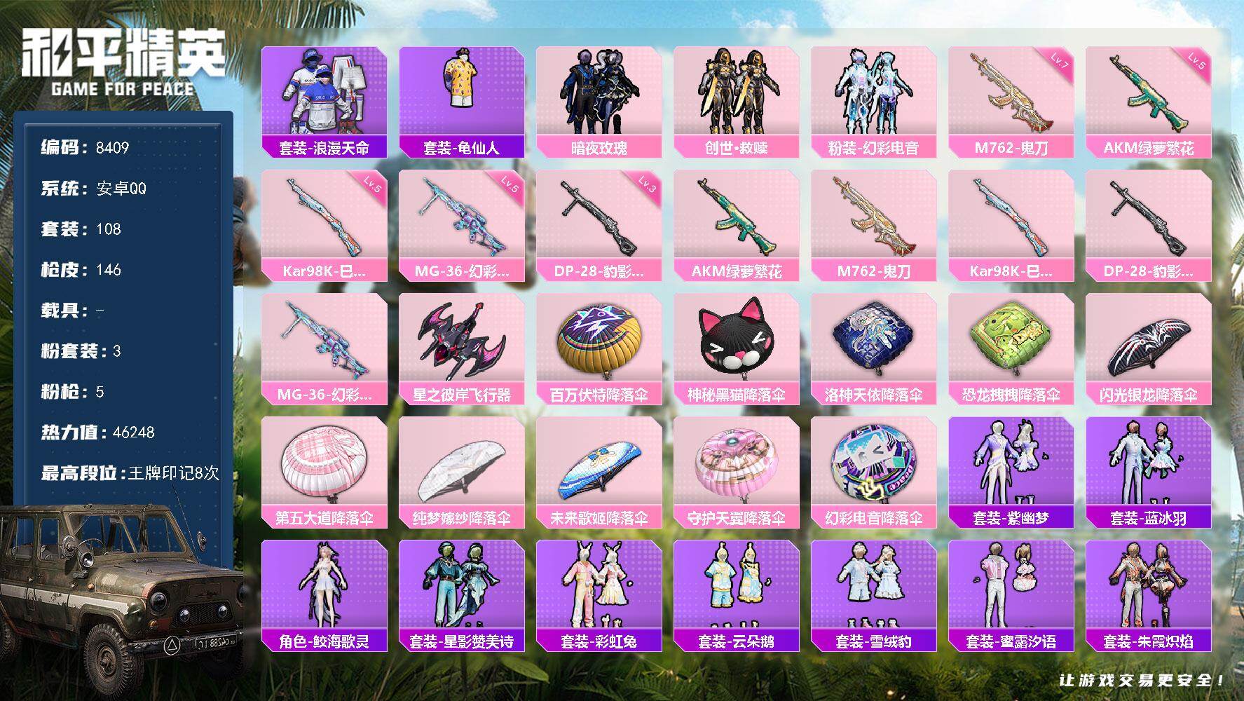 【8409】3粉装-5特效枪-0载具-1粉色飞行器-46248热力值-8王牌印