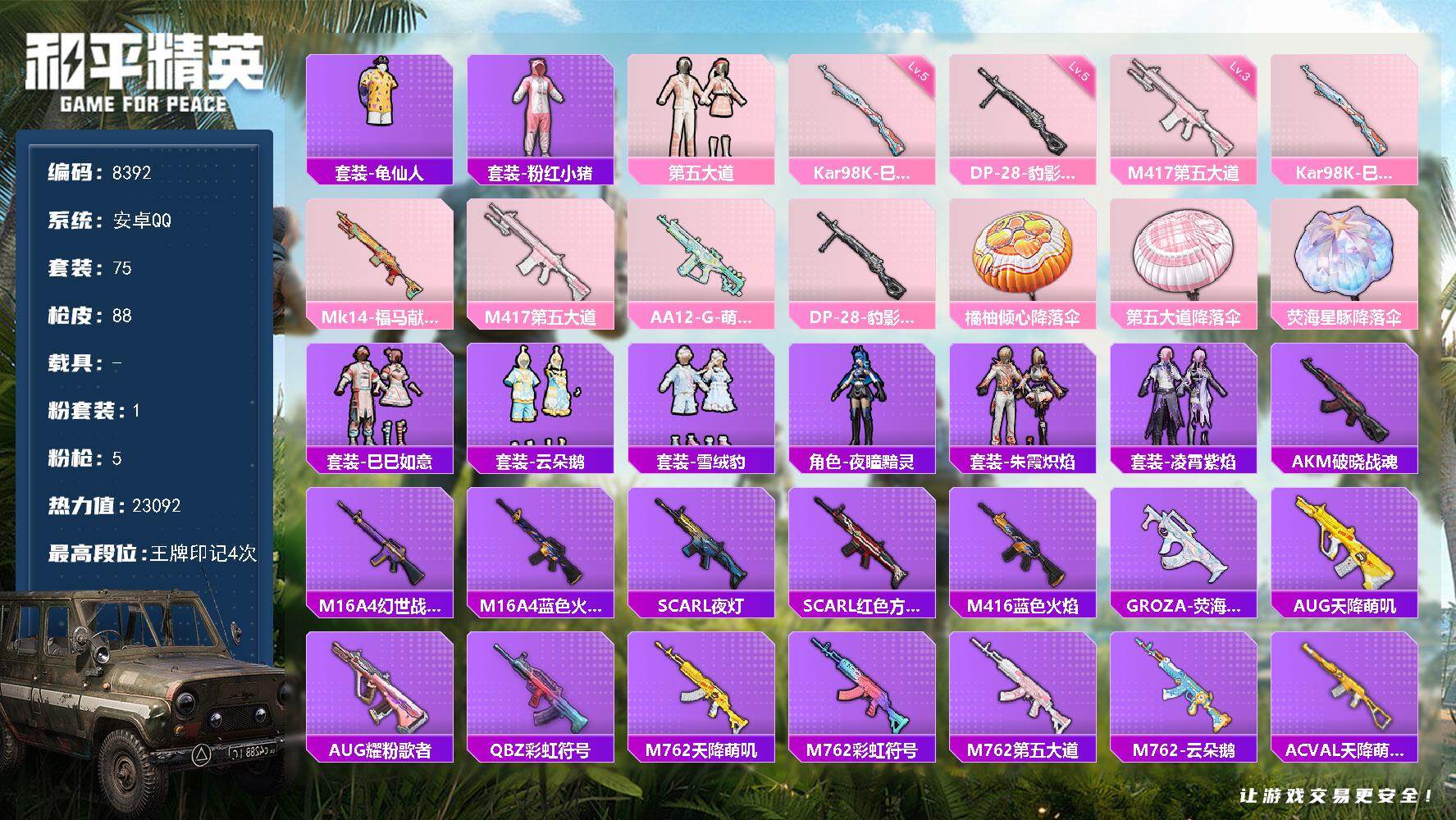 安卓 手Q-1粉装-2特效枪-0载具-0粉色飞行器-13922热力值-1王牌印