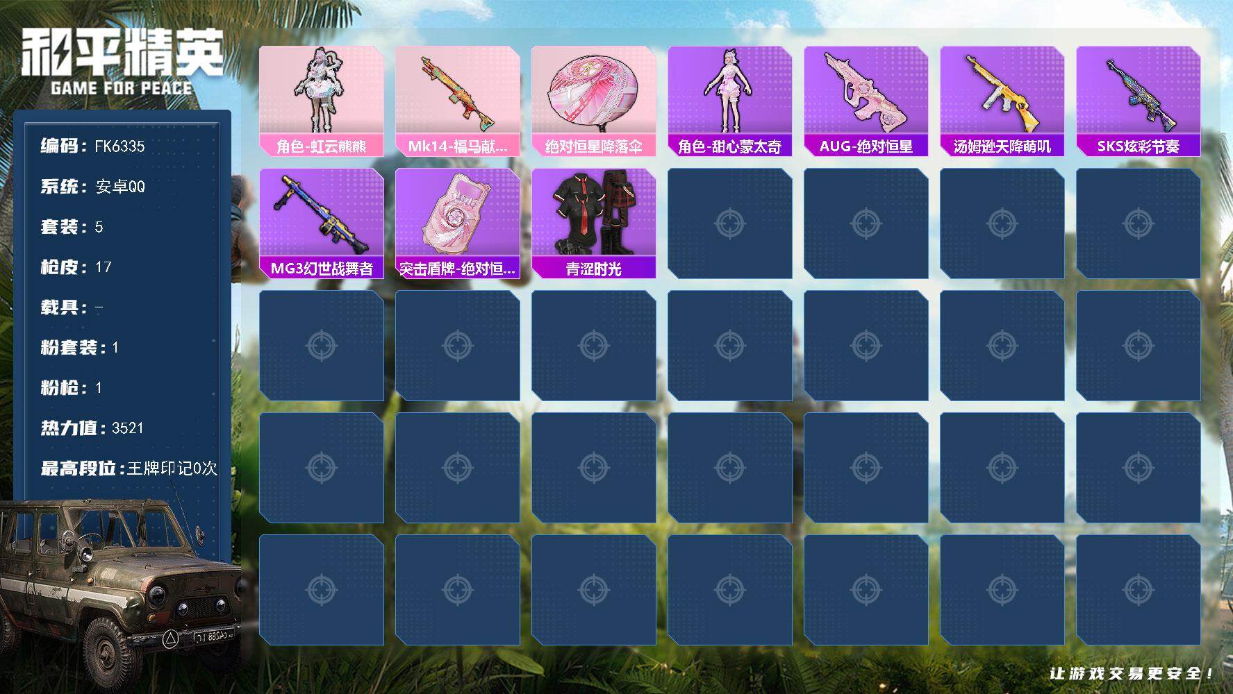 【店主推荐捡漏号!可直接换绑】安卓 手Q-2神装-7粉装-19特效枪-8载具-