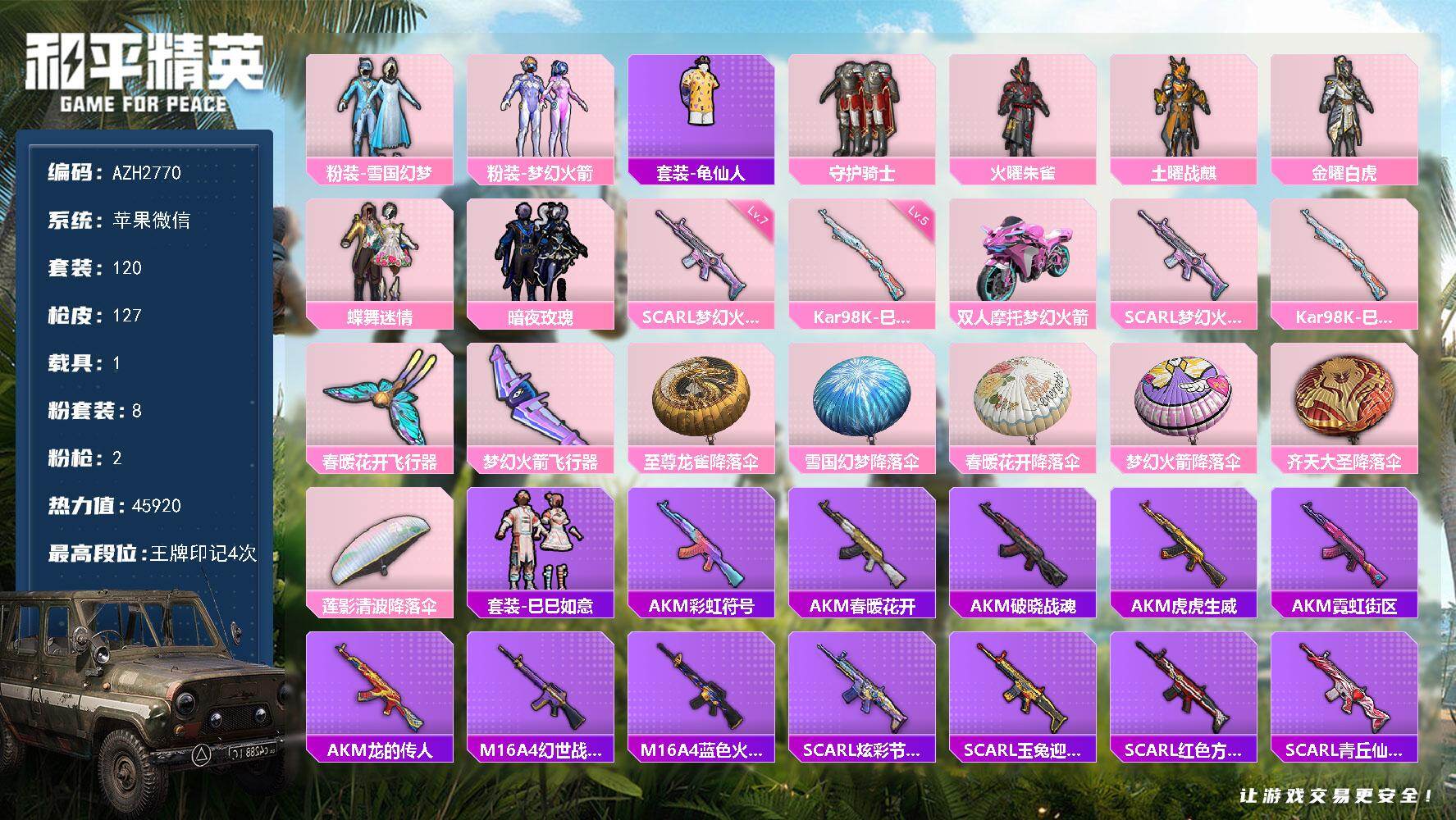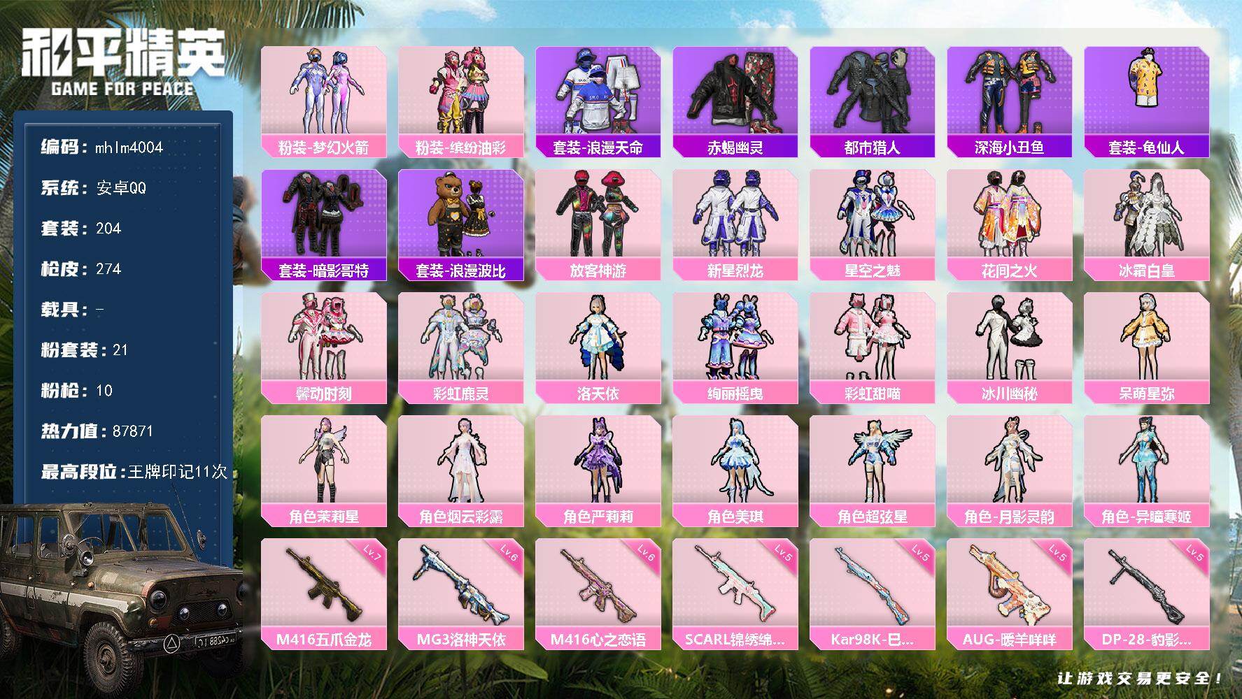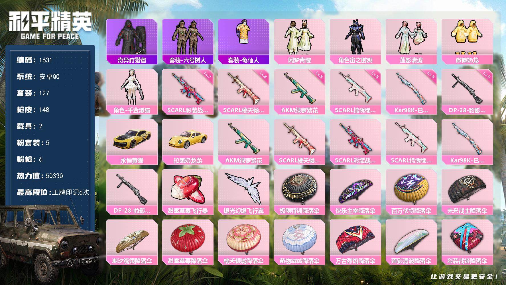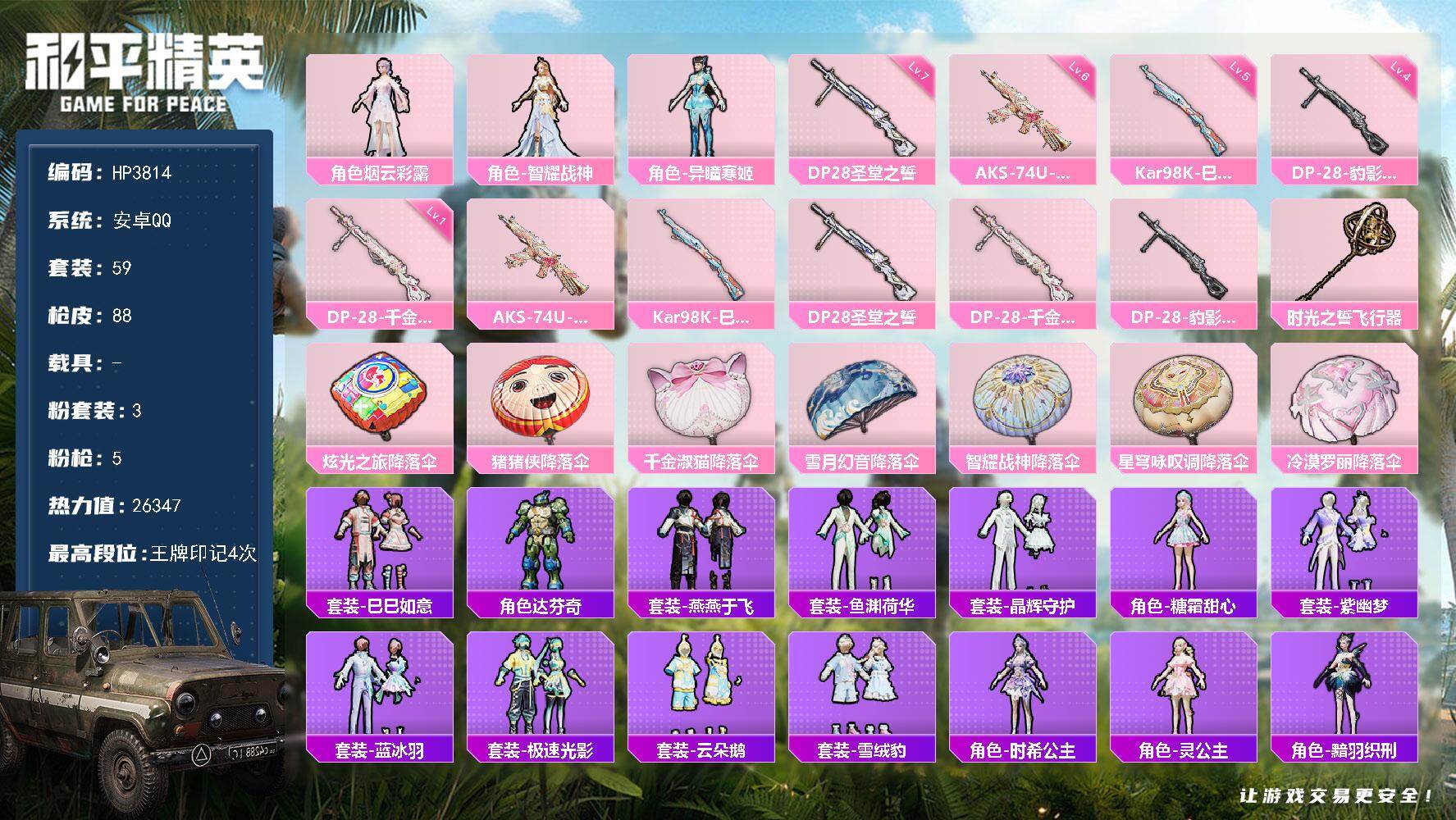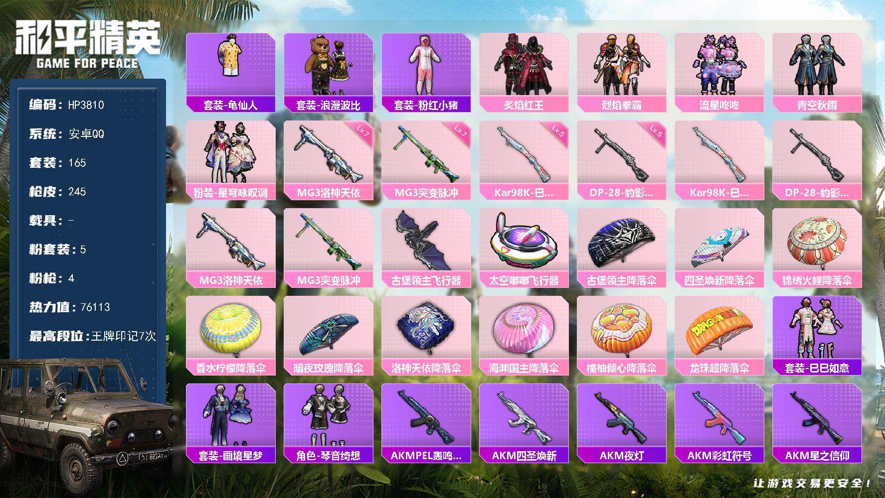 安卓 手Q-3粉装-4特效枪-2载具-3粉色飞行器-61400热力值-7王牌印