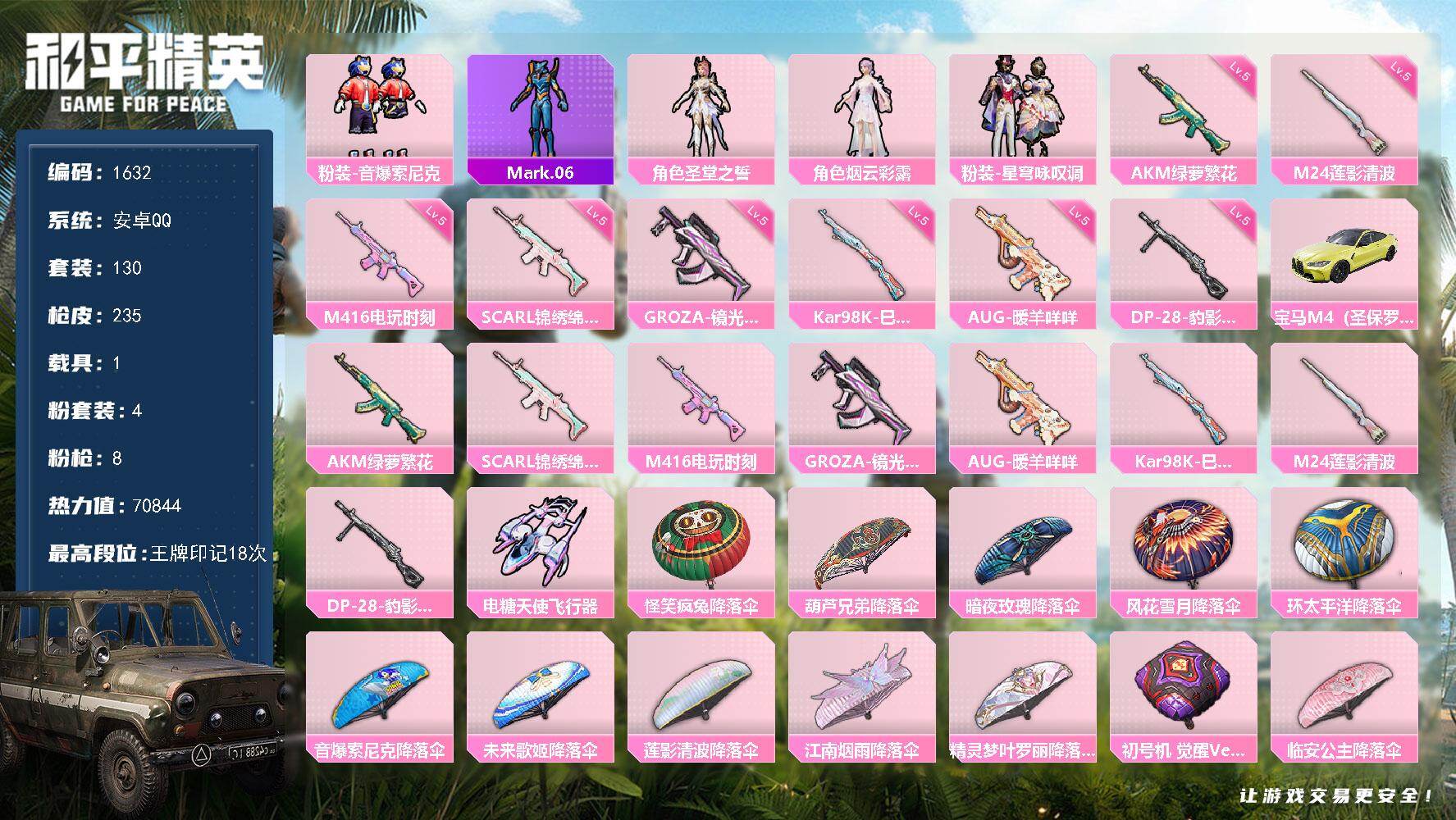 安卓 手Q-4粉装-8特效枪-1载具-1粉色飞行器-70844热力值-18王牌