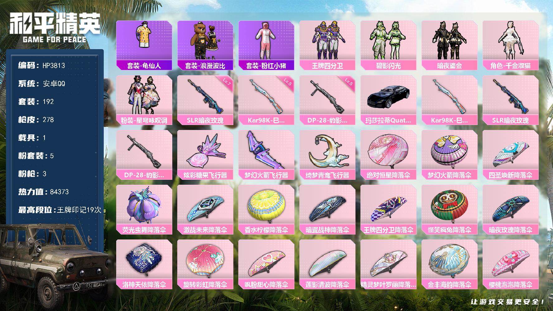 安卓 手Q-5粉装-3特效枪-1载具-3粉色飞行器-84373热力值-19王牌
