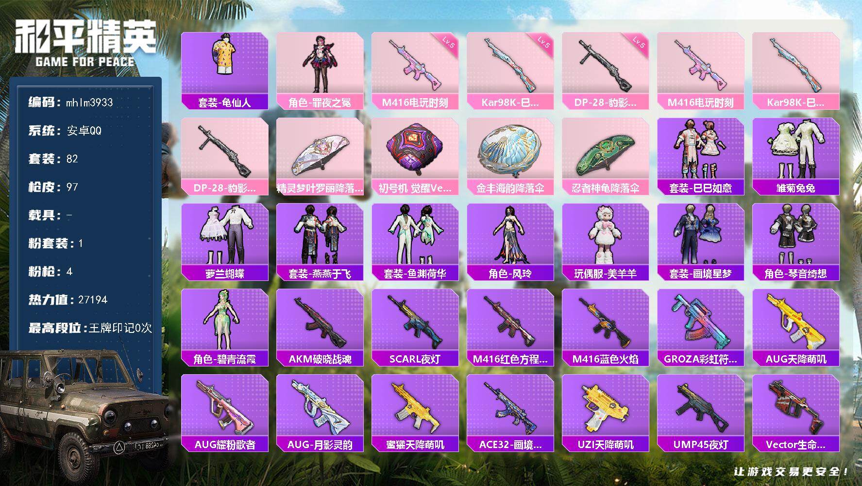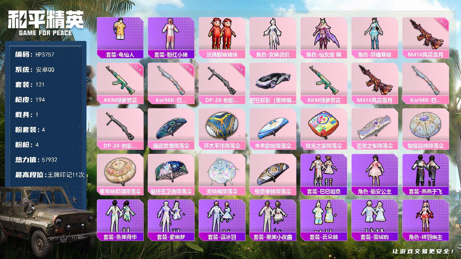 安卓 手Q-4粉装-4特效枪-1载具-1粉色飞行器-57932热力值-11王牌