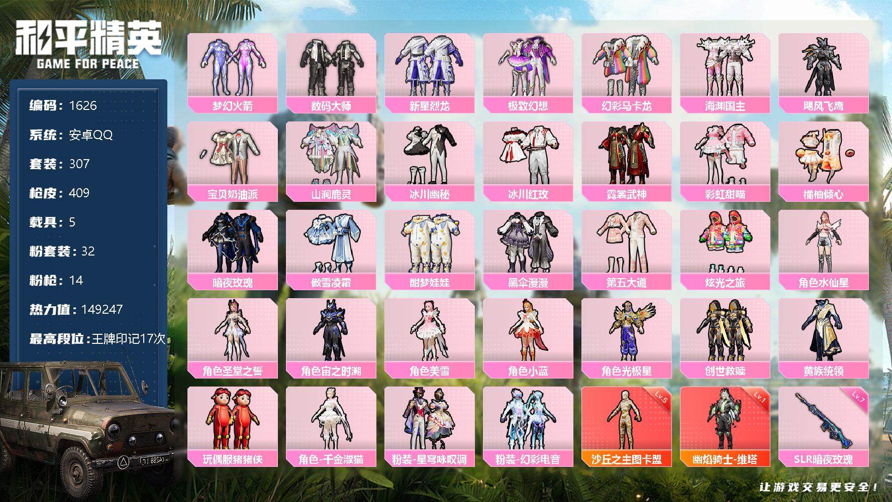 安卓 手Q-3粉装-6特效枪-0载具-1粉色飞行器-46500热力值-14王牌