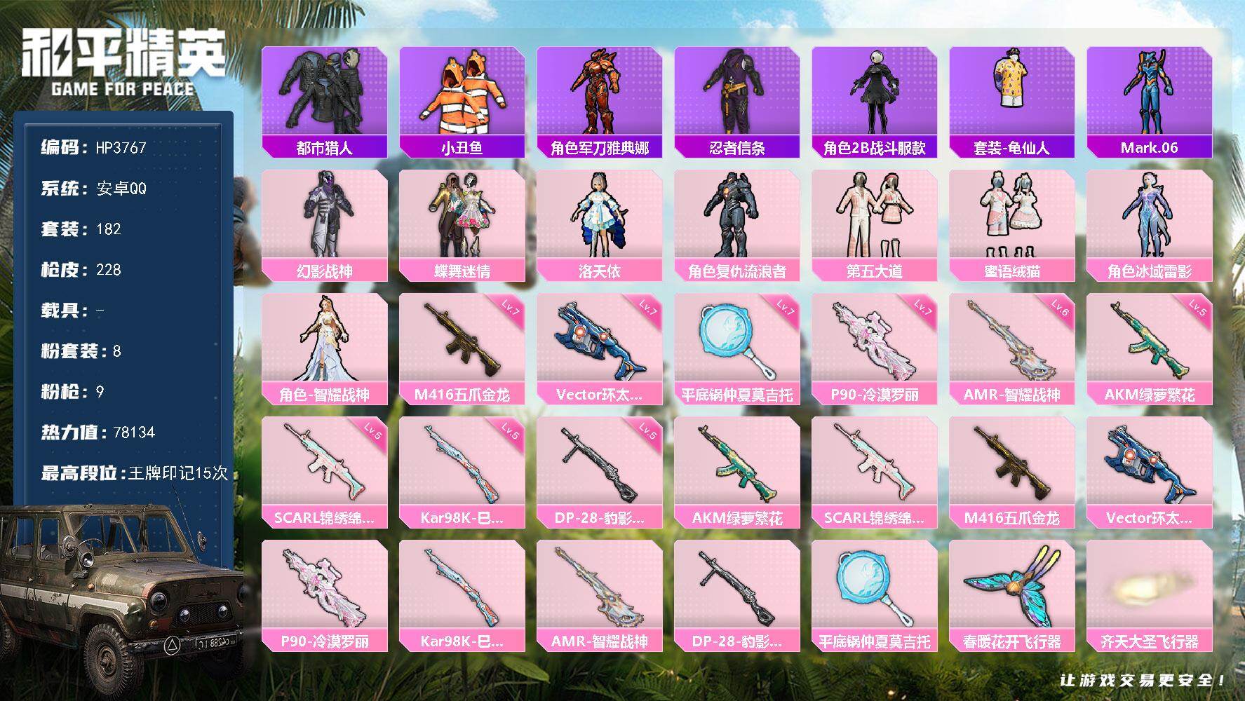 安卓 手Q-8粉装-9特效枪-0载具-6粉色飞行器-78134热力值-15王牌