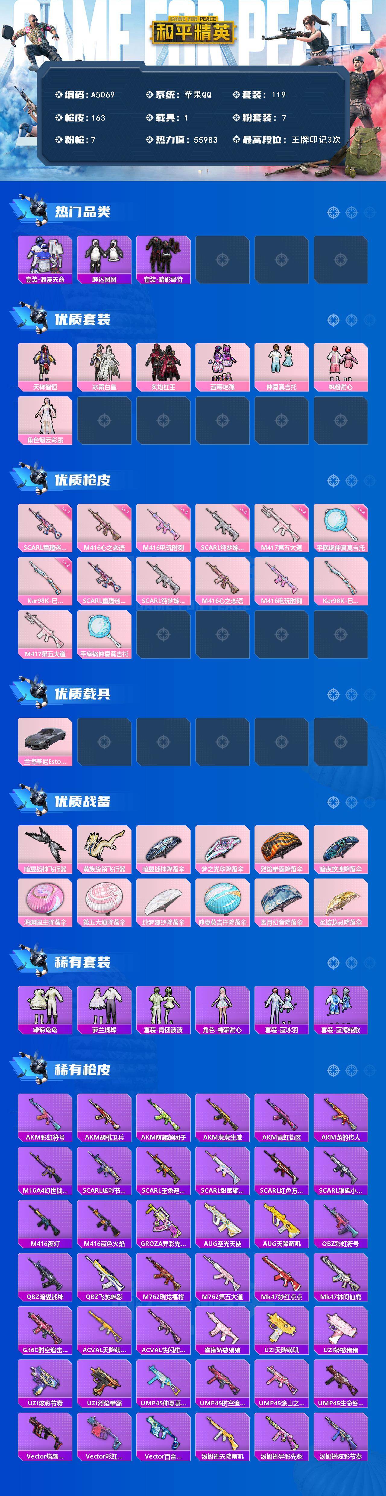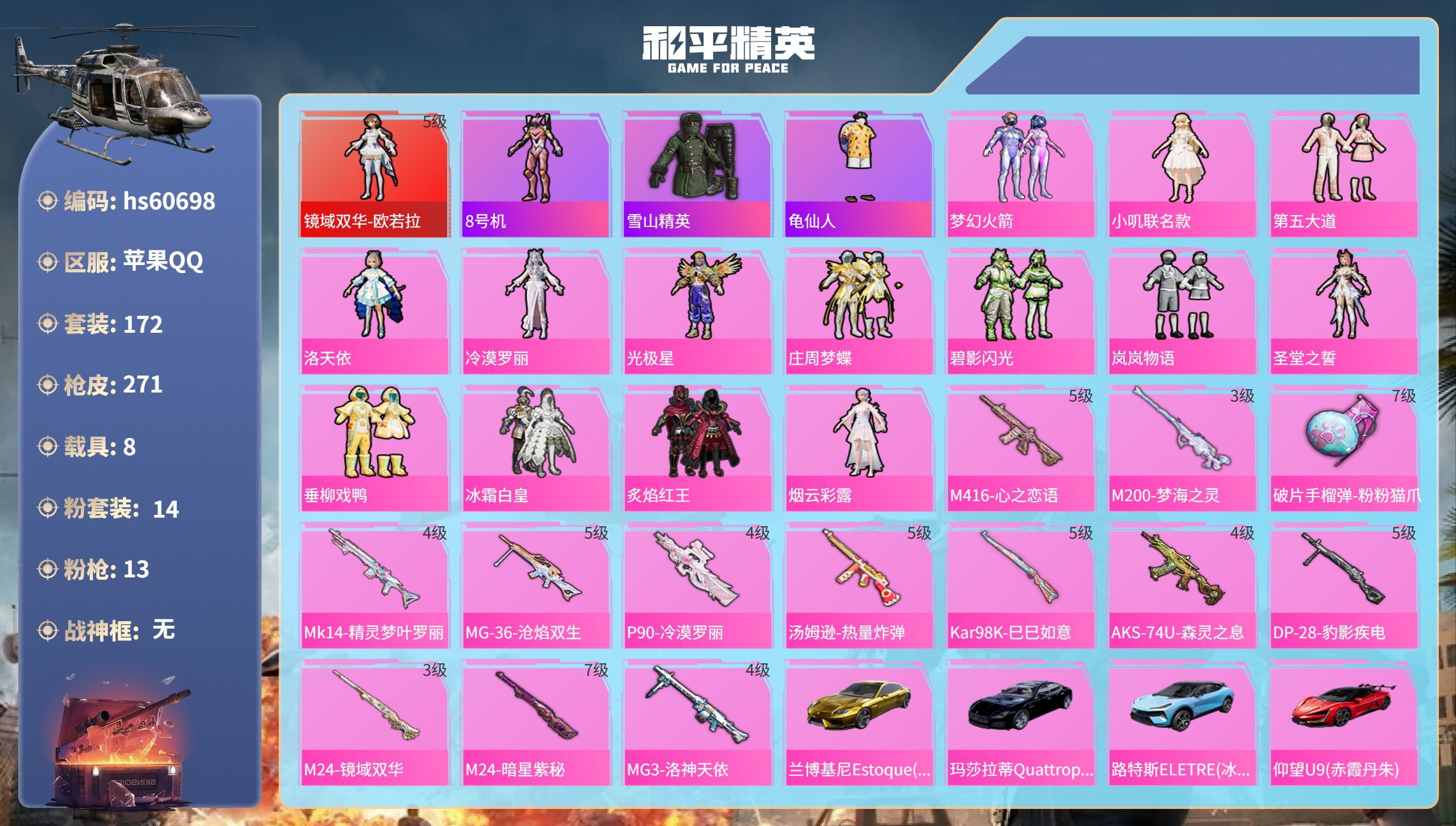hs60698苹果手Q-13王牌印记-1红装-14粉装-13特效枪-8载具-107655热力值-17