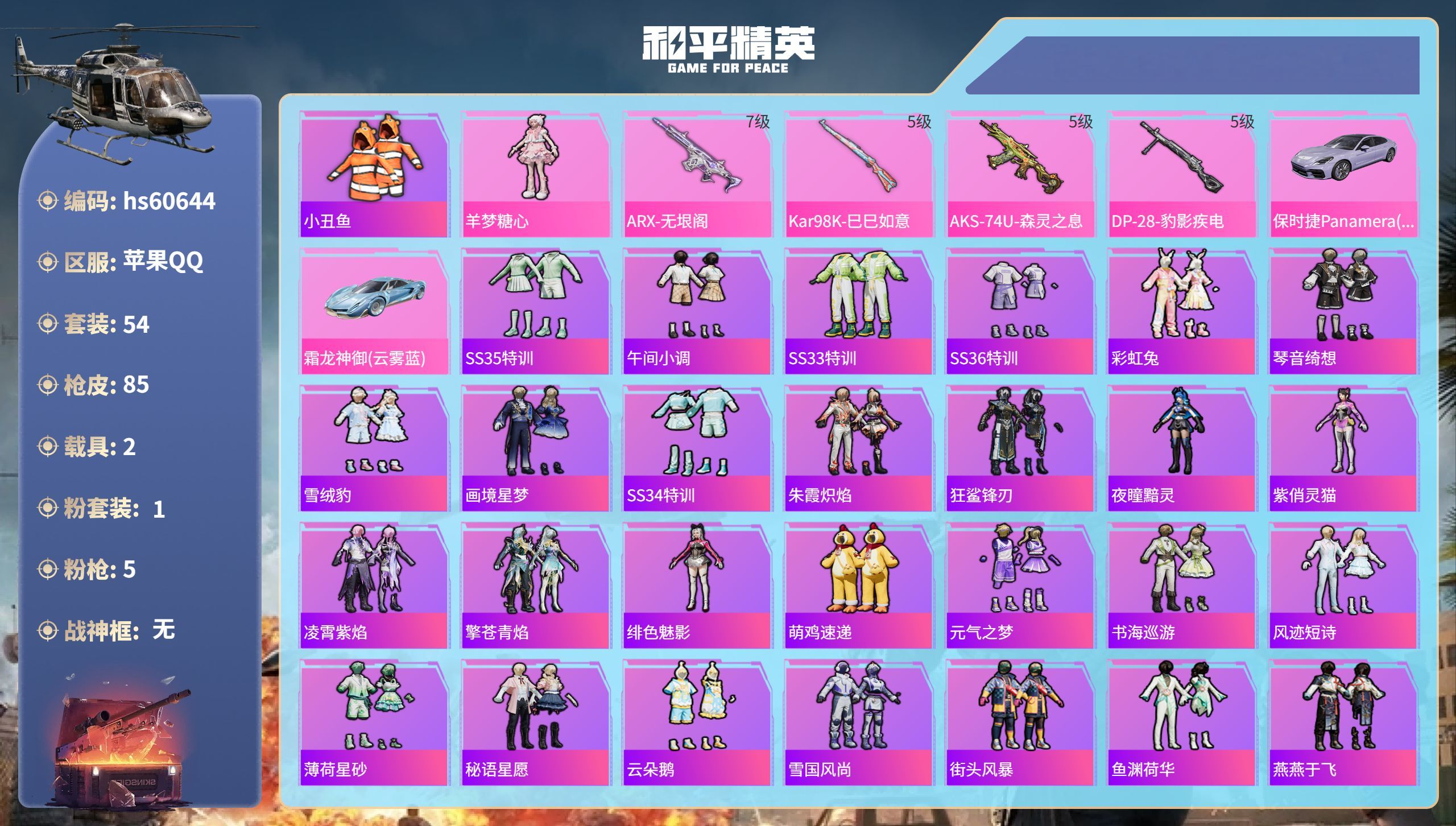 hs60644 苹果手Q-2王牌印记-1粉装-5特效枪-2载具-26224热力值-54套装-85枪皮