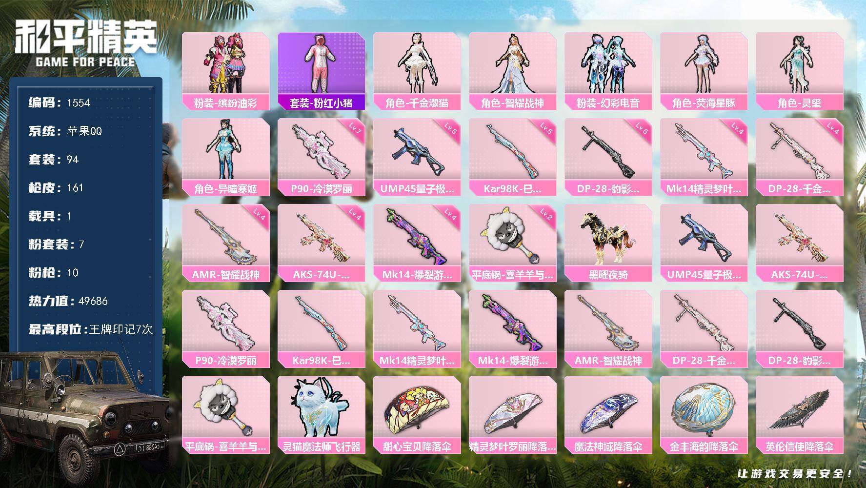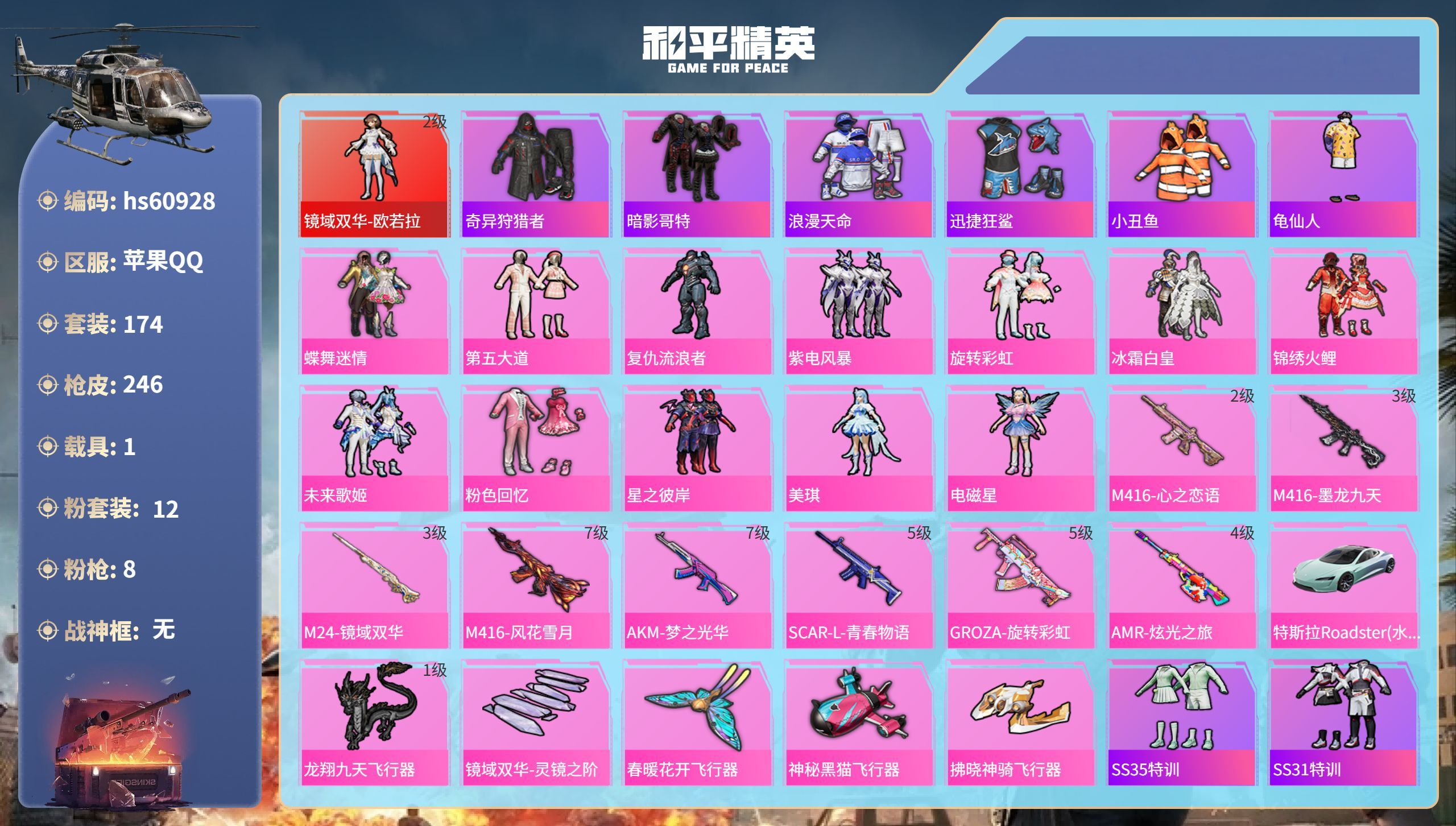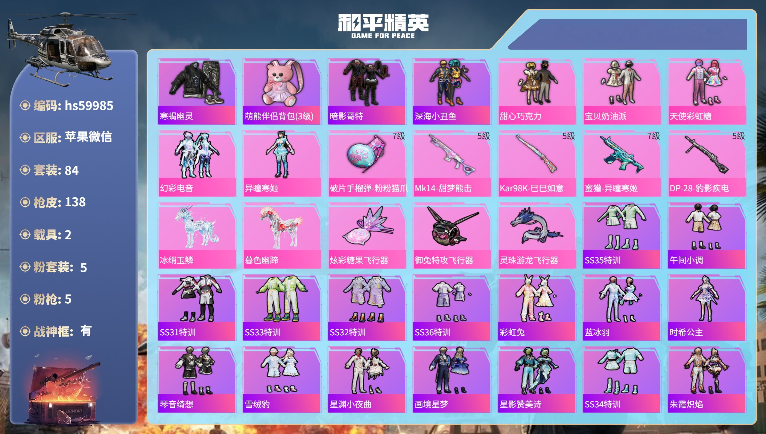 hs59985 苹果微-6王牌印记-有战神框-5粉装-5特效枪-2载具-41680热力值-84套装