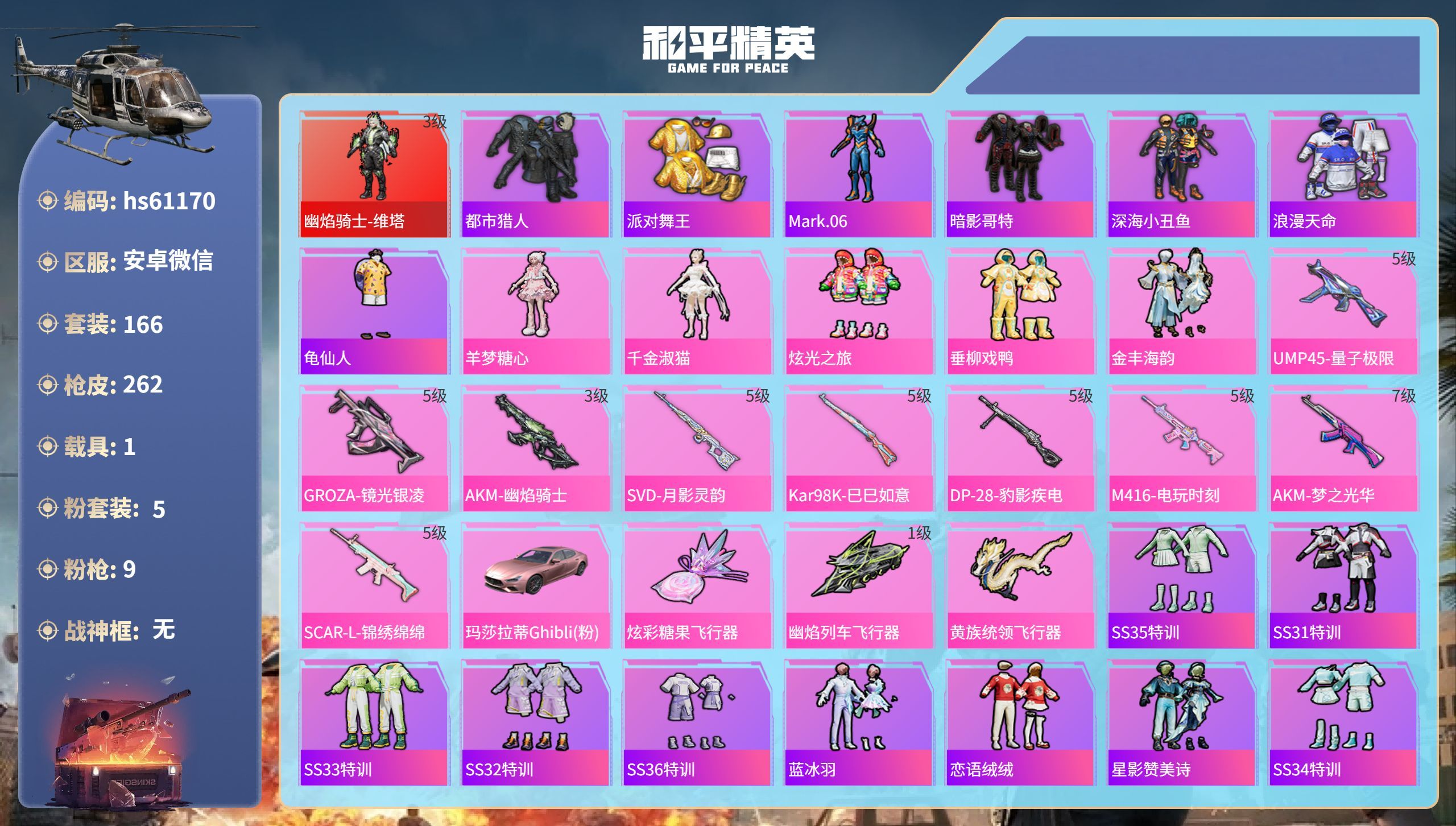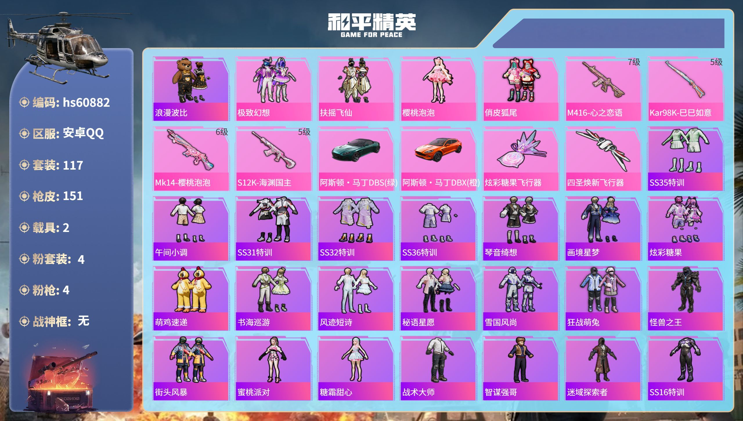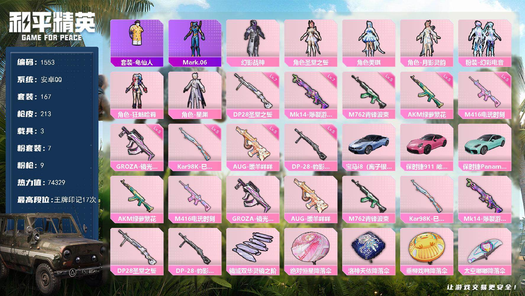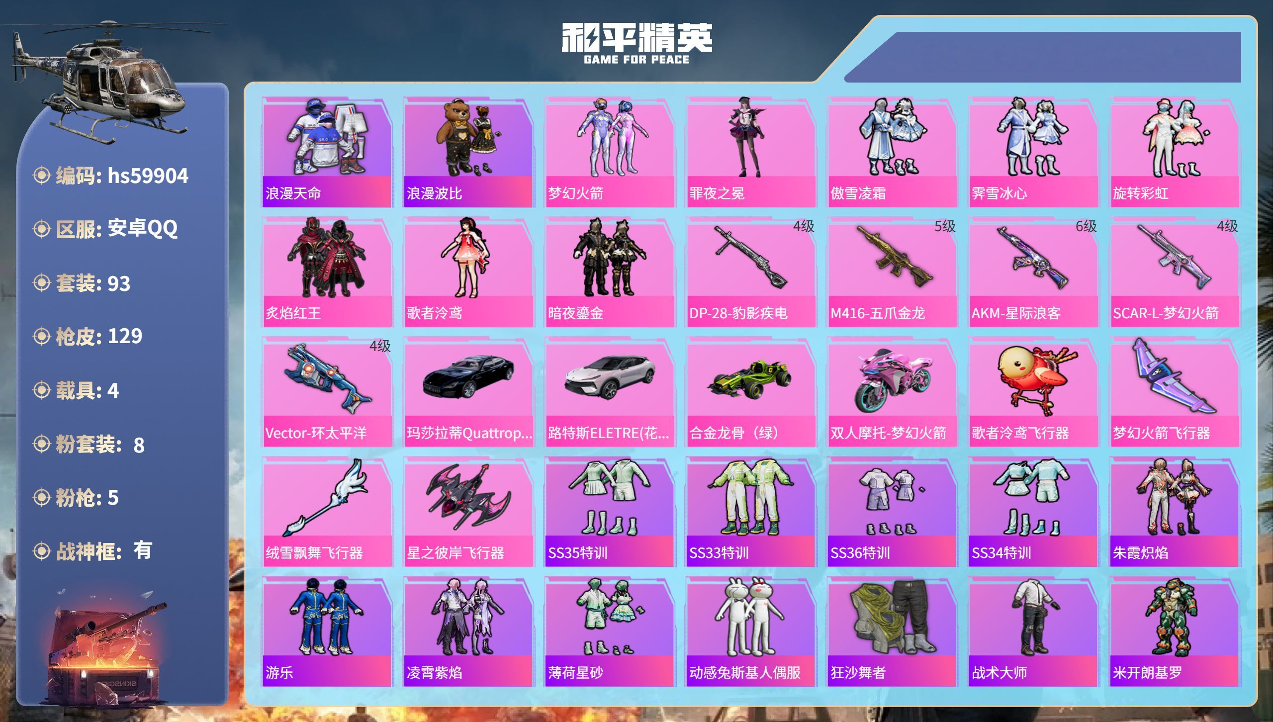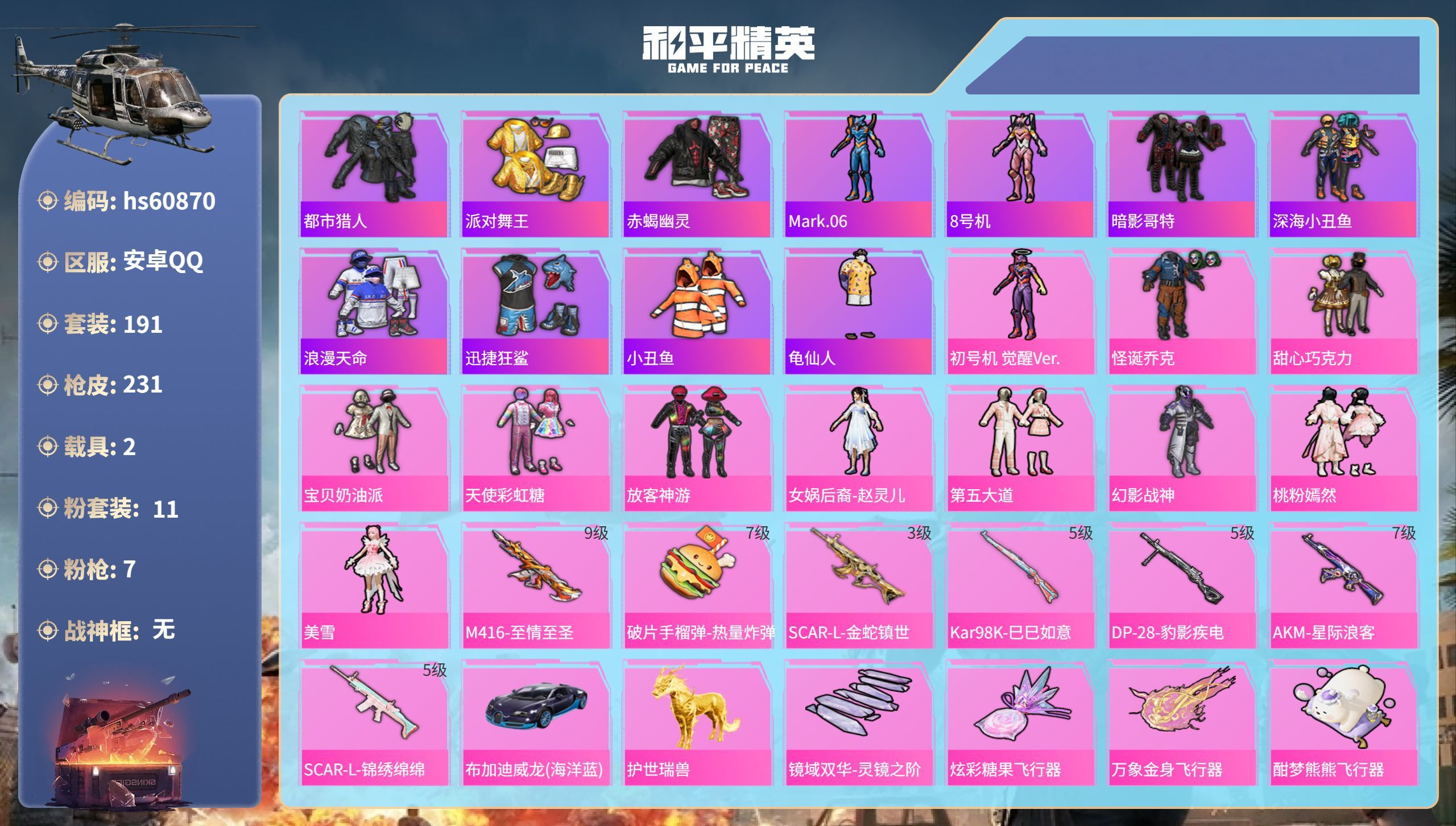 hs60870 安卓手Q-16王牌印记-11粉装-7特效枪-2载具-74636热力值-191套装-2