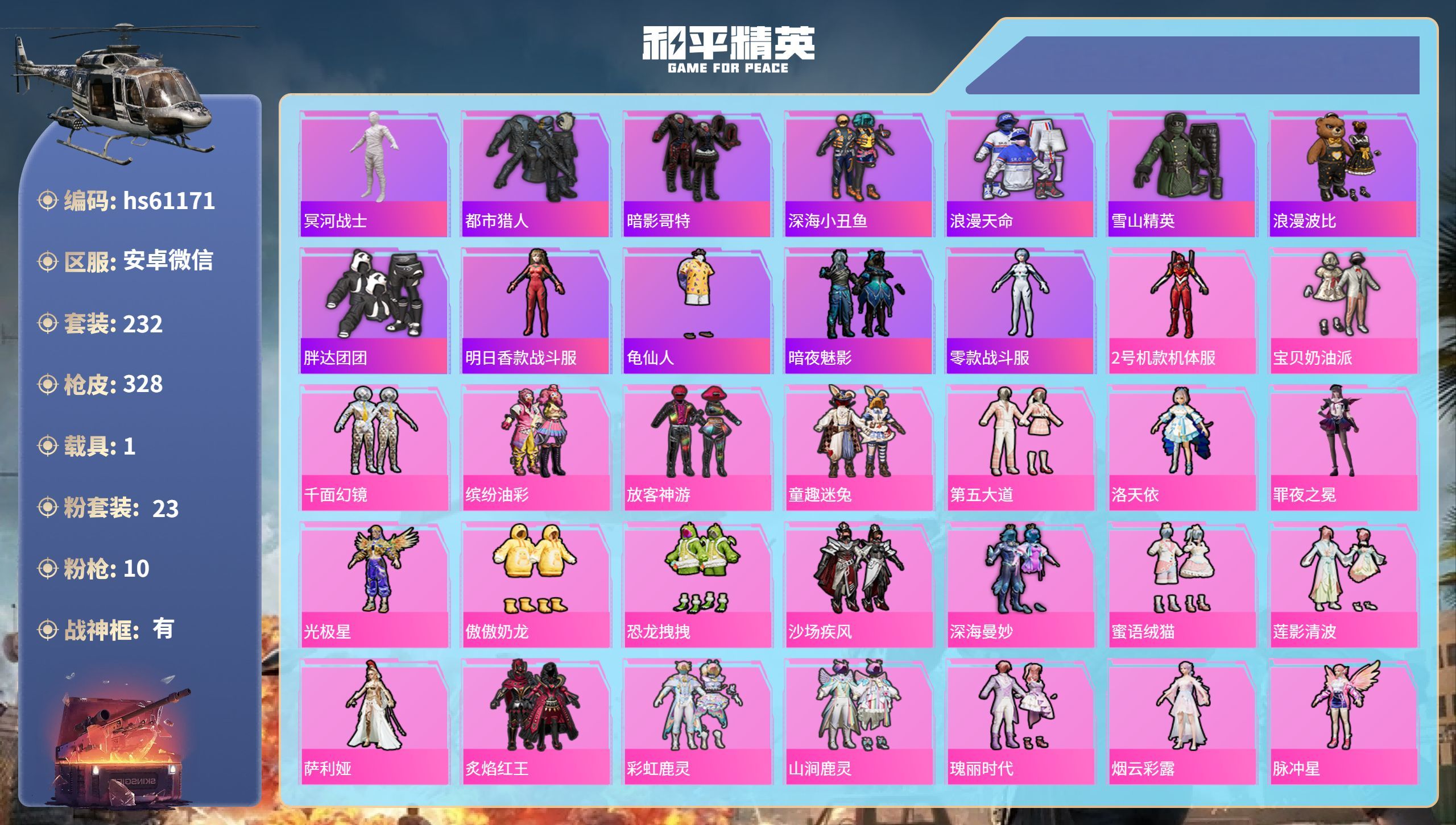 hs61171 安卓微-22王牌印记-有战神框-23粉装-10特效枪-1载具-115474热力值-
