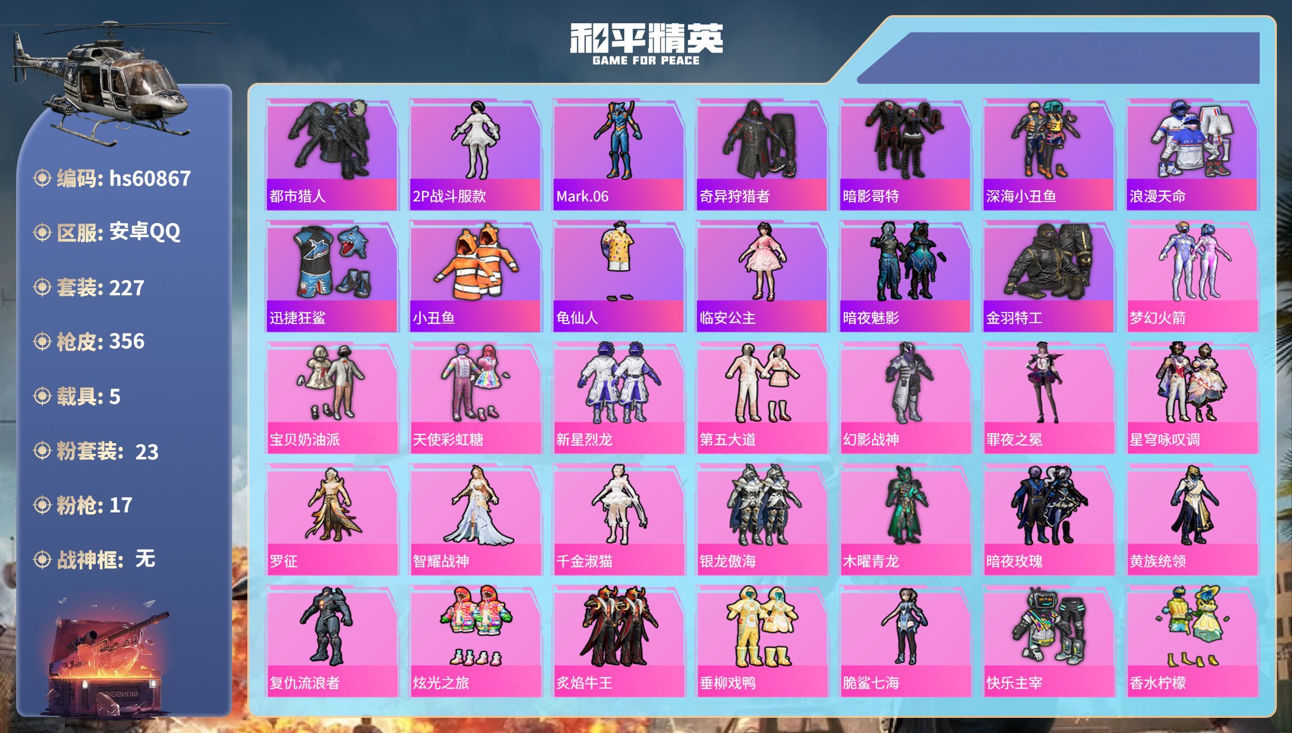 hs60867 安卓手Q-14王牌印记-23粉装-17特效枪-5载具-126480热力值-227套装