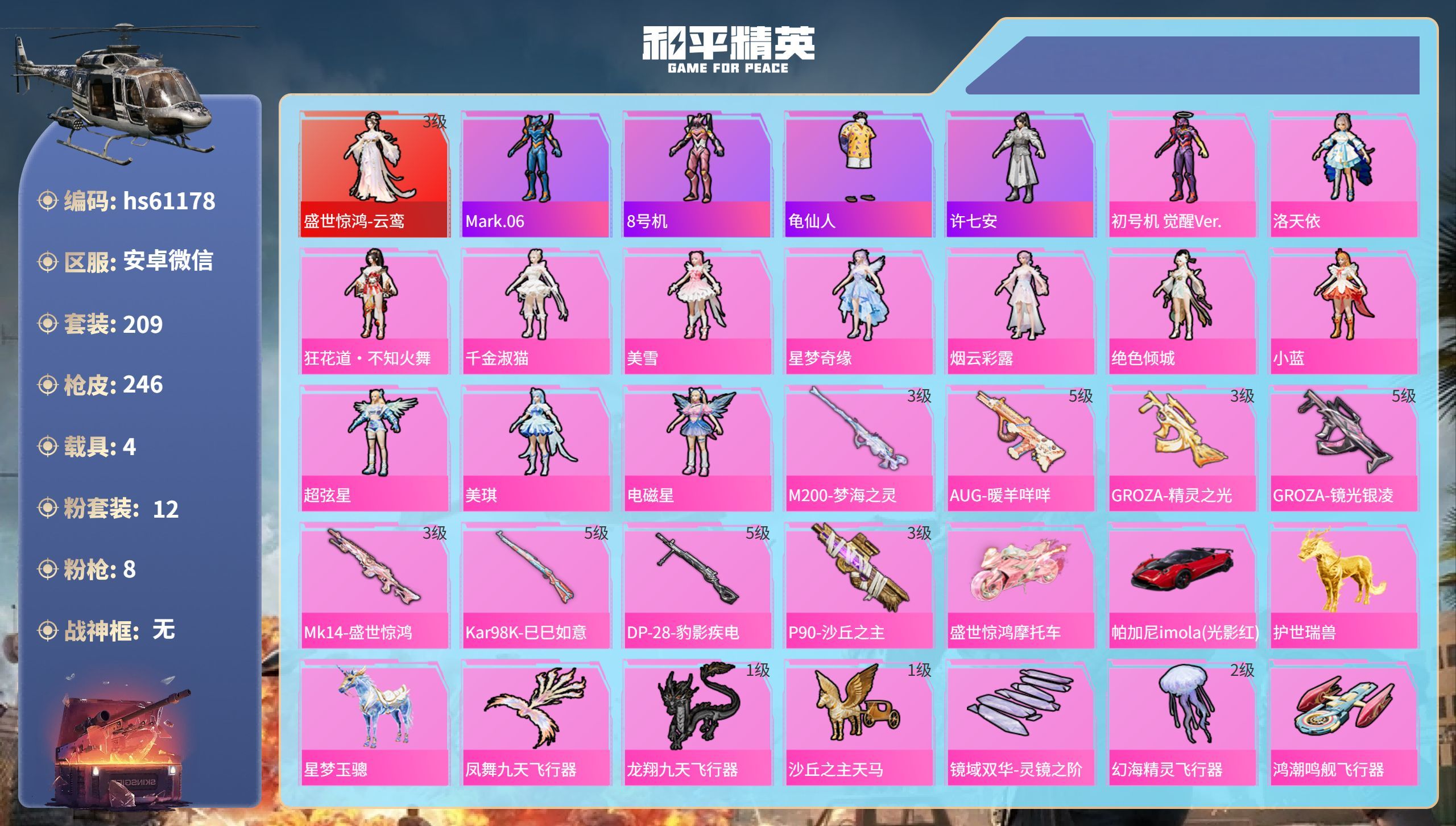 hs61178 安卓微-15王牌印记-1红装-12粉装-8特效枪-4载具-90912热力值-209