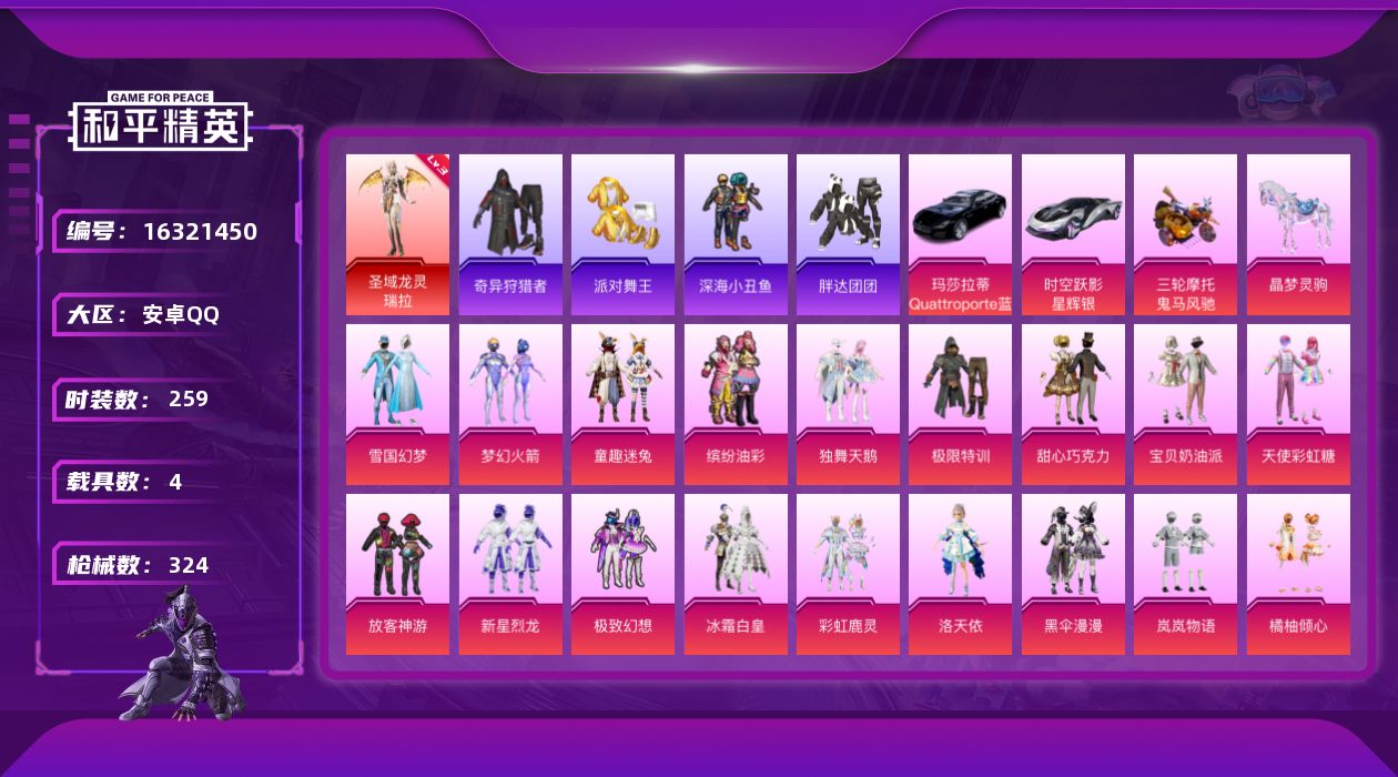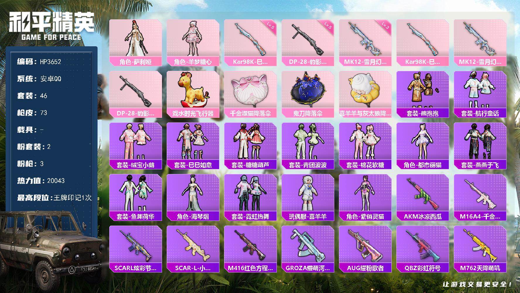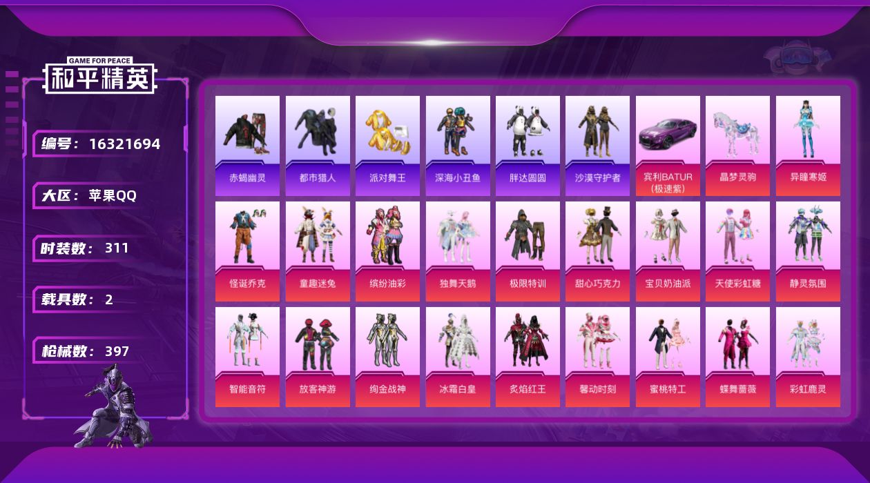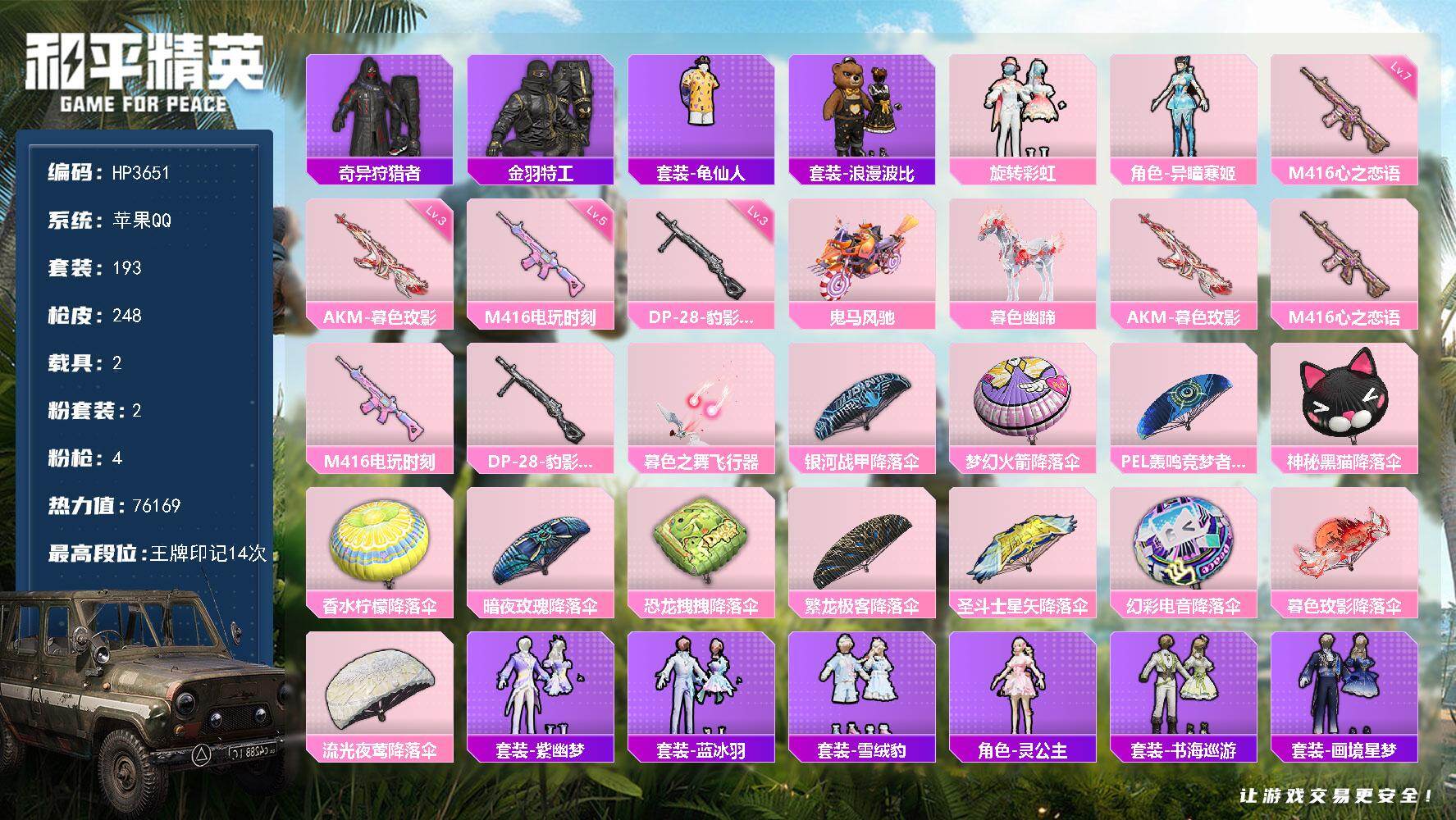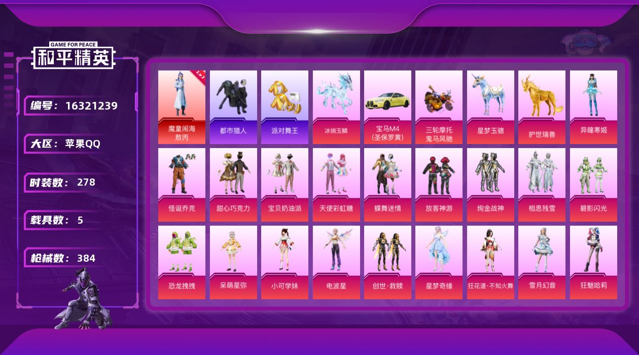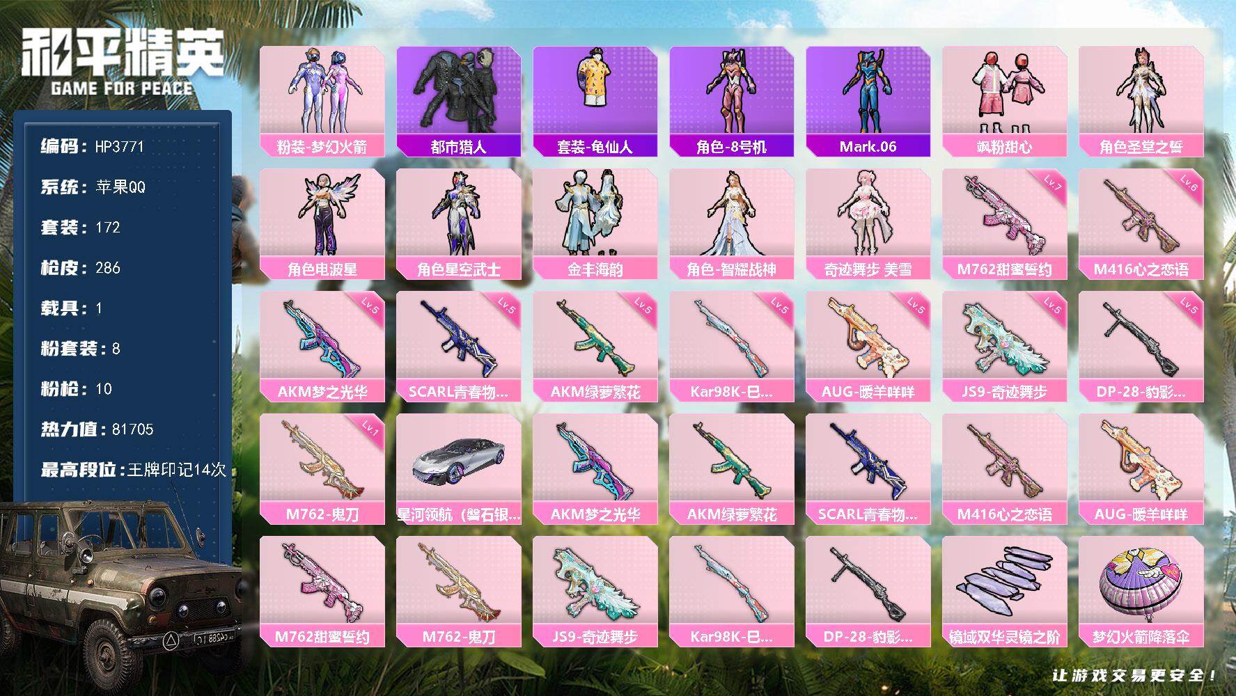 a4270/苹果QQ/2王牌印记-7粉装-6特效枪-2载具-71726热力值-172套装-221枪皮