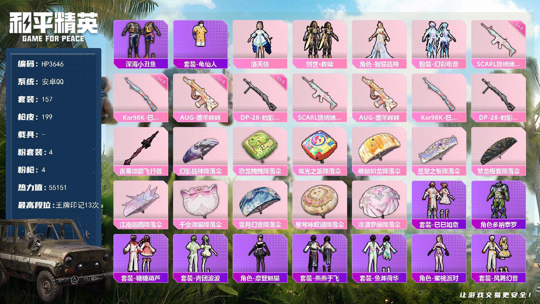 安卓 手Q-4粉装-4特效枪-0载具-1粉色飞行器-55151热力值-13王牌