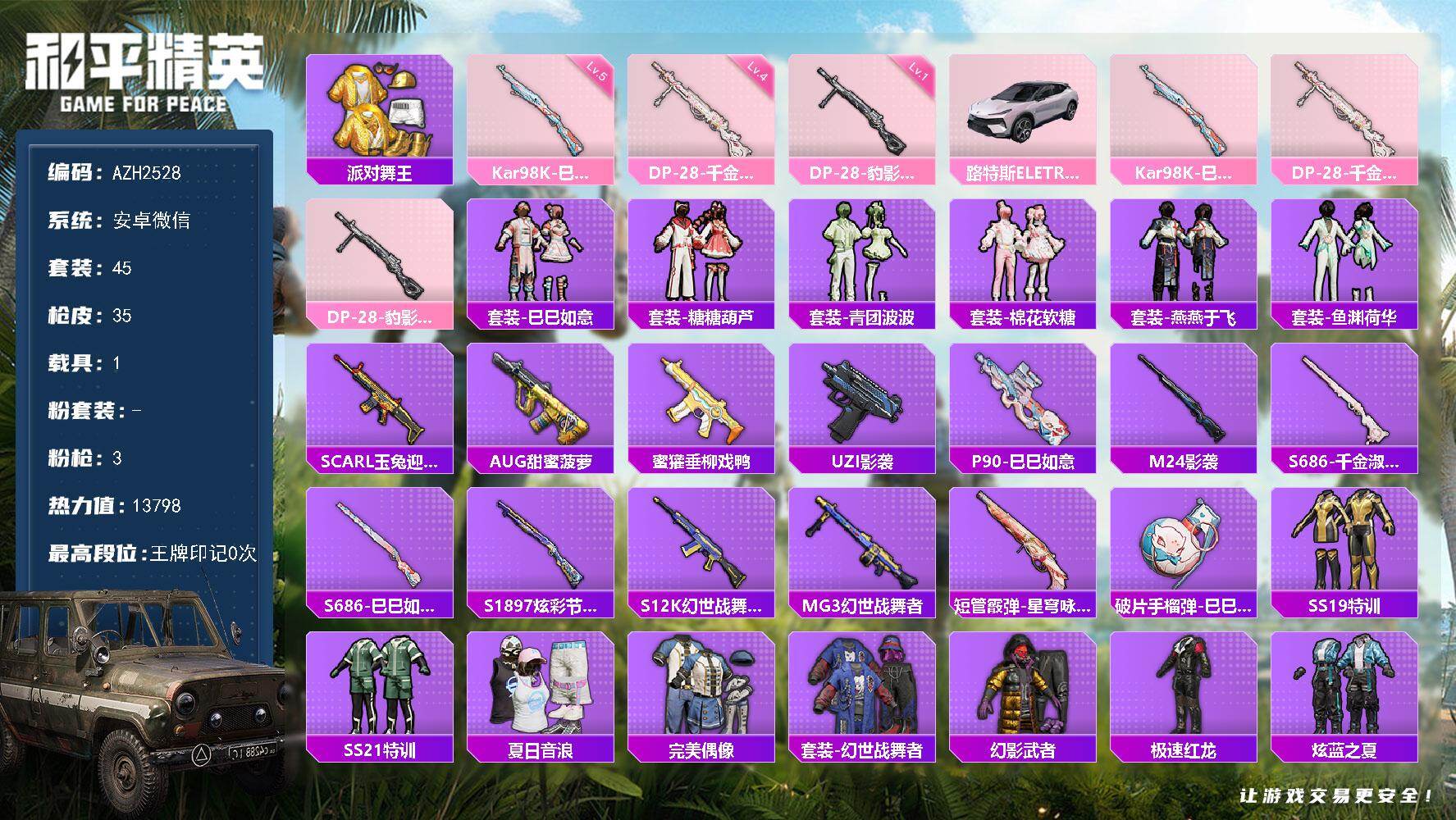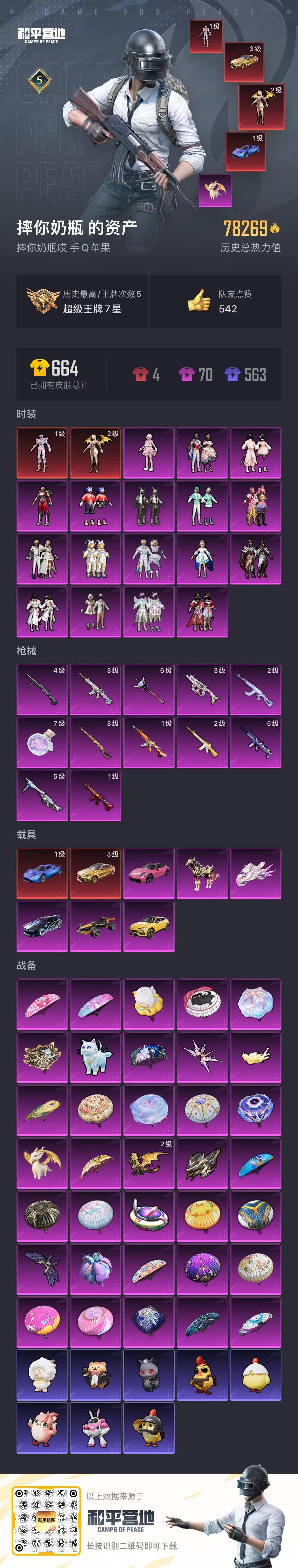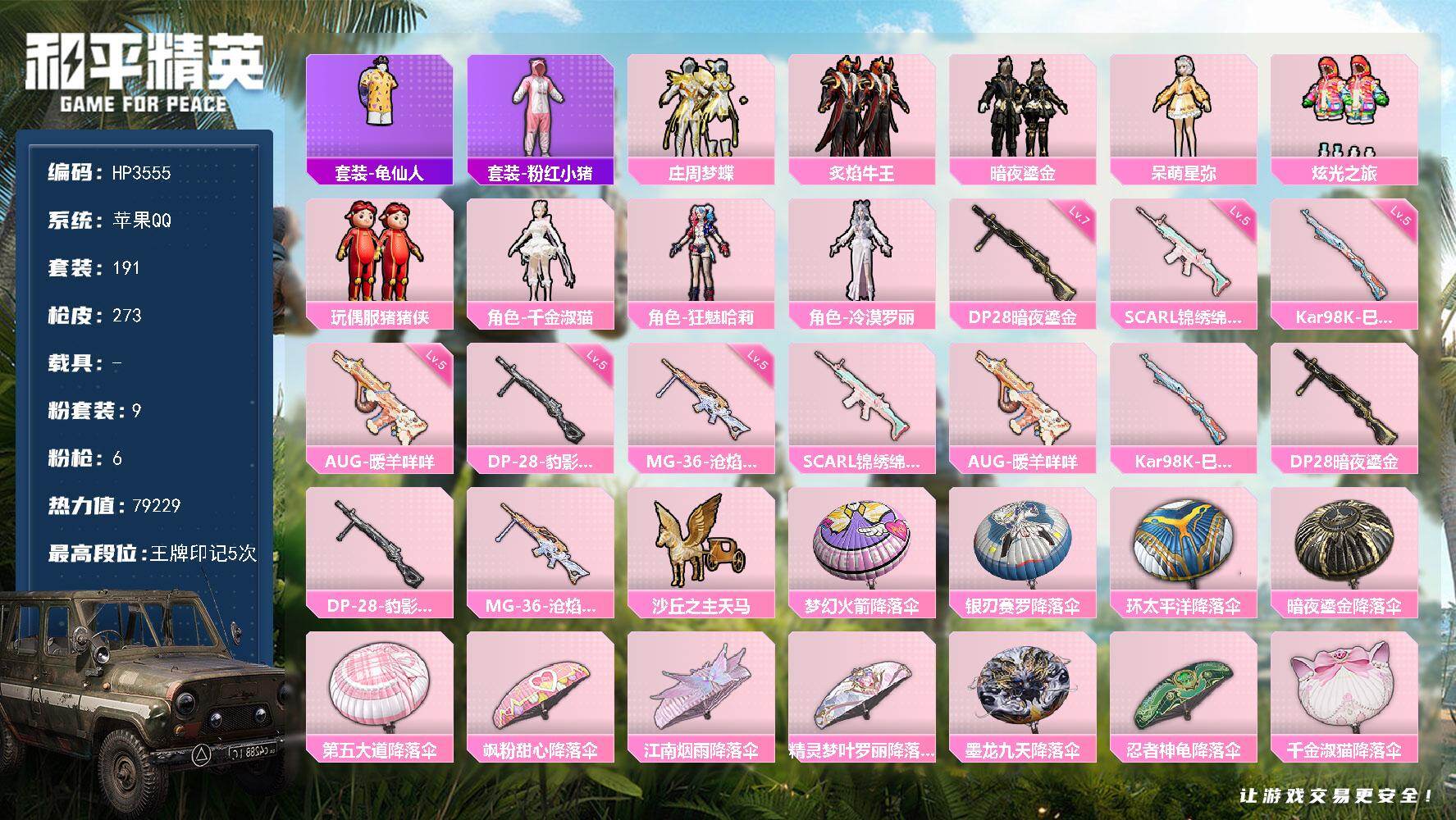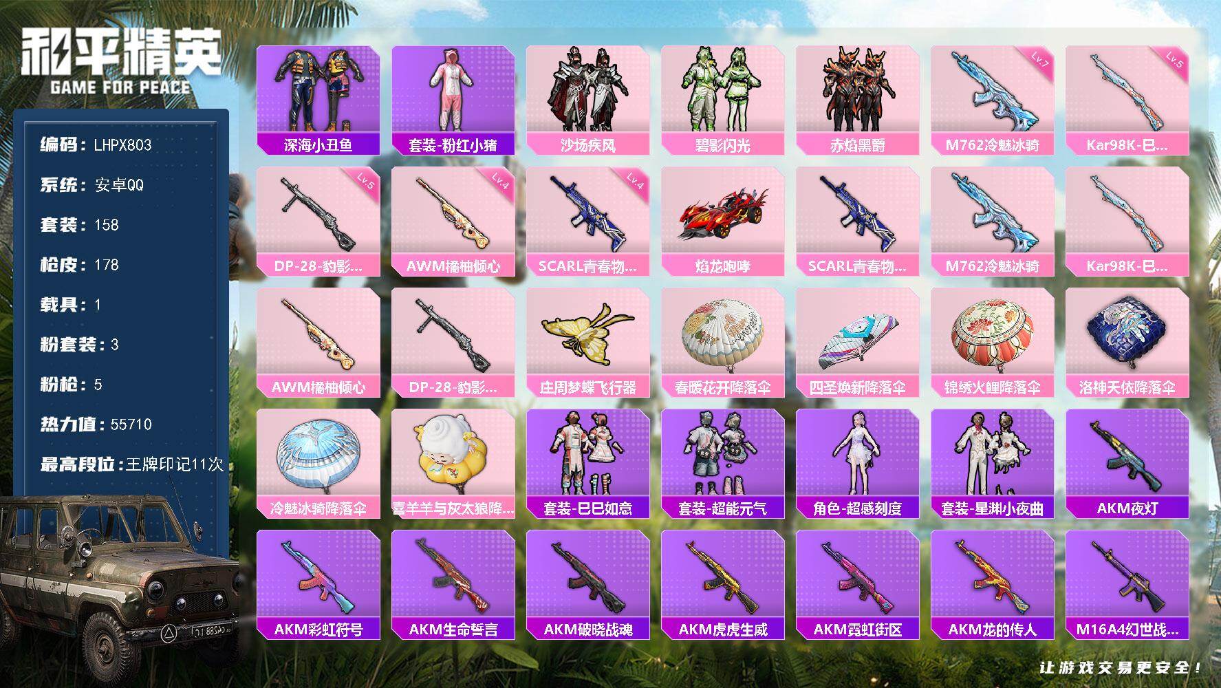 安卓QQ-无二次包人脸-9王牌印记-9粉装-5红装-20特效枪-8载具-110644热力值-战备72