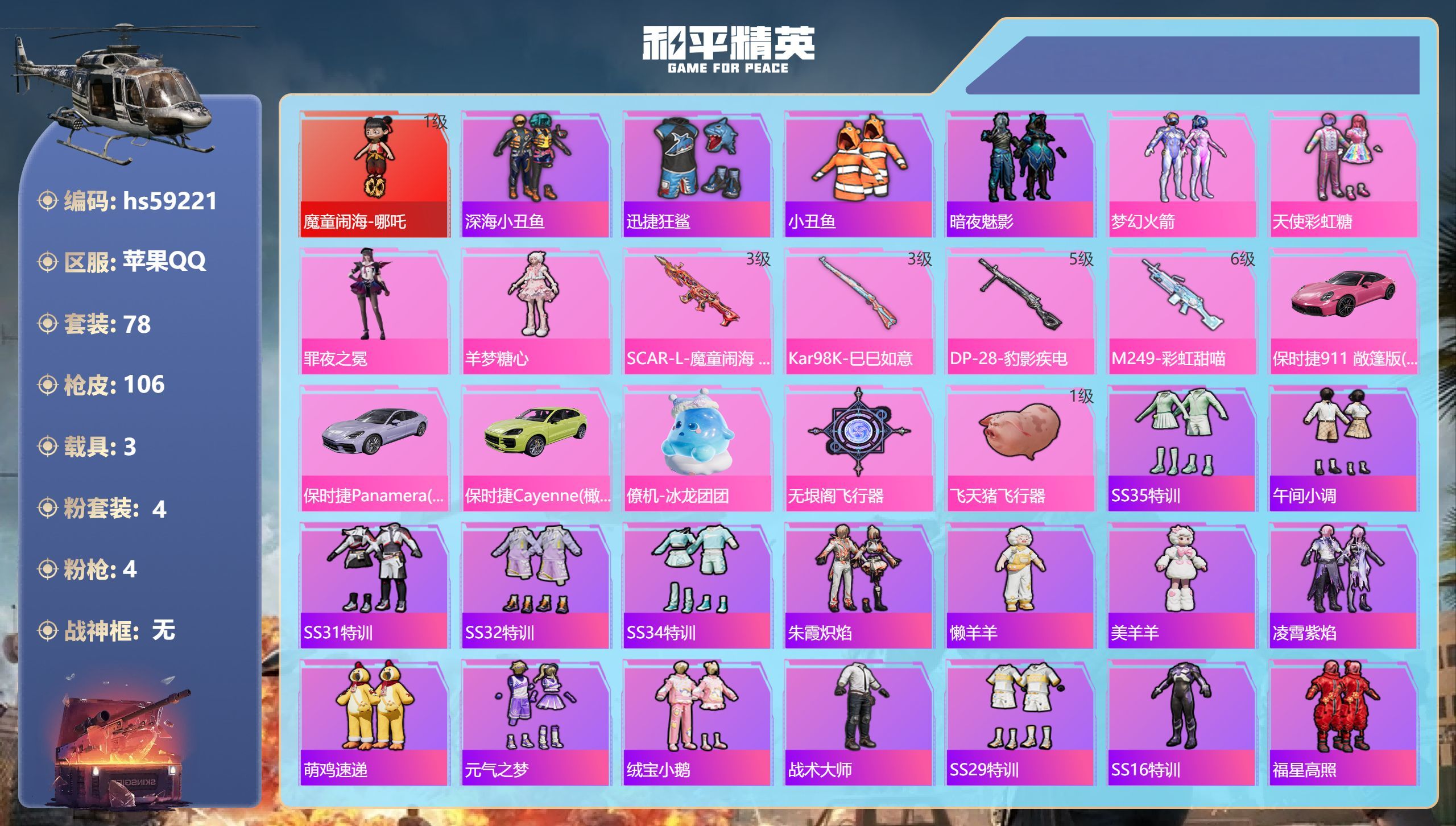hs59221 苹果手Q-6王牌印记-1红装-4粉装-4特效枪-3载具-38682热力值-78套装-