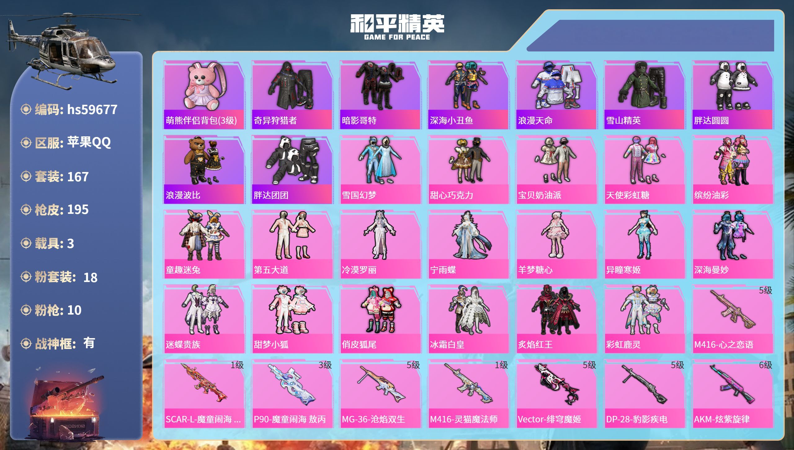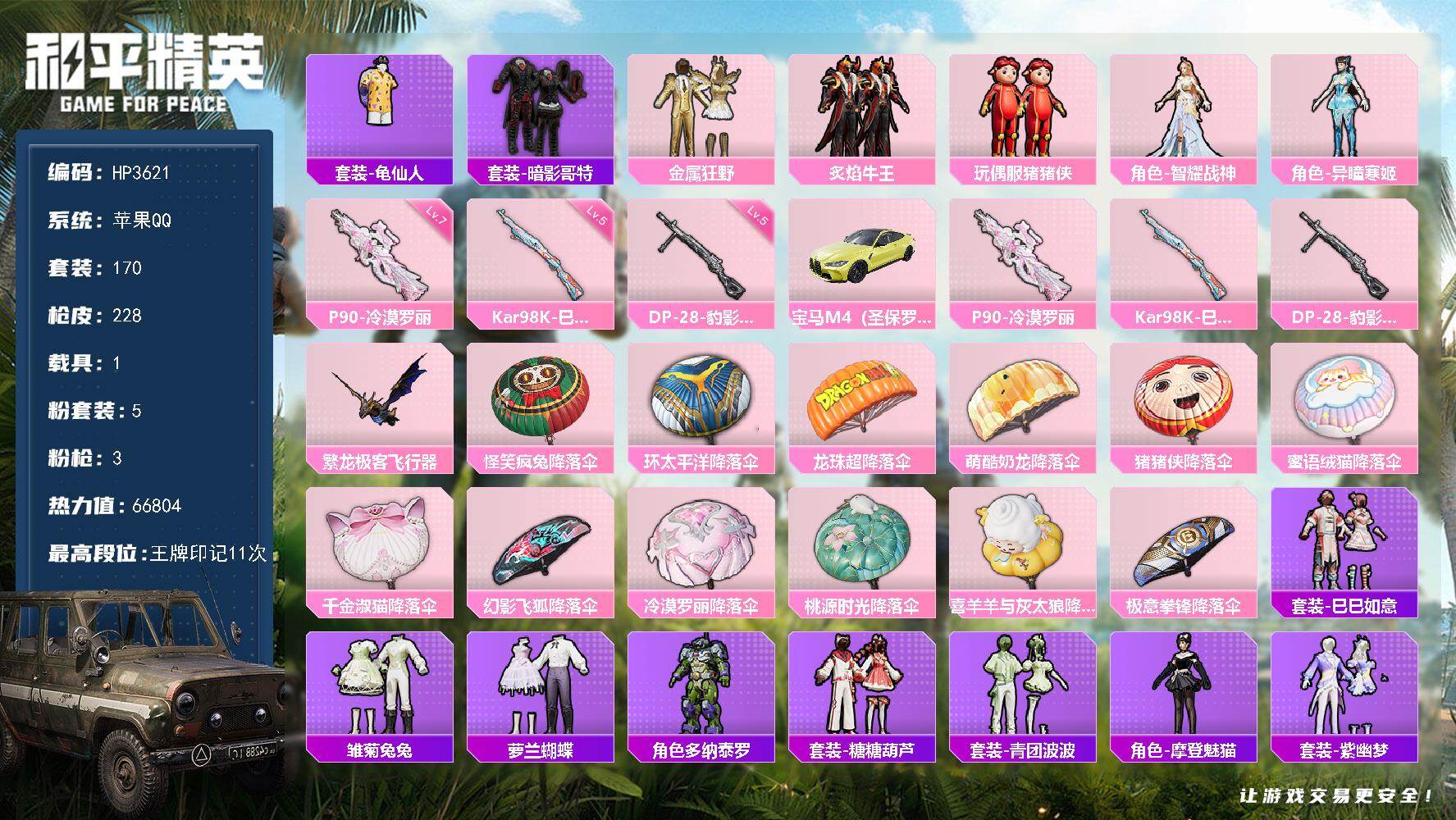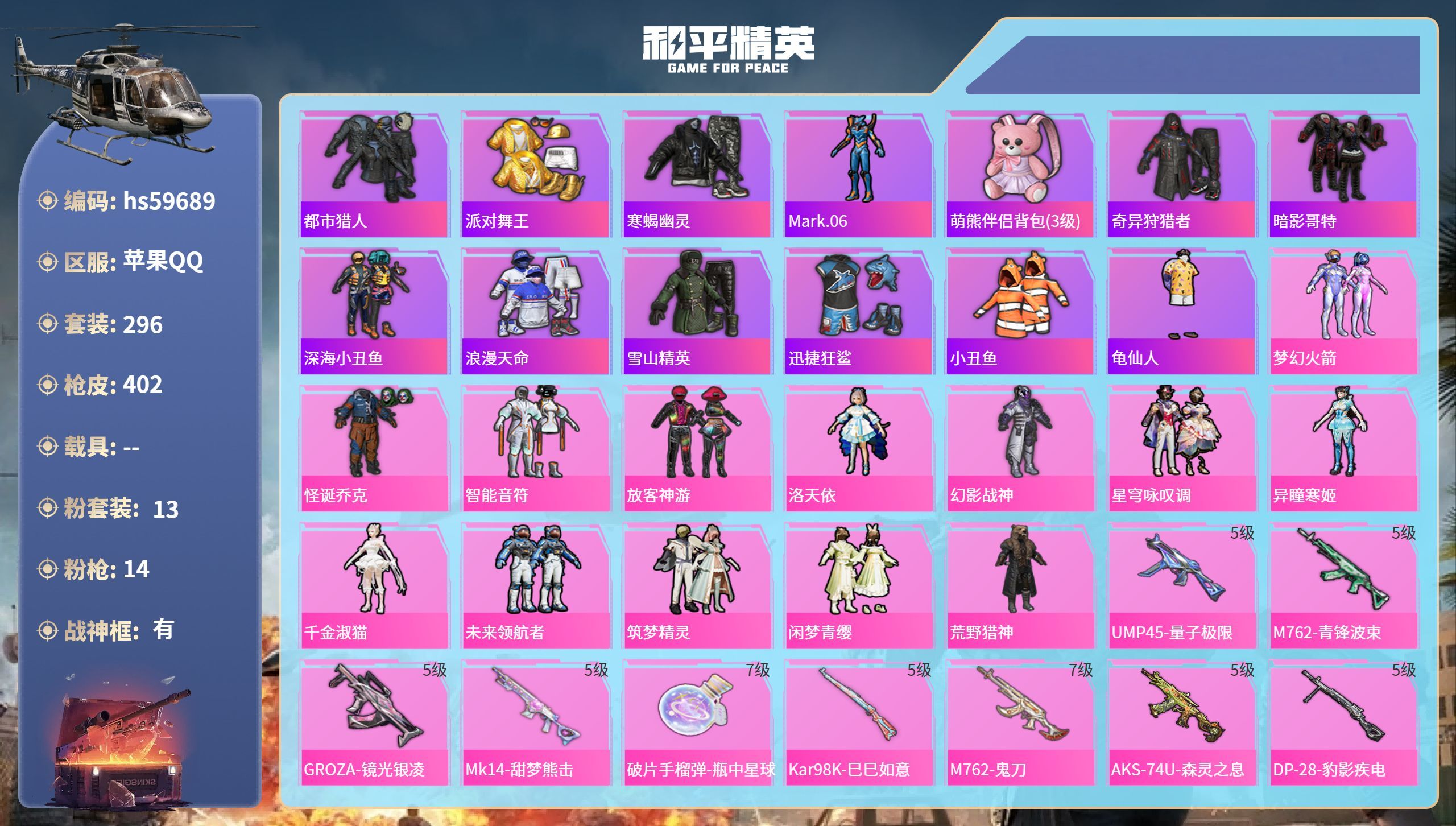 hs59689 苹果手Q-24王牌印记-有战神框-13粉装-14特效枪-127226热力值-296套