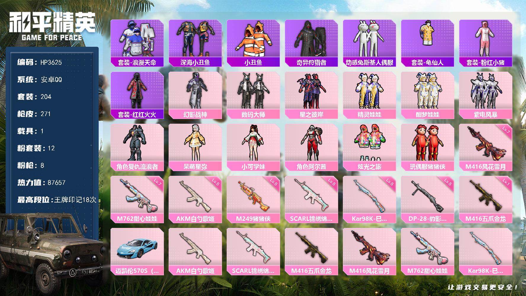 安卓 手Q-12粉装-8特效枪-1载具-1粉色飞行器-87657热力值-18王