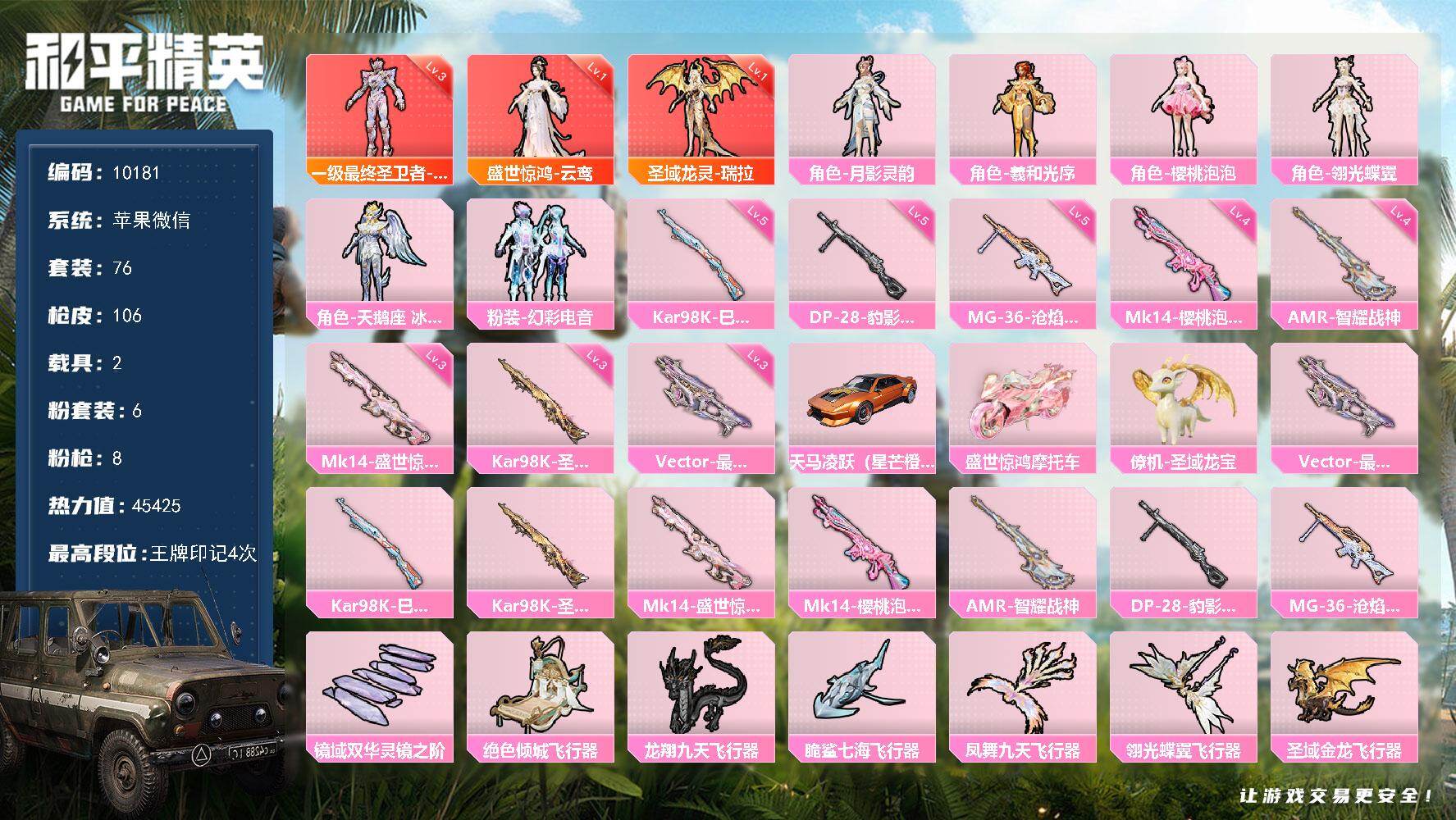 苹果 微信-3神装-6粉装-8特效枪-2载具-9粉色飞行器-45425热力值-