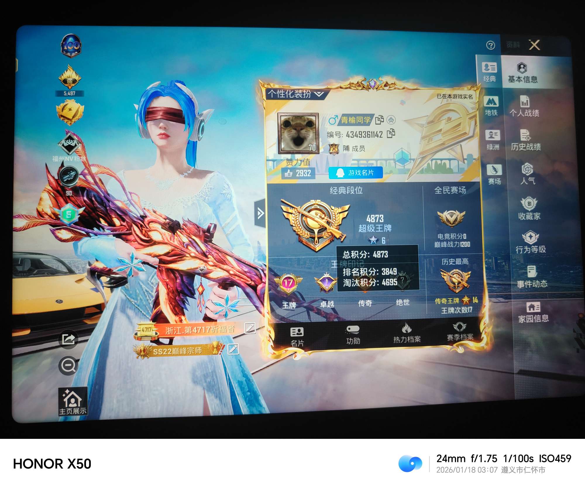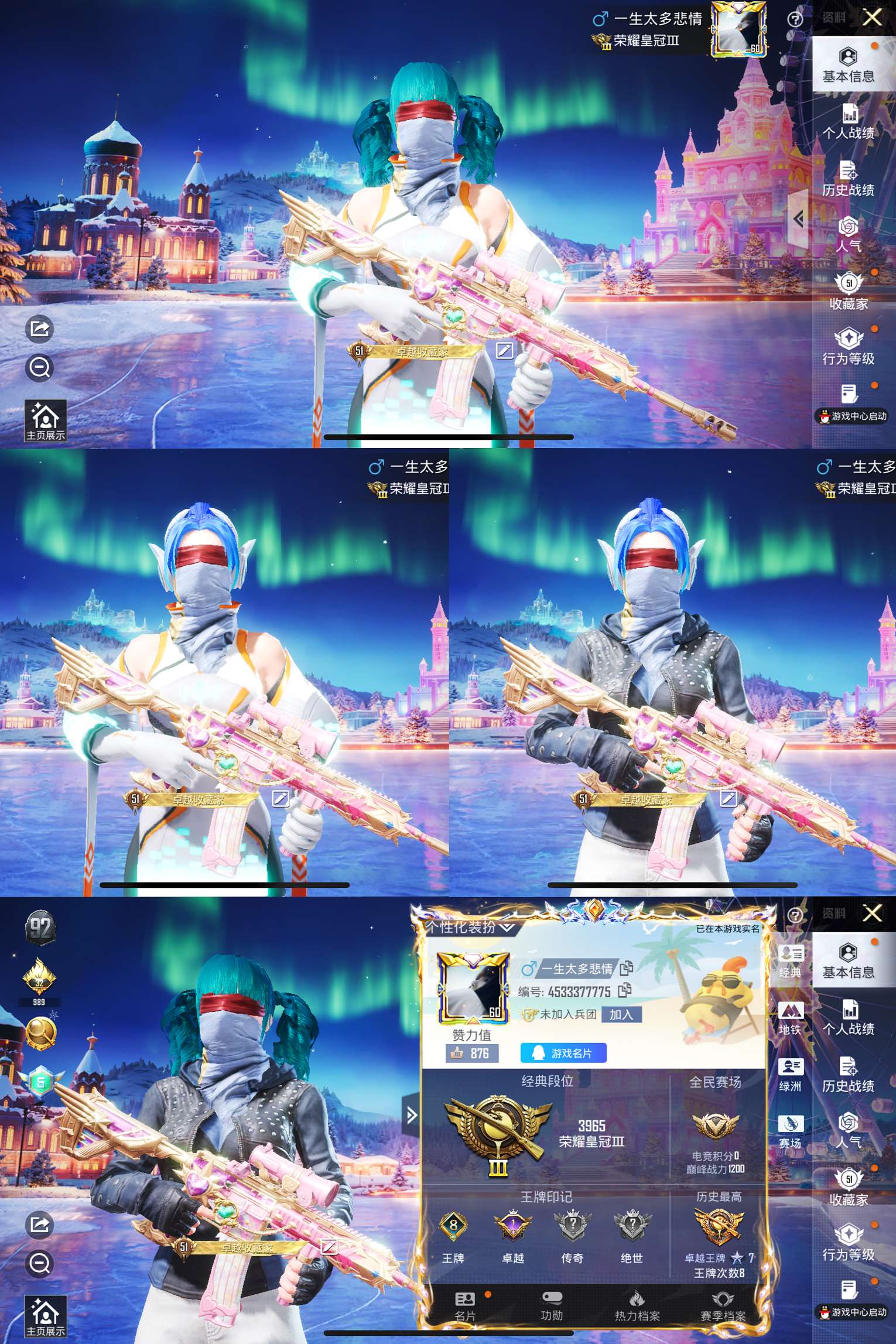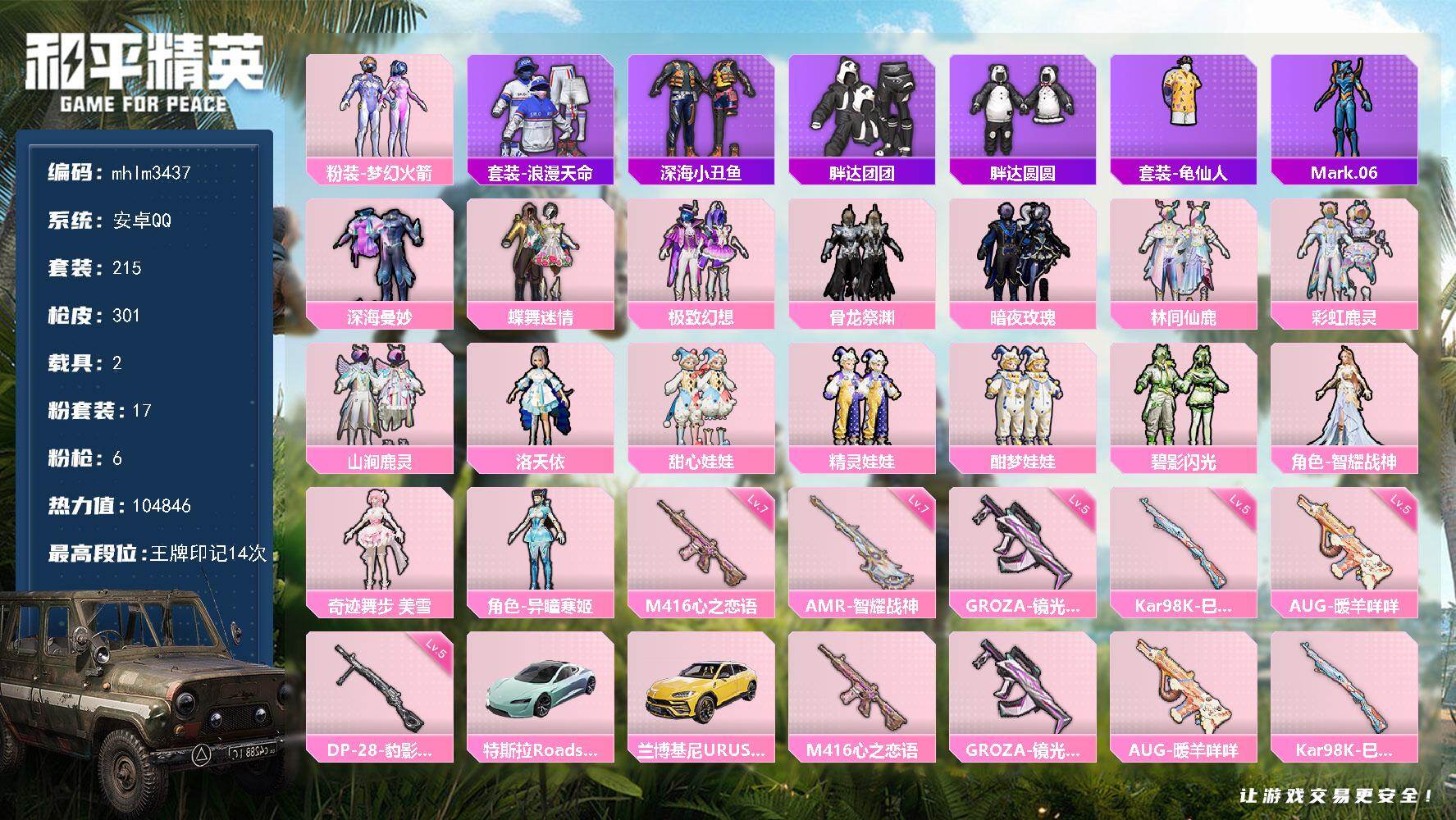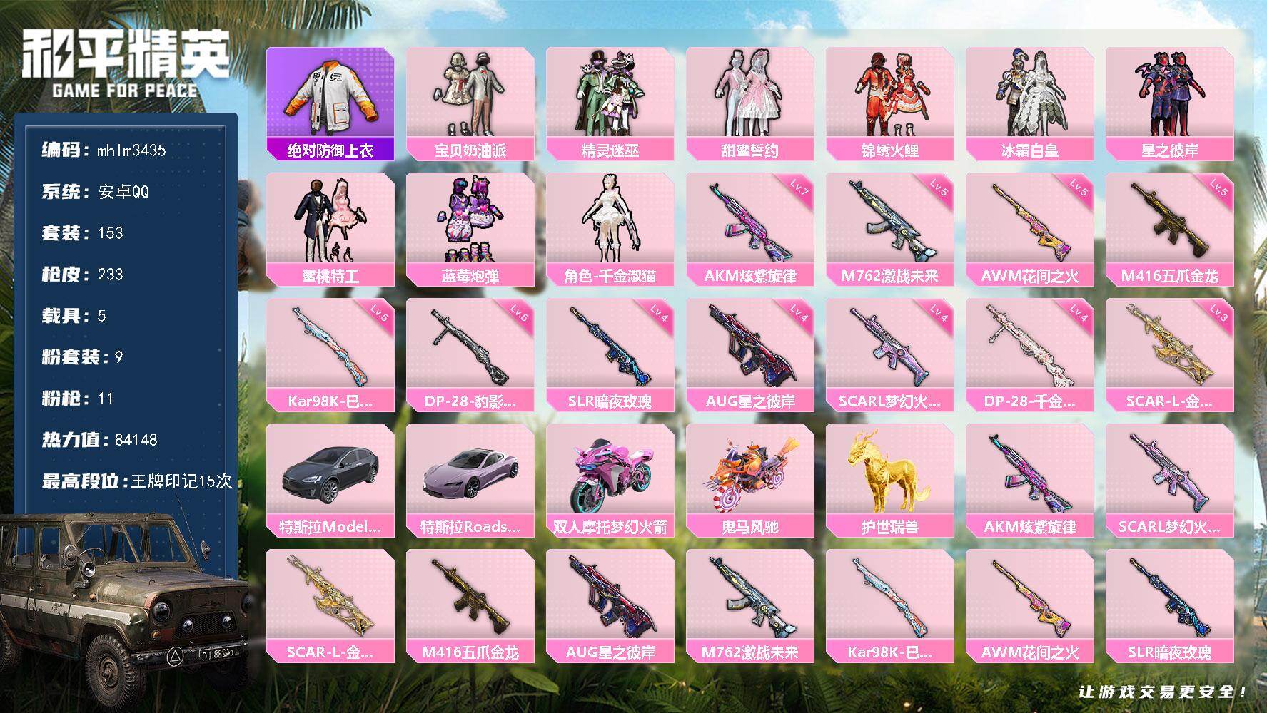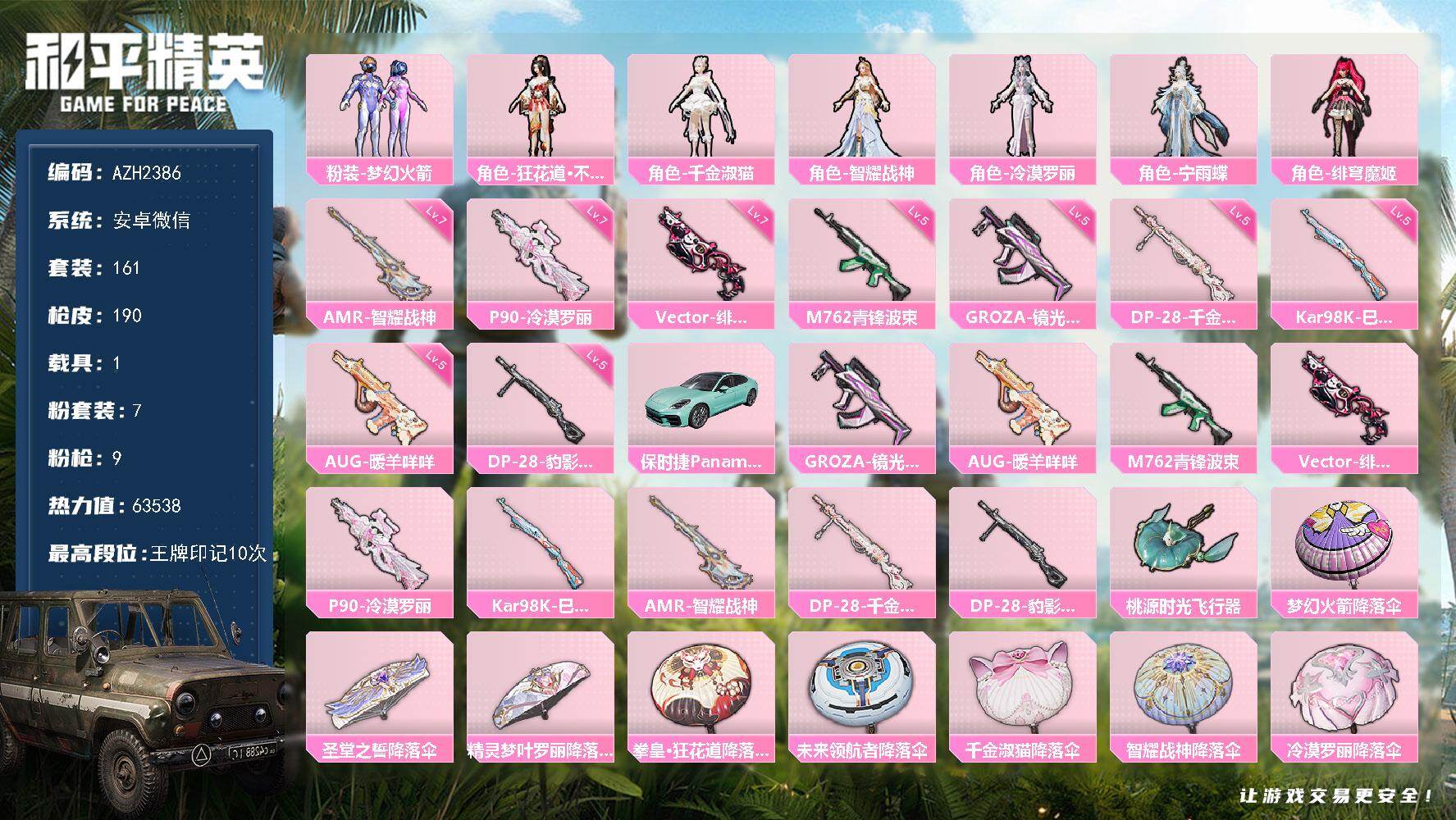 安卓 手Q-5粉装-4特效枪-0载具-3粉色飞行器-49830热力值-6王牌印