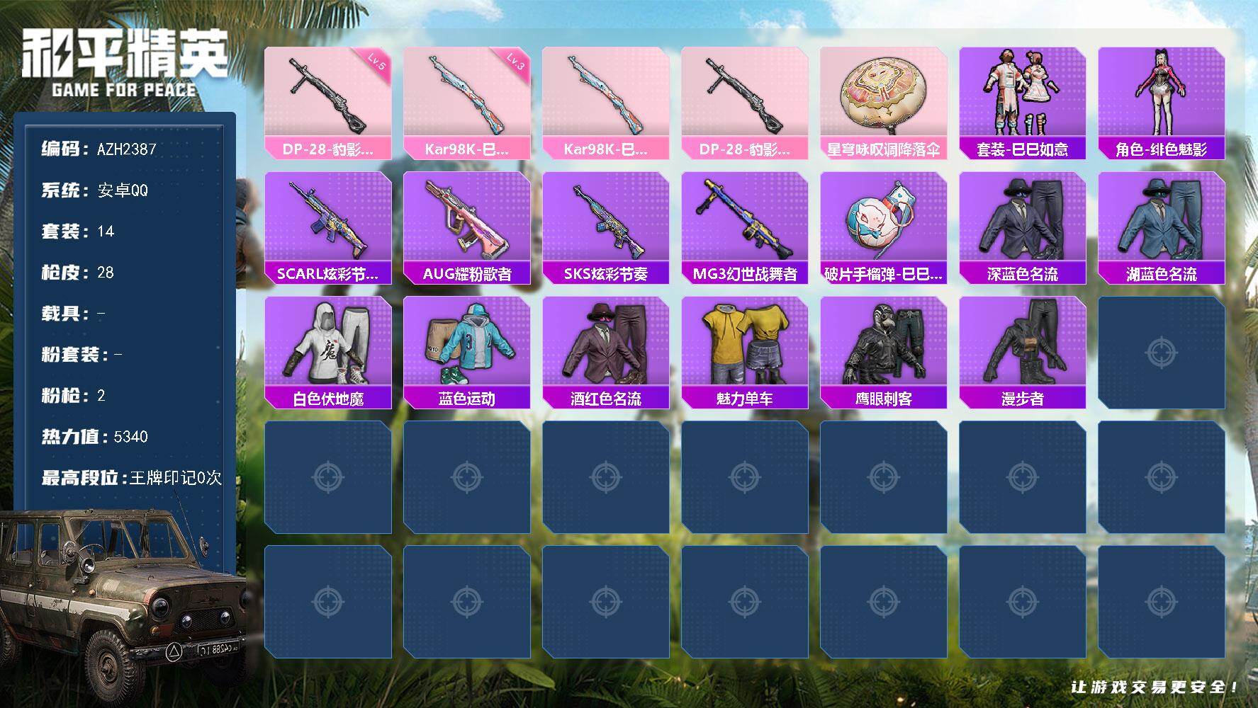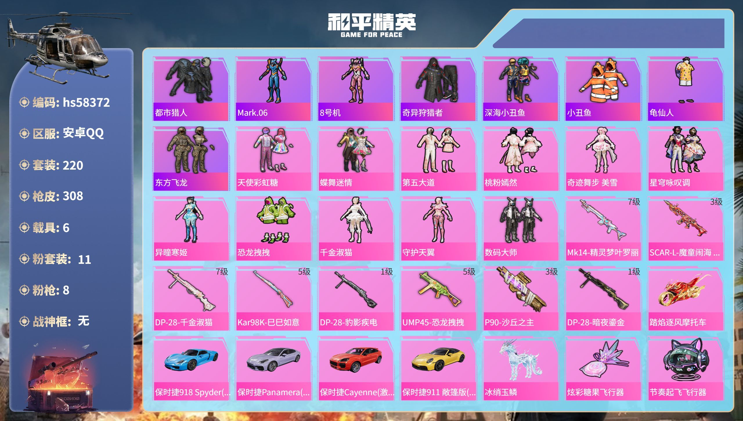 hs58372 安卓手Q-17王牌印记-11粉装-8特效枪-6载具-109649热力值-220套装-