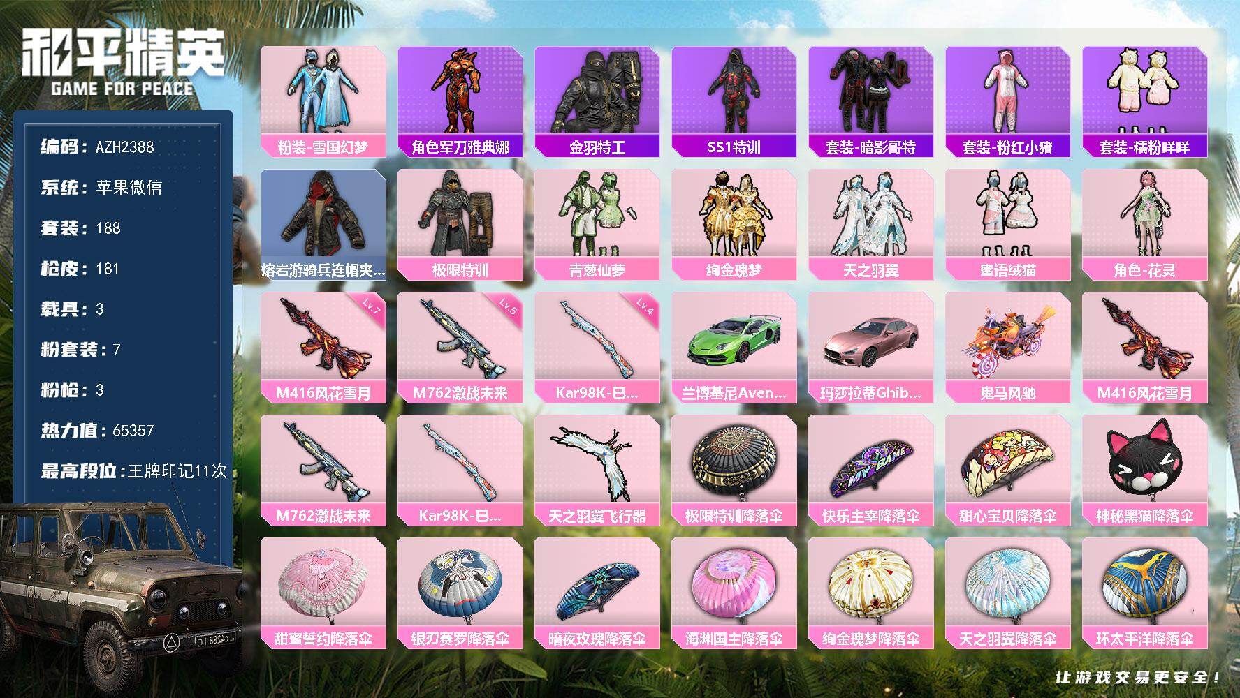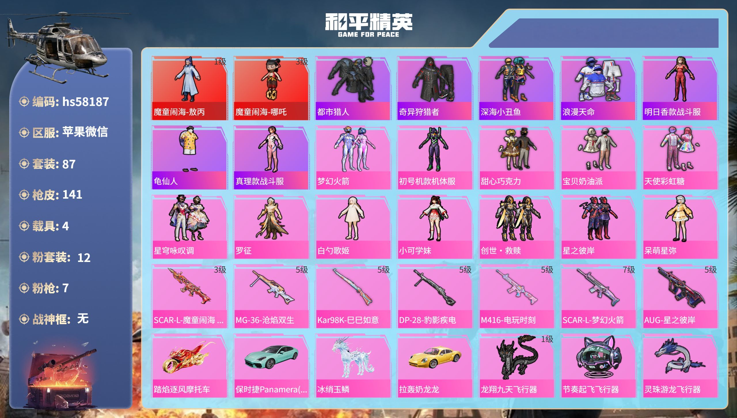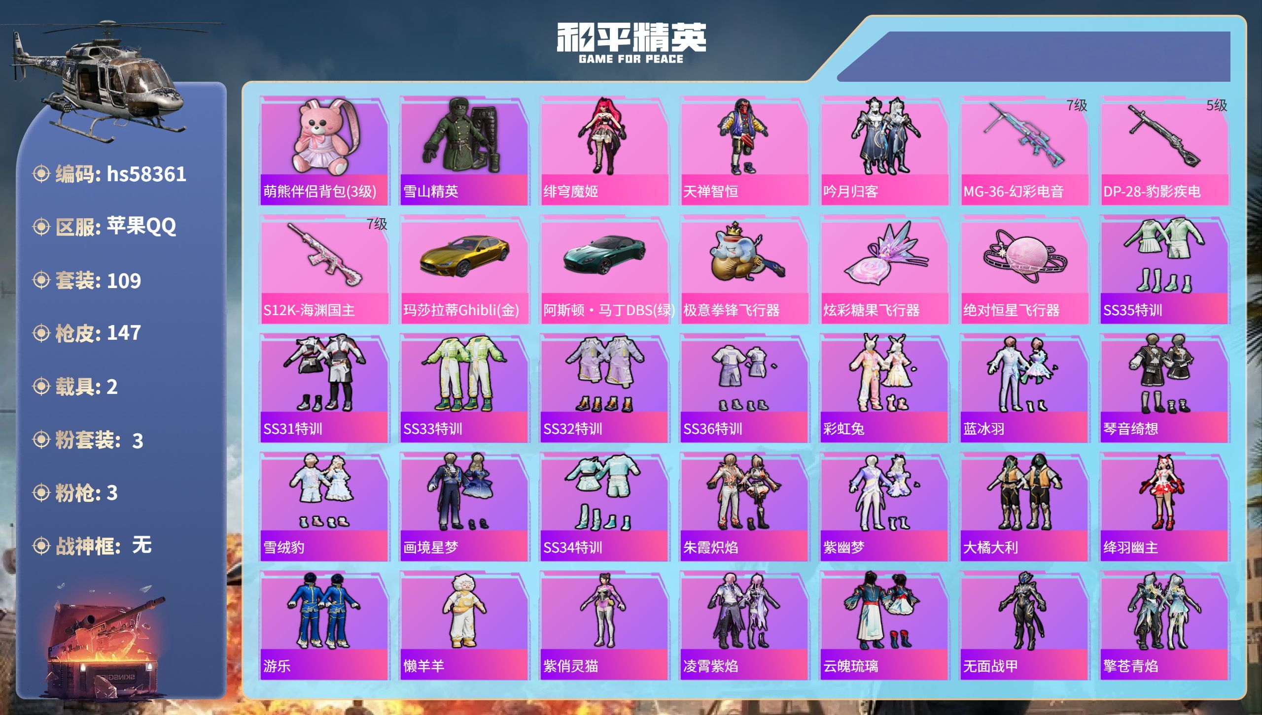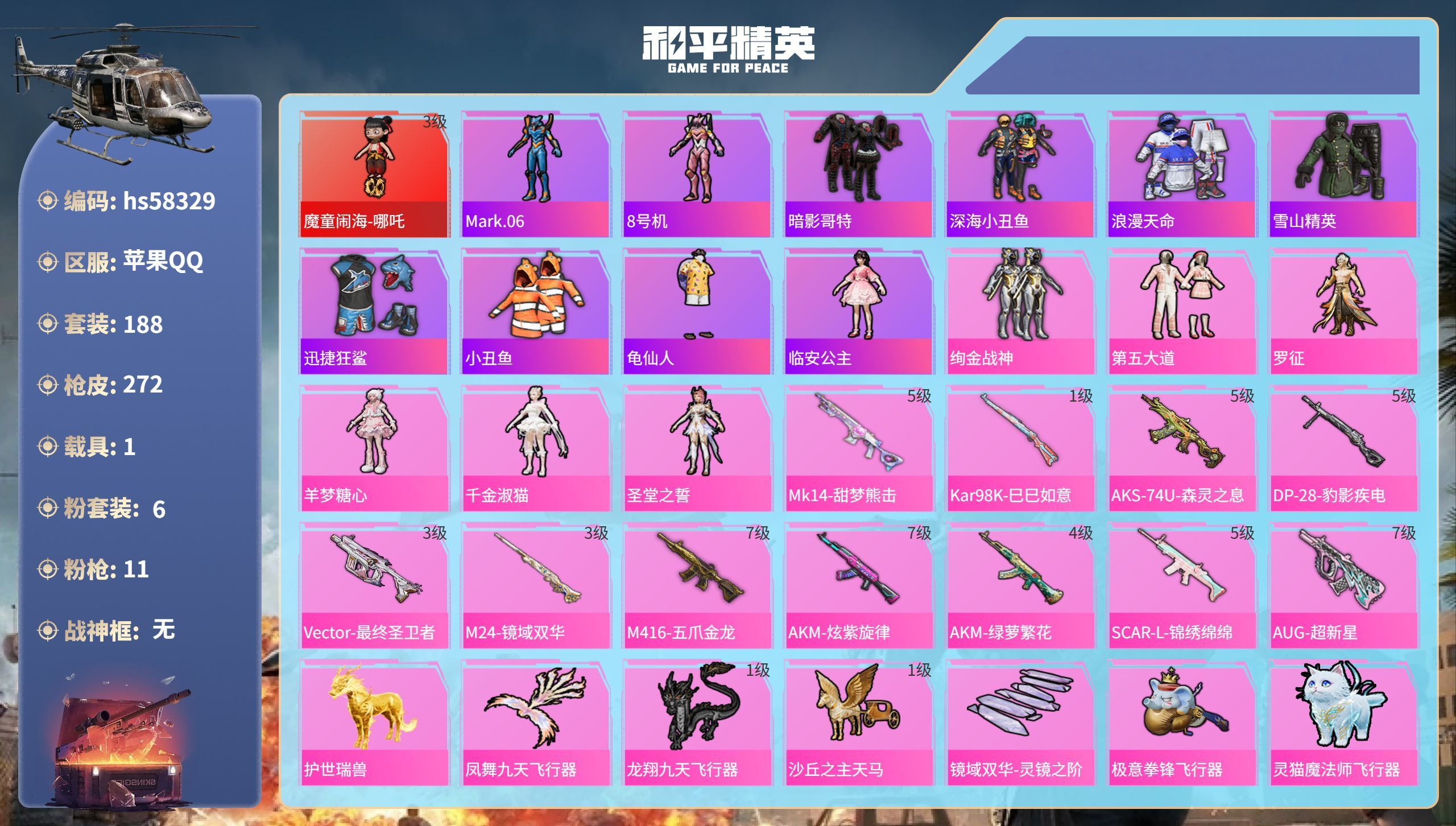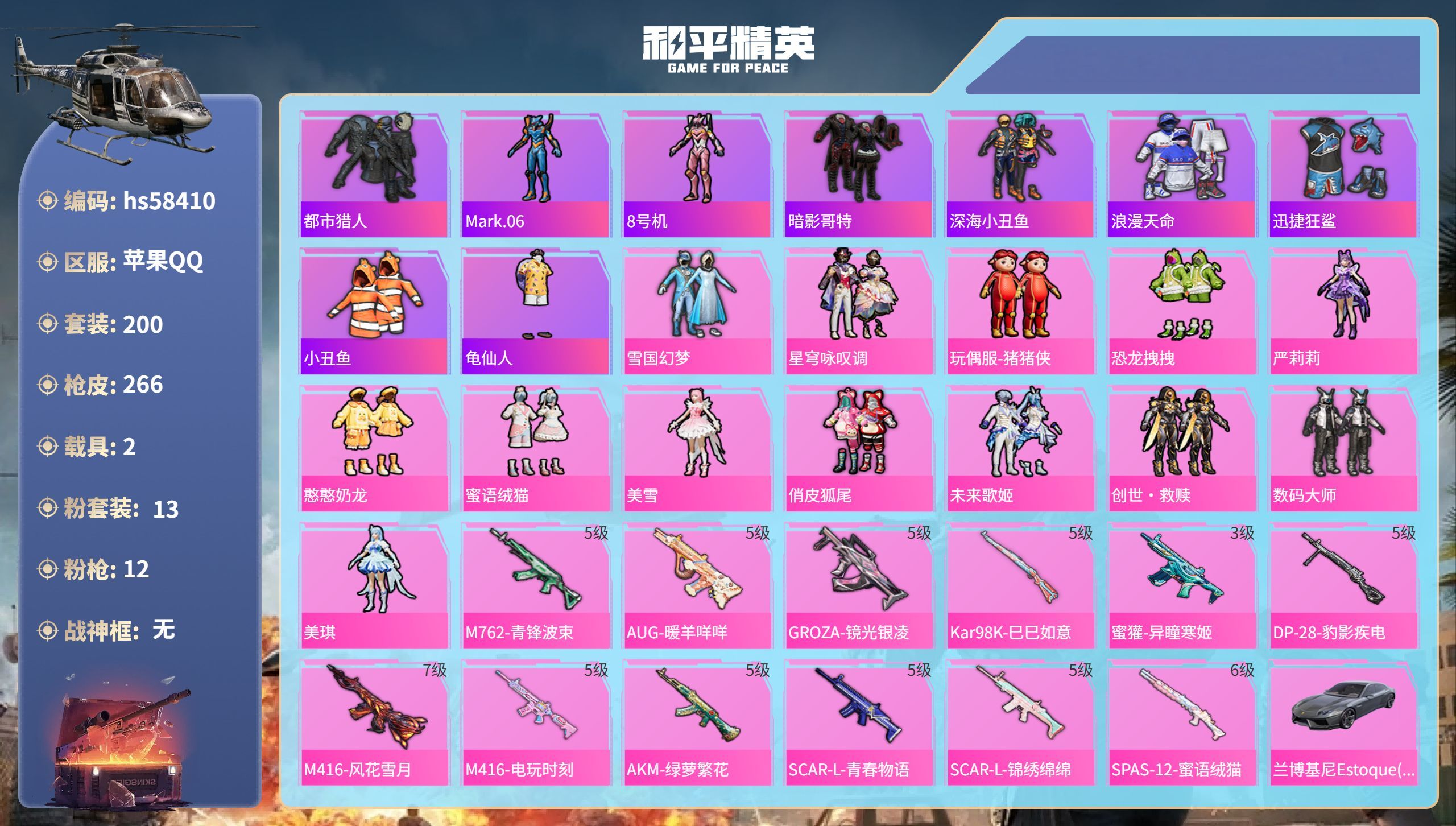 hs58410 苹果手Q-13王牌印记-13粉装-12特效枪-2载具-84777热力值-200套装-