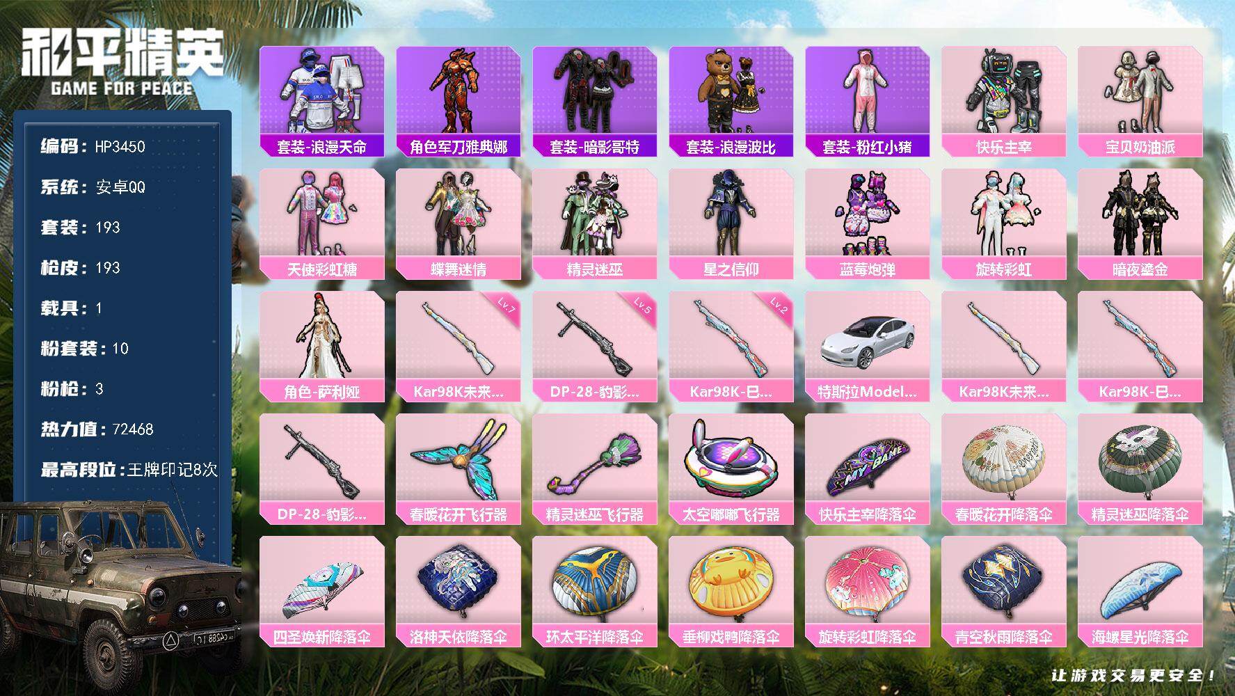 安卓 手Q-10粉装-3特效枪-1载具-4粉色飞行器-72468热力值-8王牌
