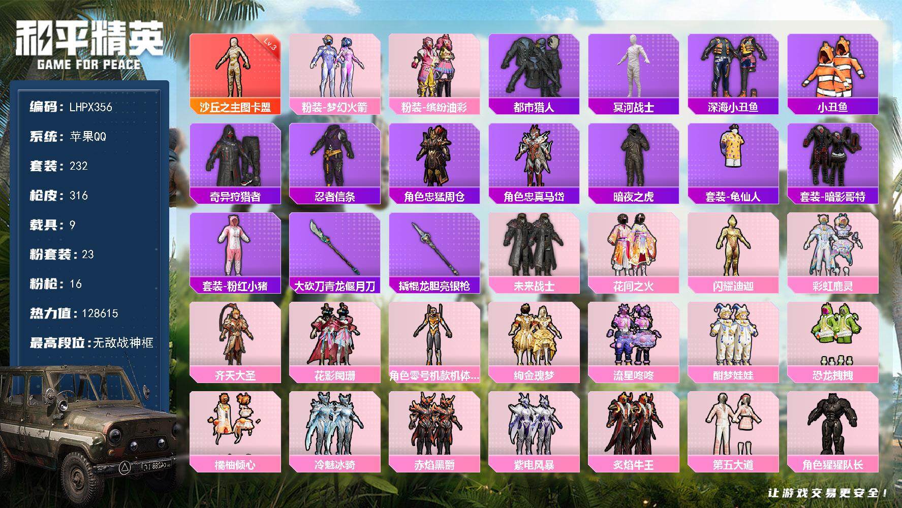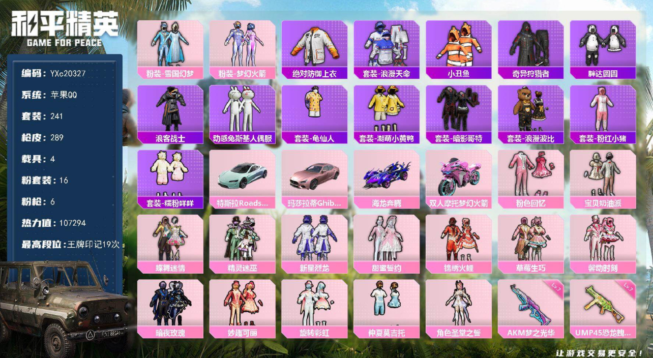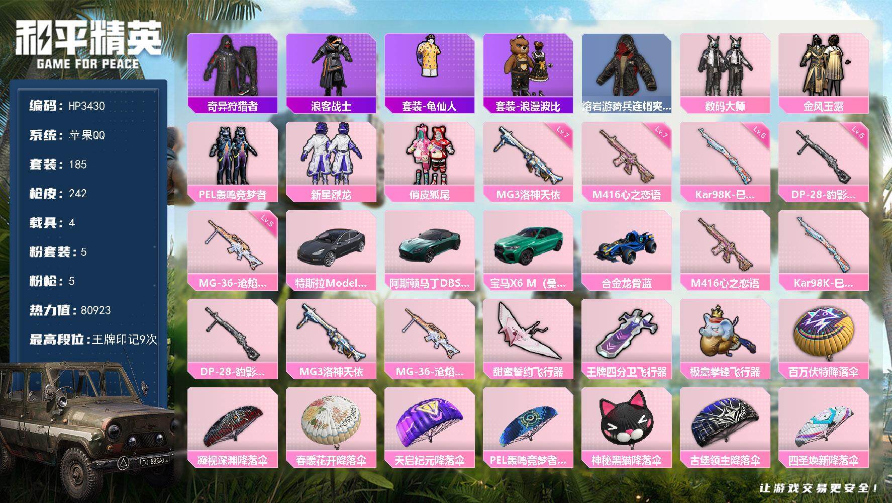 苹果 手Q-5粉装-5特效枪-4载具-4粉色飞行器-80923热力值-9王牌印
