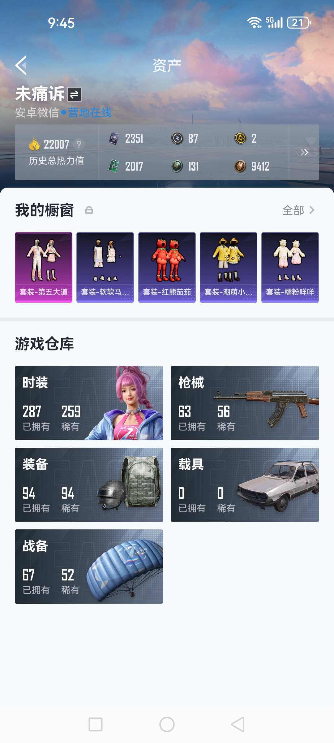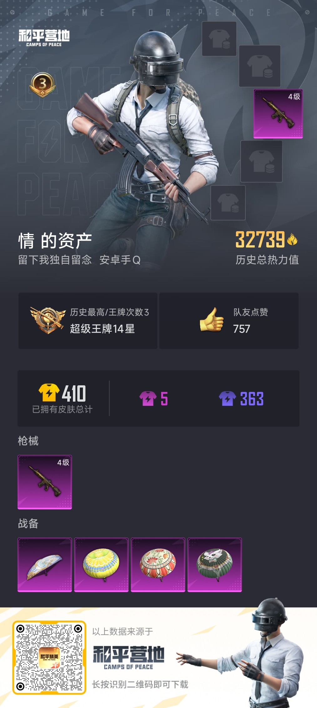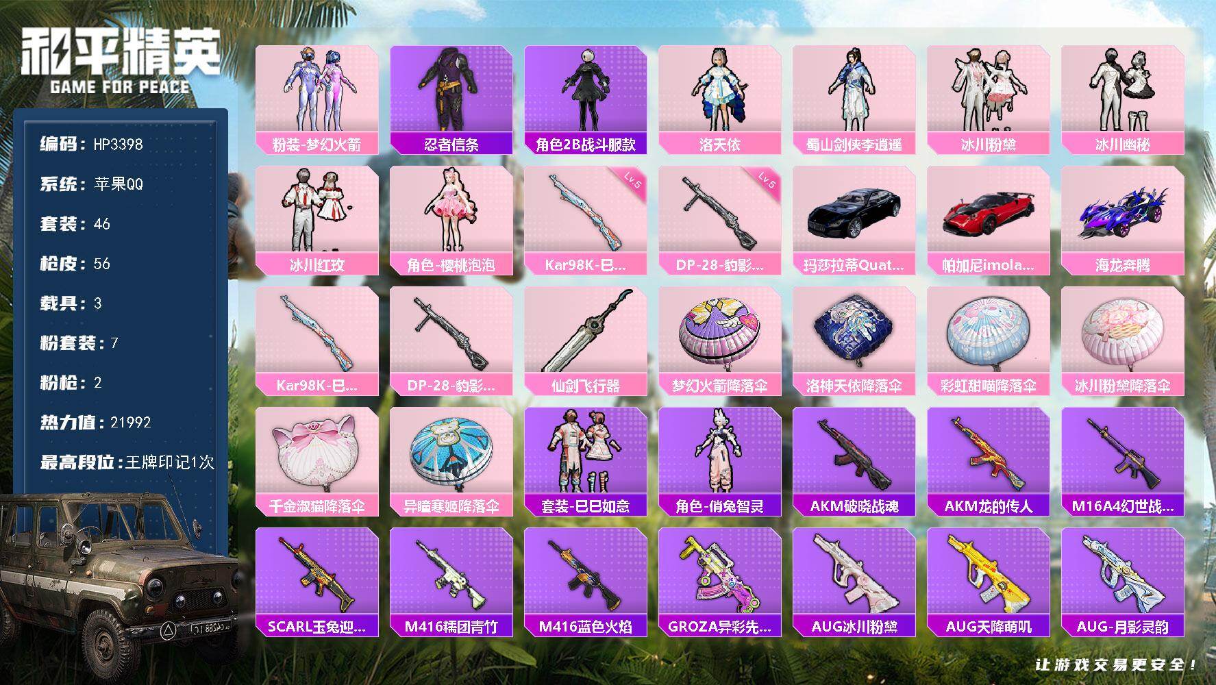 安卓 手Q-2粉装-2特效枪-3载具-1粉色飞行器-46883热力值-1王牌印